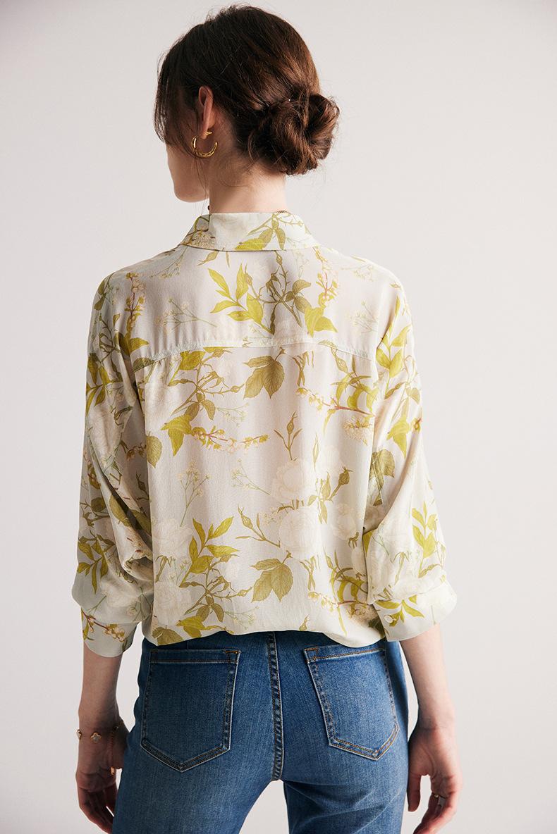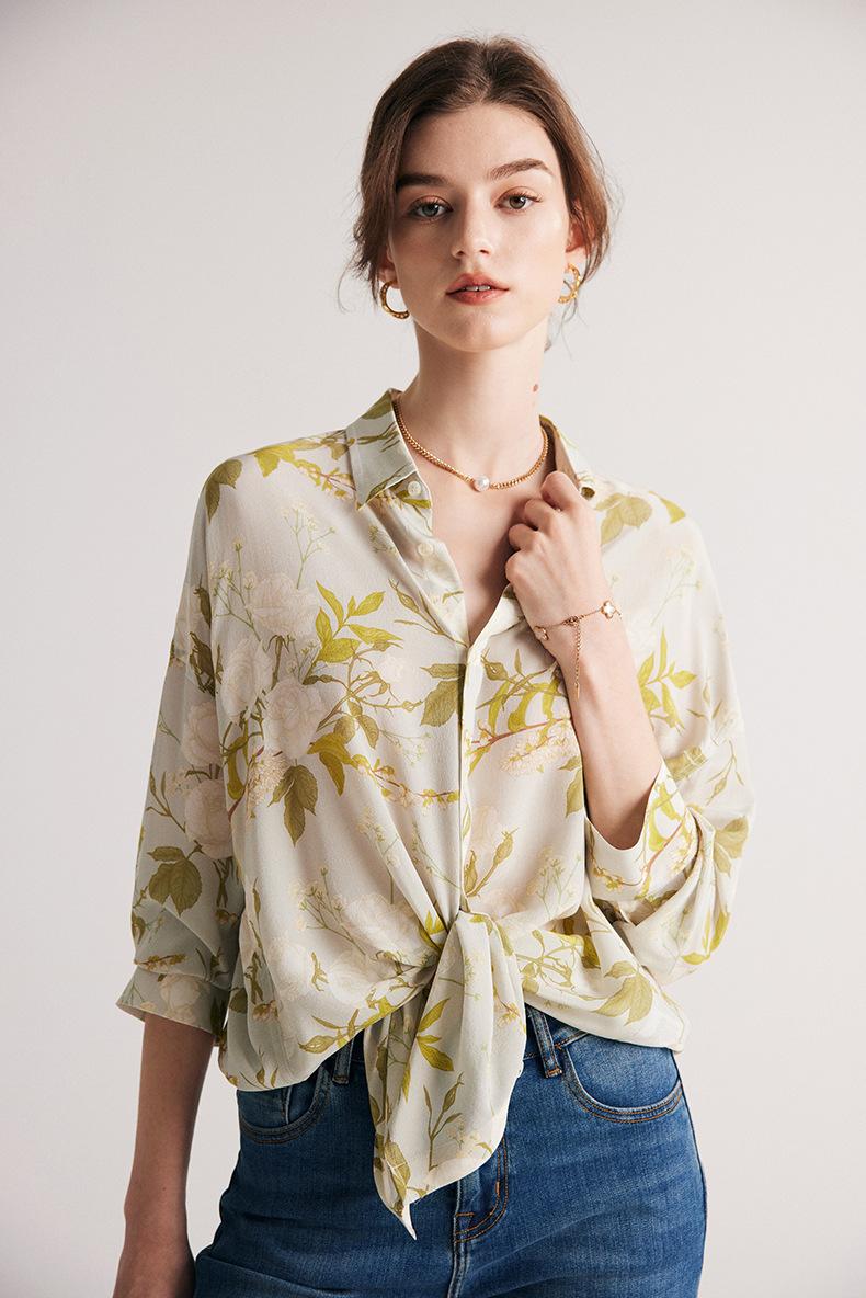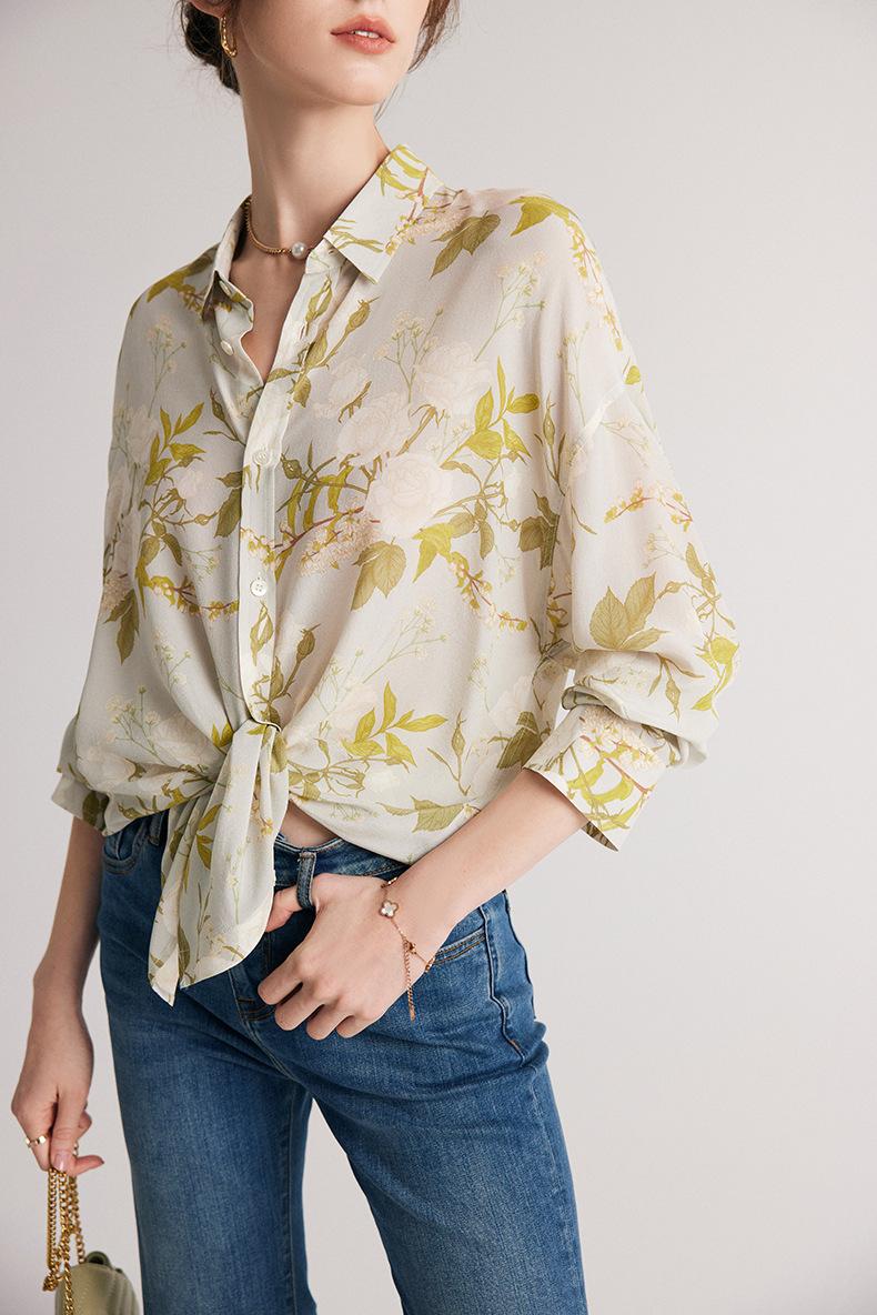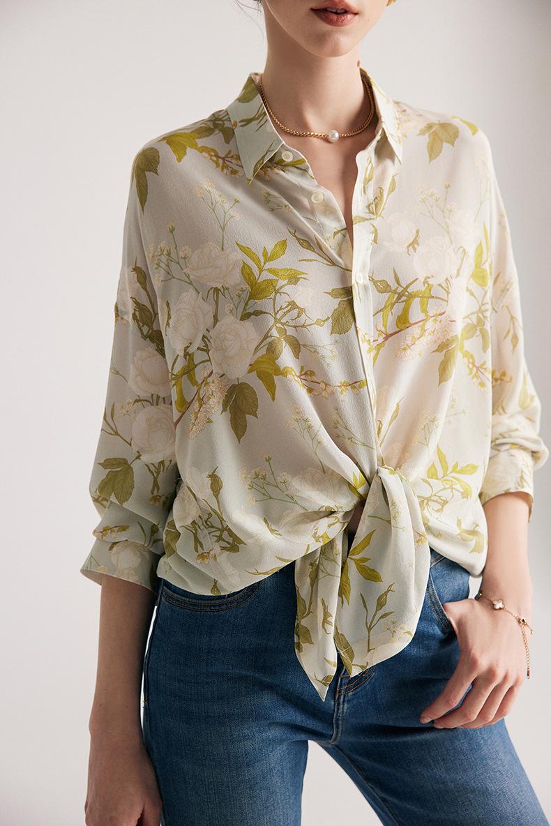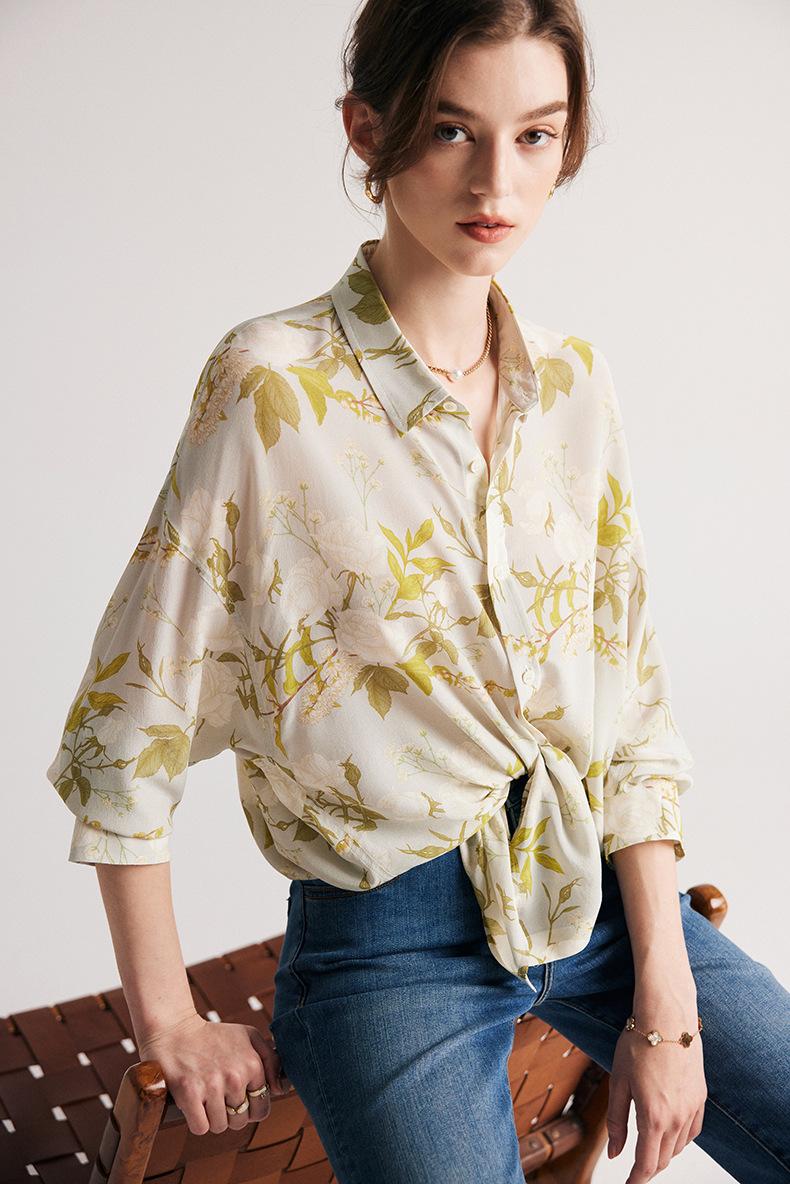 Camisa de Seda para Mujer 2025 Primavera y Verano Nueva Crepé de China Estampado Floral Manga Larga Holgada Manga Murciélago Camisa de Seda de Morera