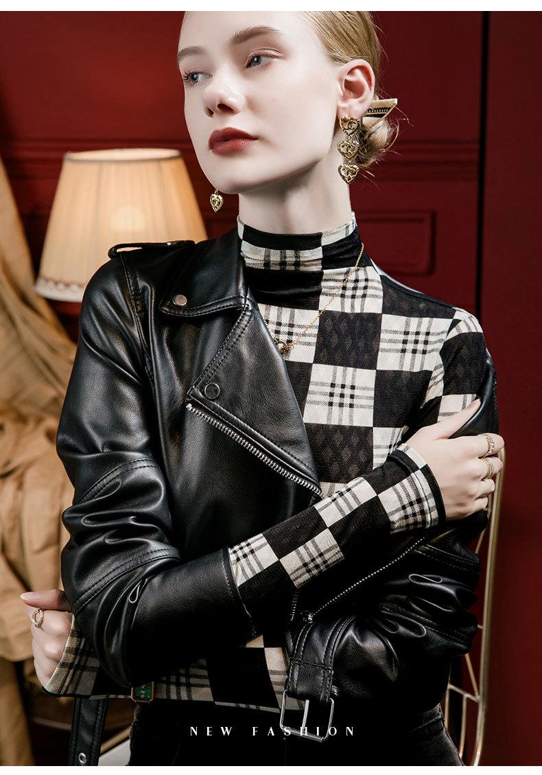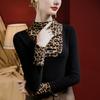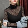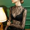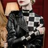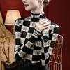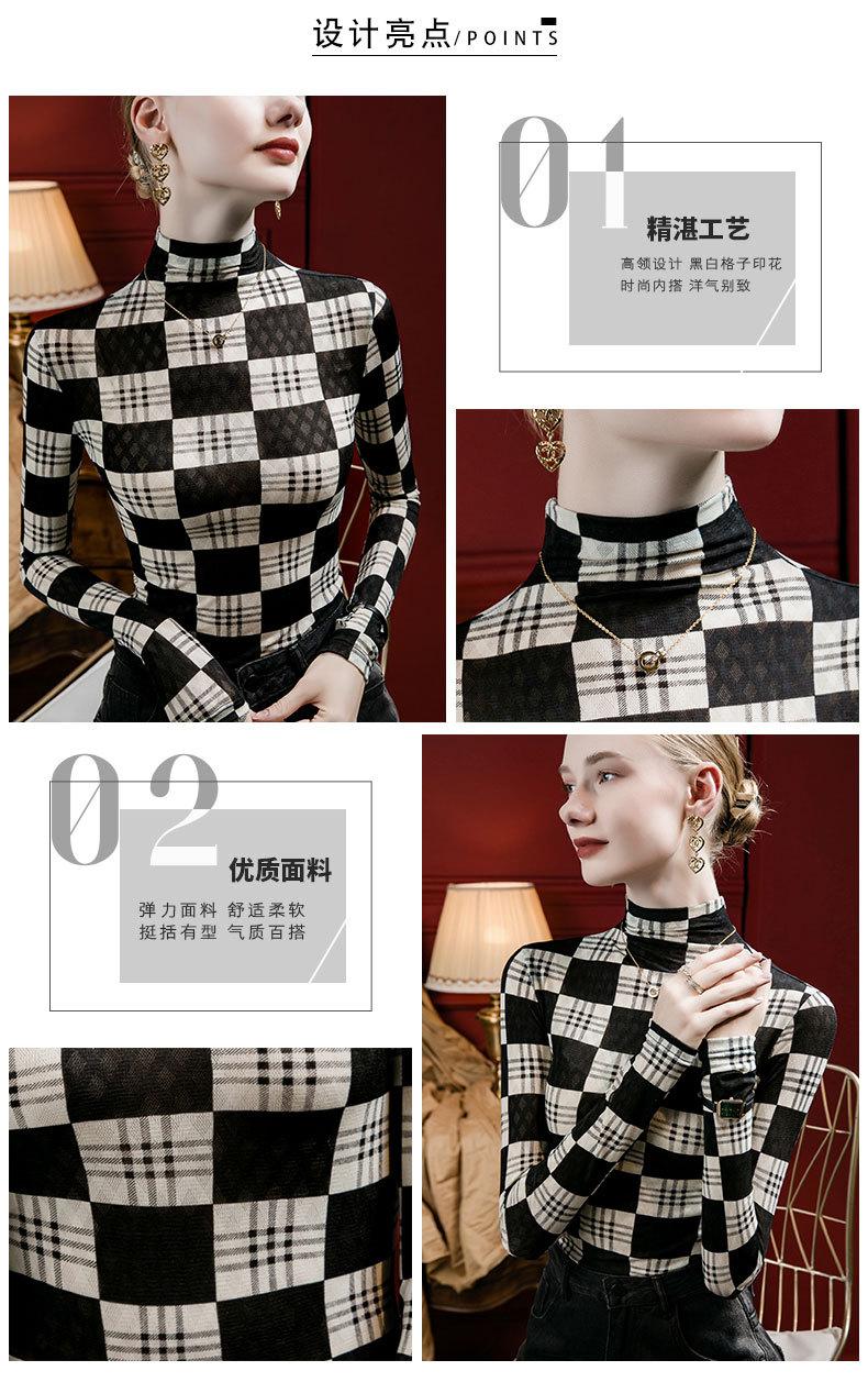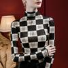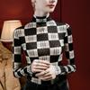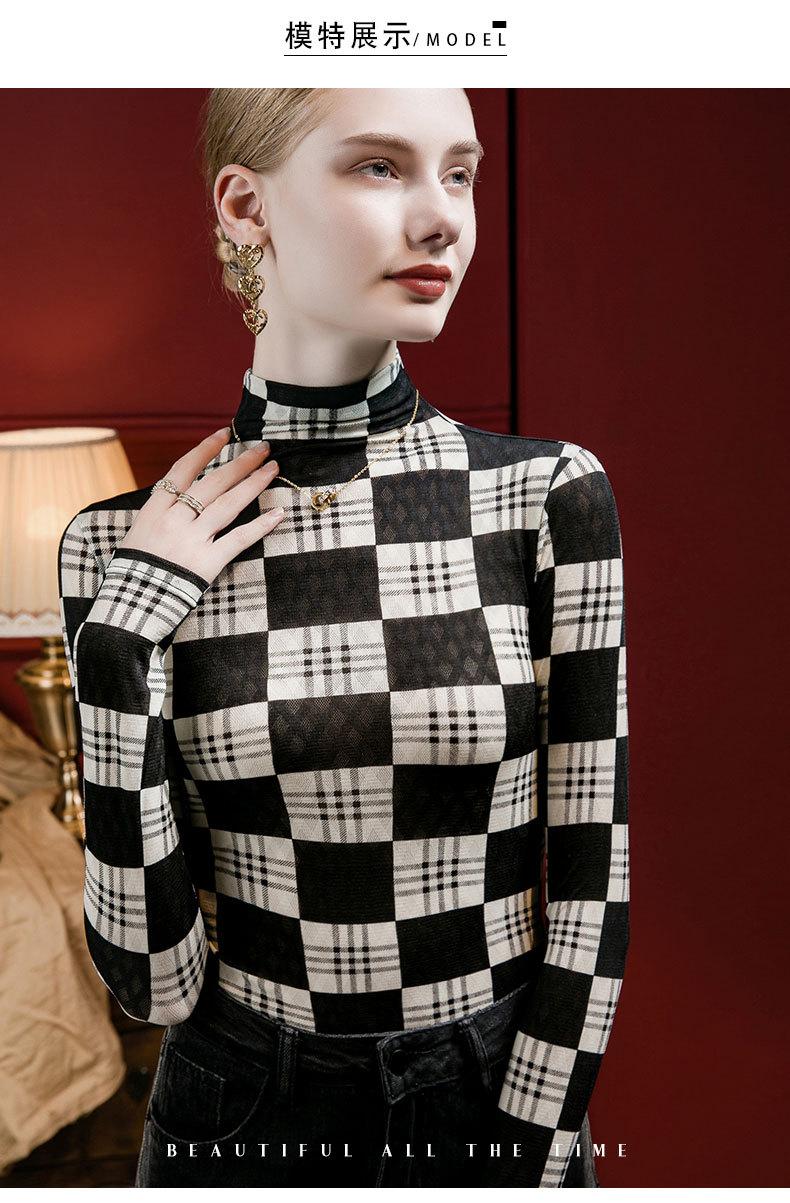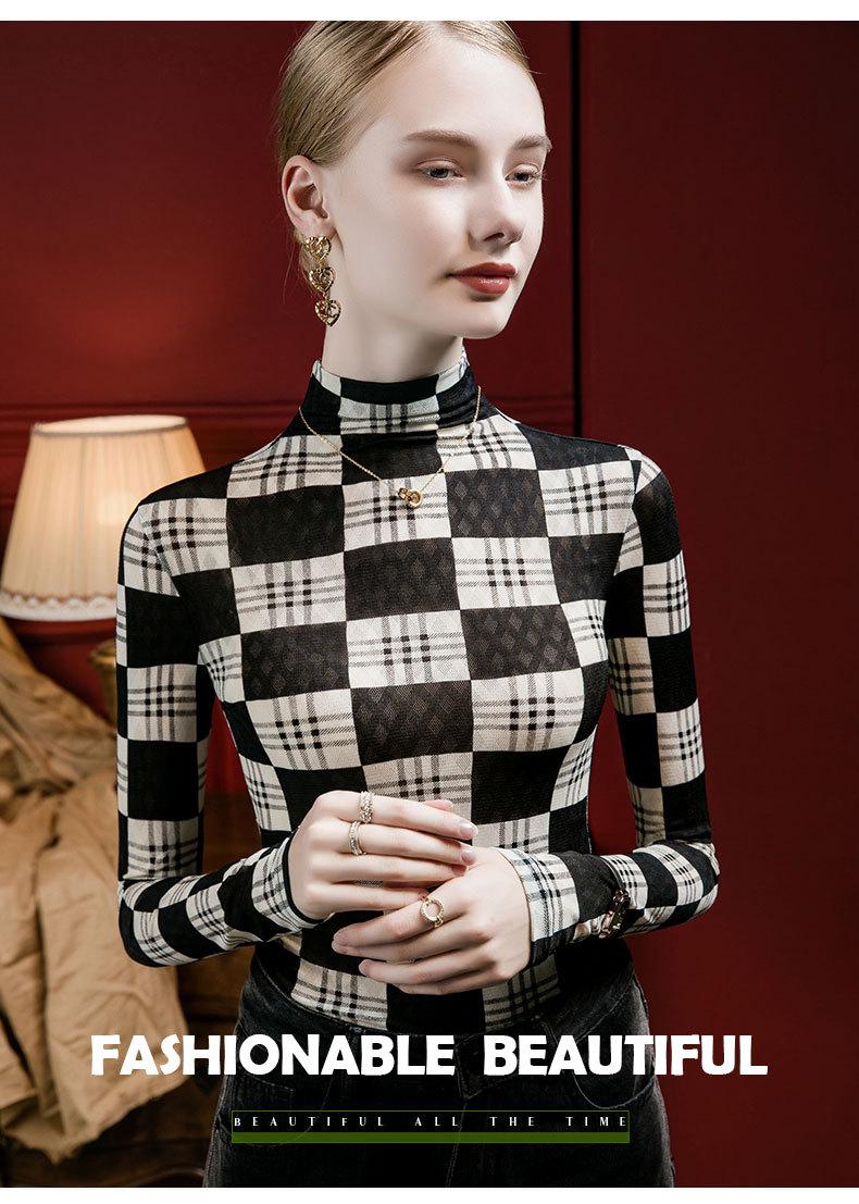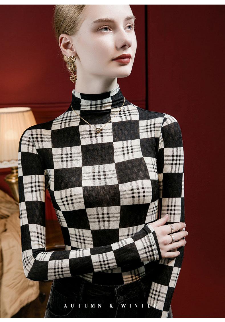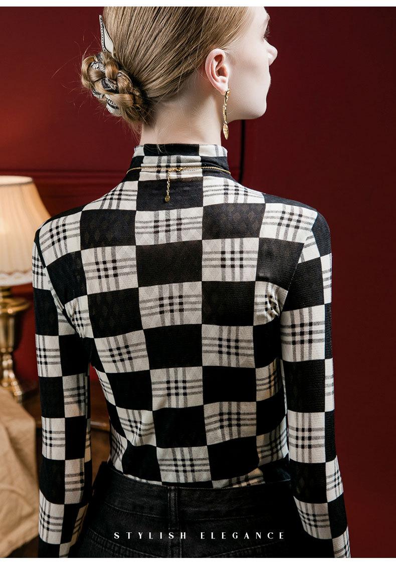 Camisa de mujer con cuello alto y estampado a cuadros de encaje en la parte inferior, corte entallado, estilo occidental, otoño 2023, nuevo estilo, ropa interior de otoño e invierno, top de manga larga