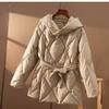 Chaqueta cruzada con capucha y cuello unido al cuerpo.