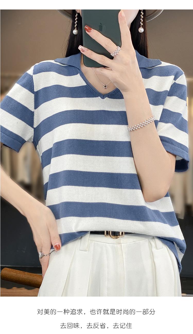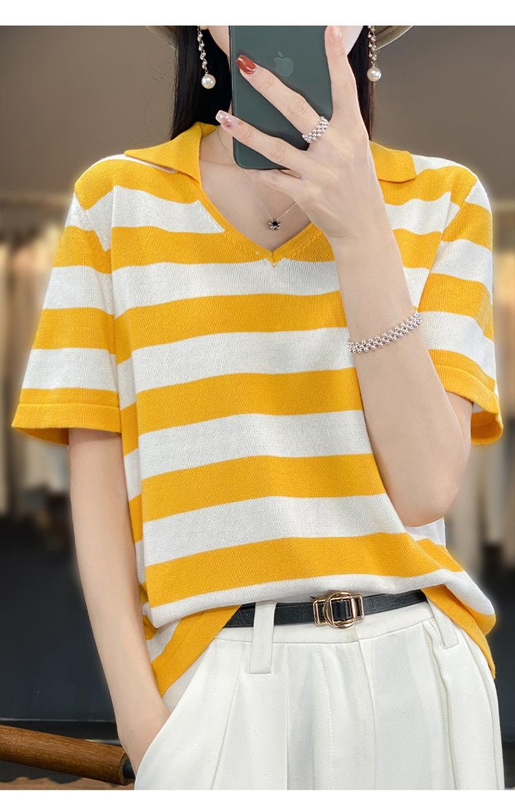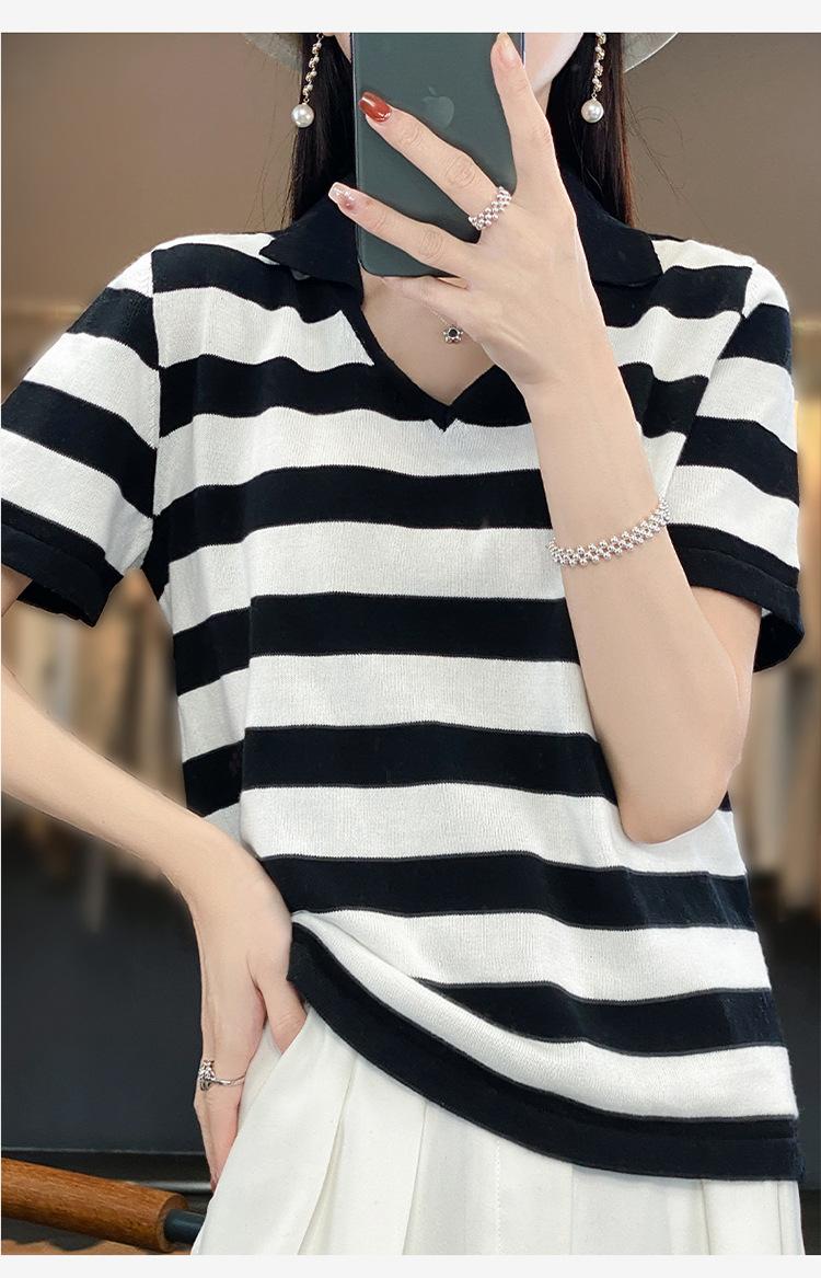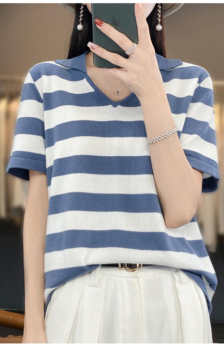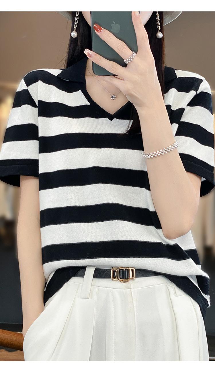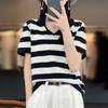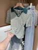 Polo de Algodón Cuello Rayado Manga Corta Solapa Manga Media 2024 Verano Nuevo Estilo Coreano Camiseta Holgada Top de Mujer