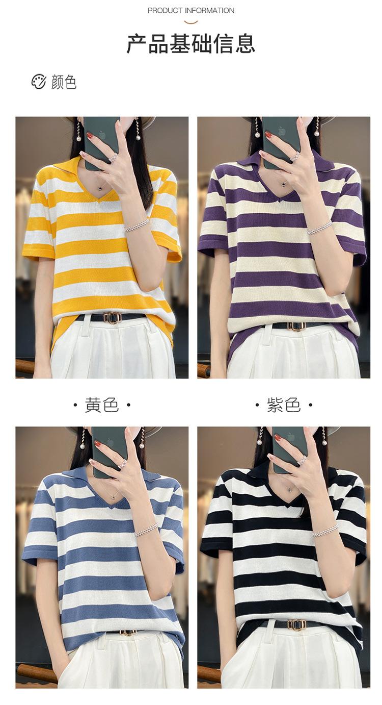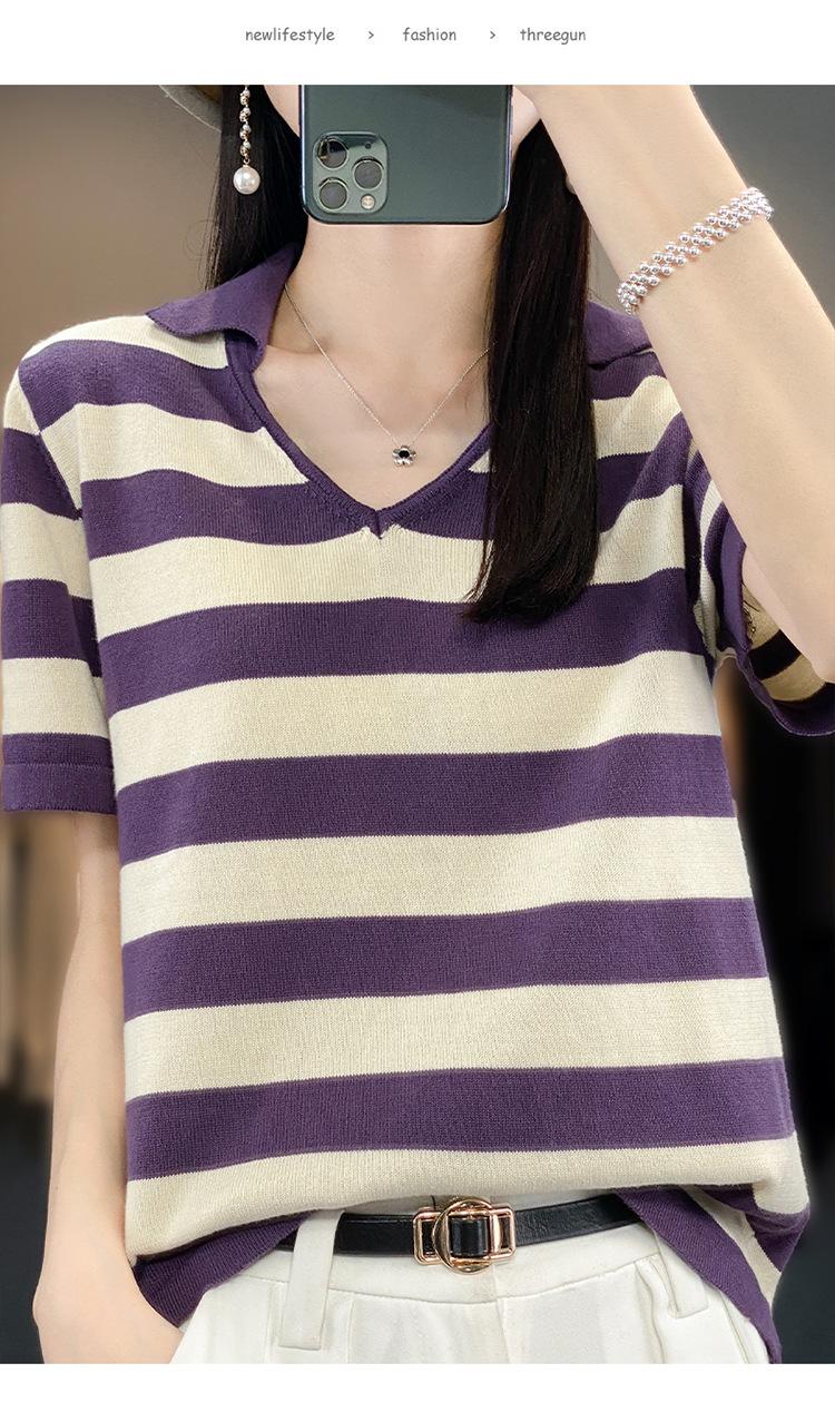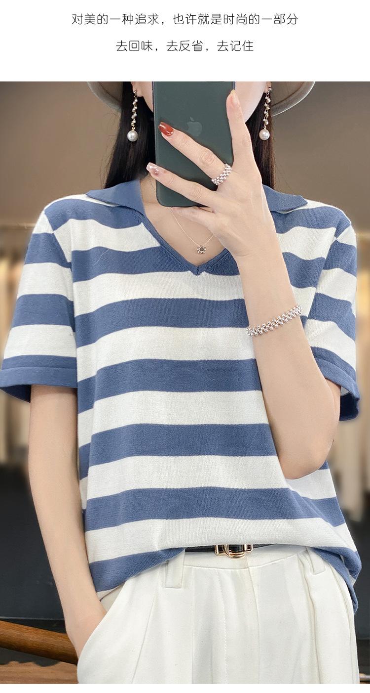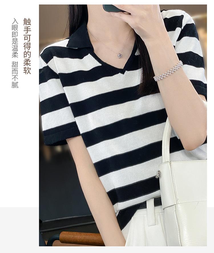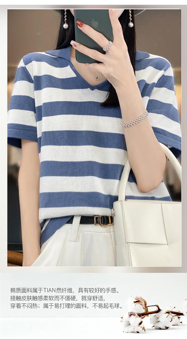 Polo de Algodón Cuello Rayado Manga Corta Solapa Manga Media 2024 Verano Nuevo Estilo Coreano Camiseta Holgada Top de Mujer