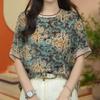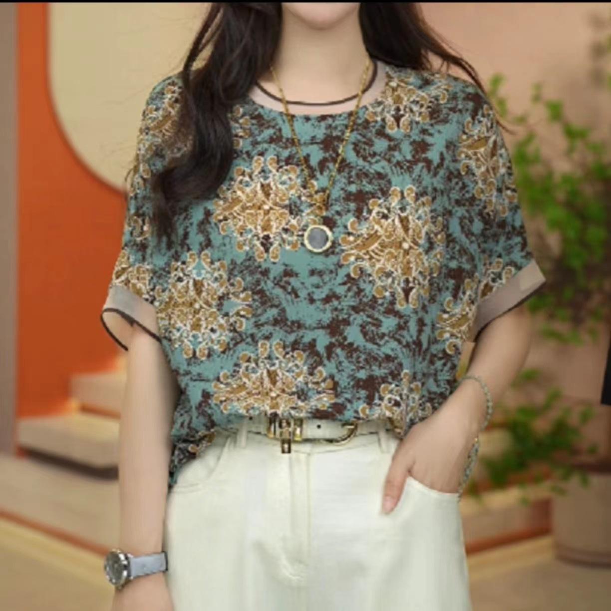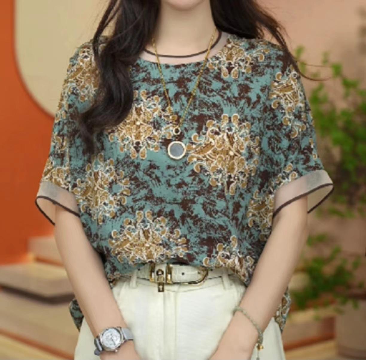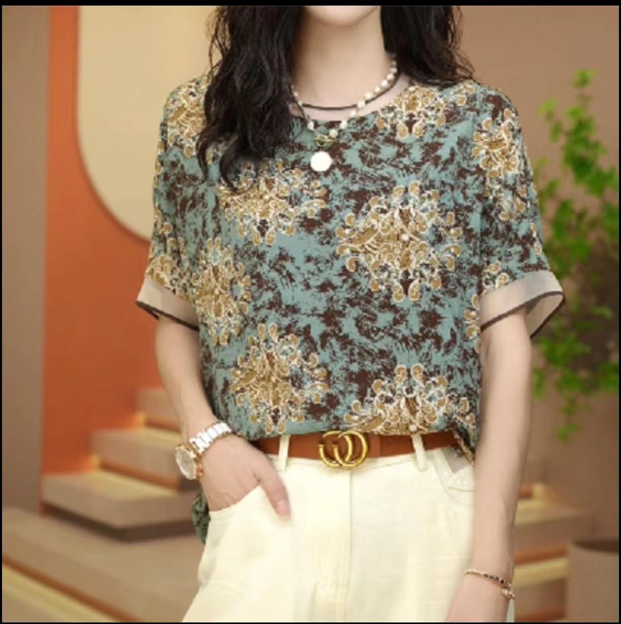 Camiseta ligera de moda de verano 2024, combinable con todo, estilo occidental, adelgazante, reductora de edad, ligera, de lujo, elegante, estampada, de manga corta para mujer