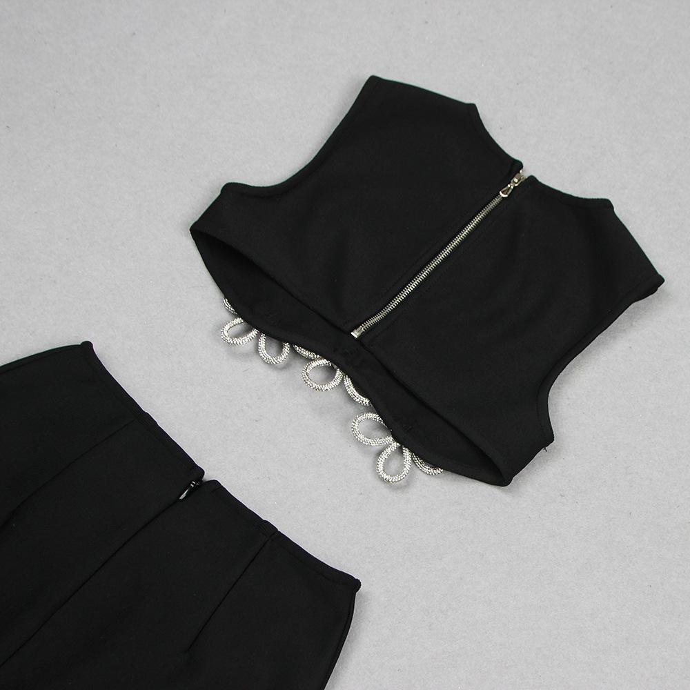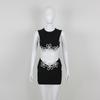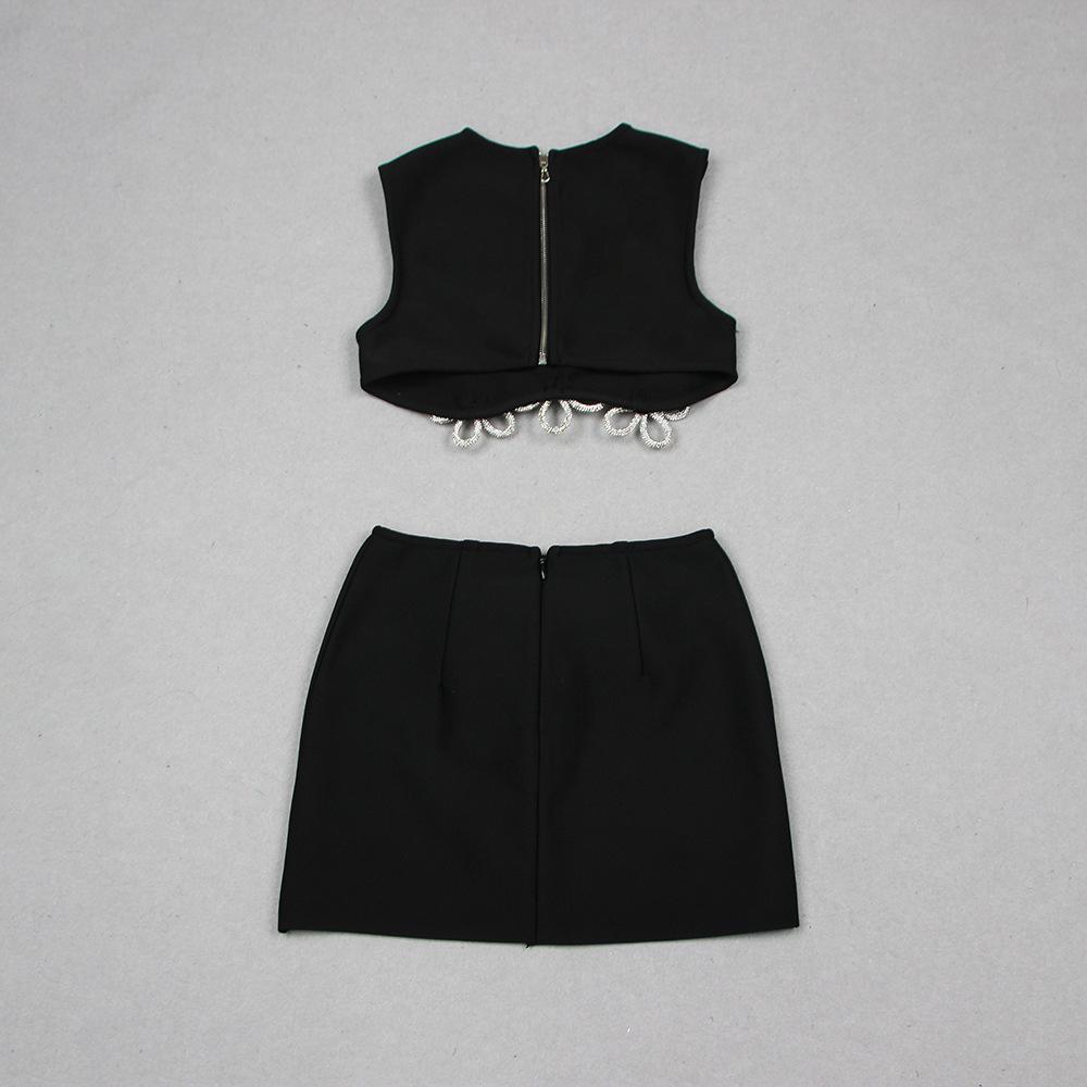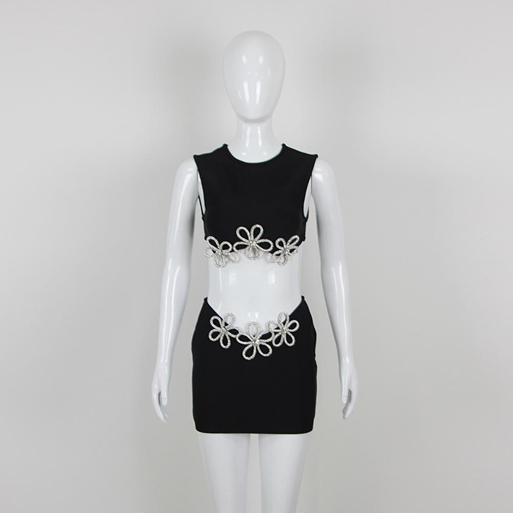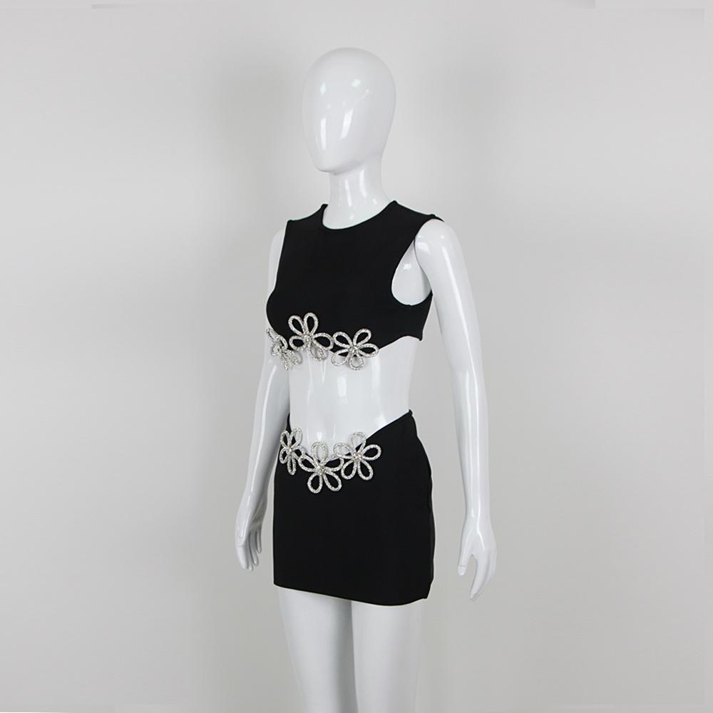 2023 otoño e invierno nueva moda sexy hueco sin mangas rhinestone top + falda corta traje vendaje mujer comercio exterior