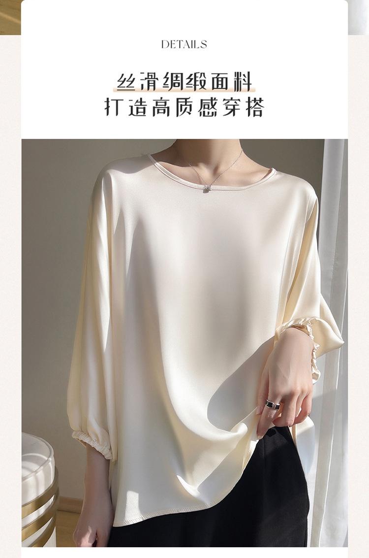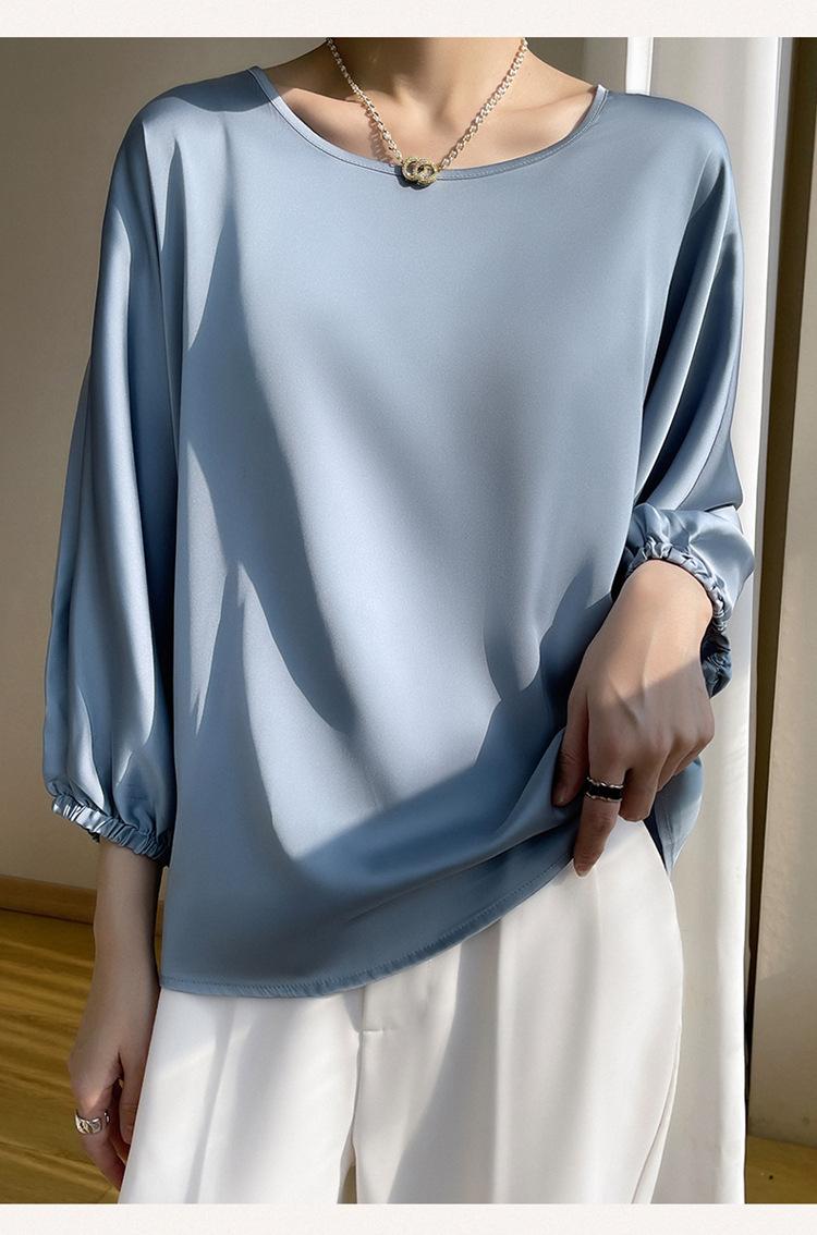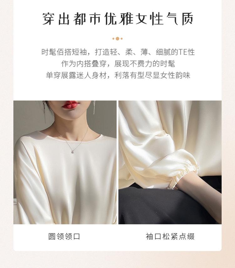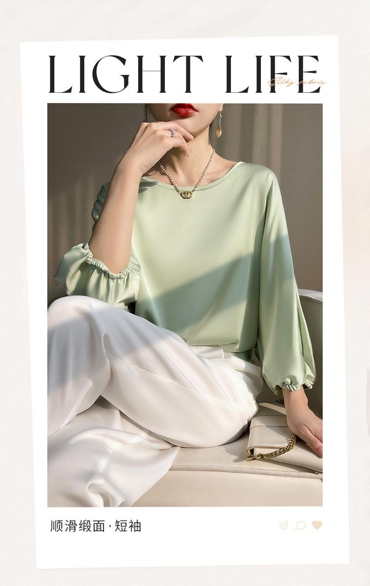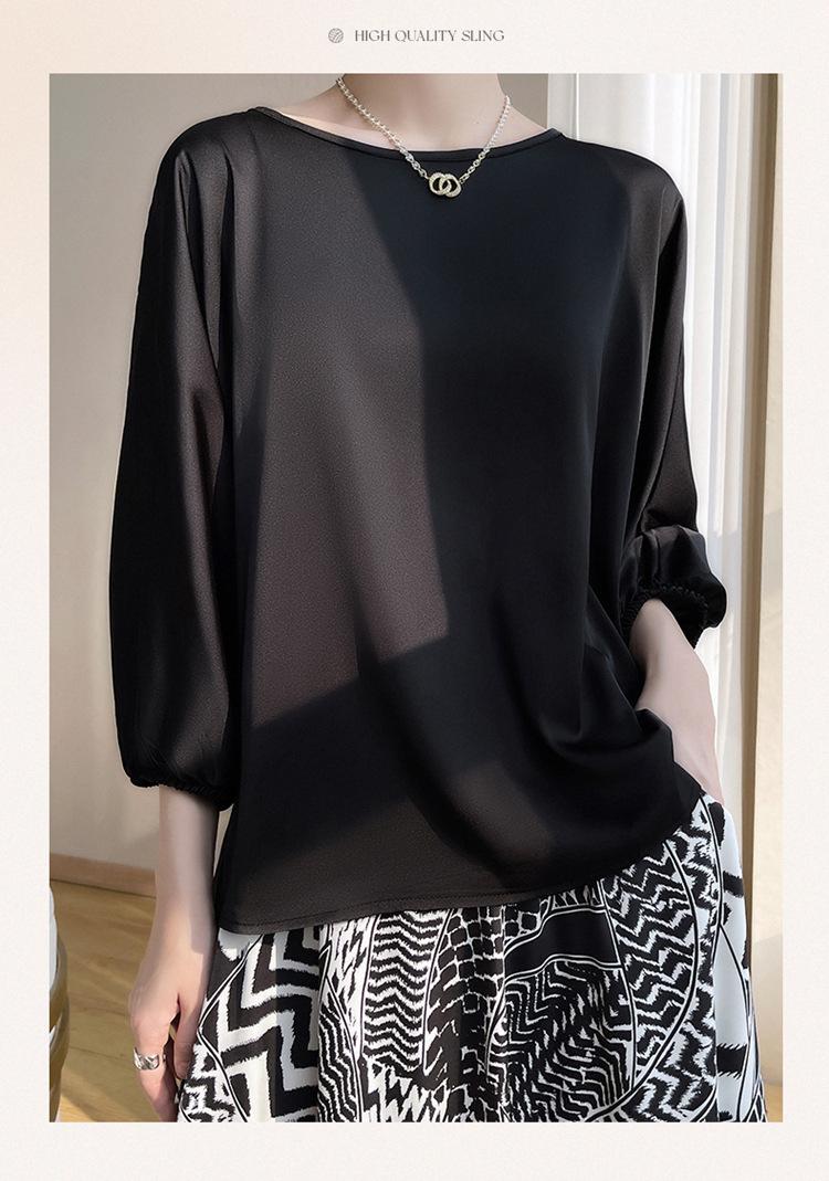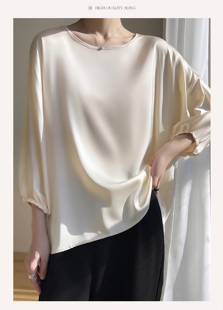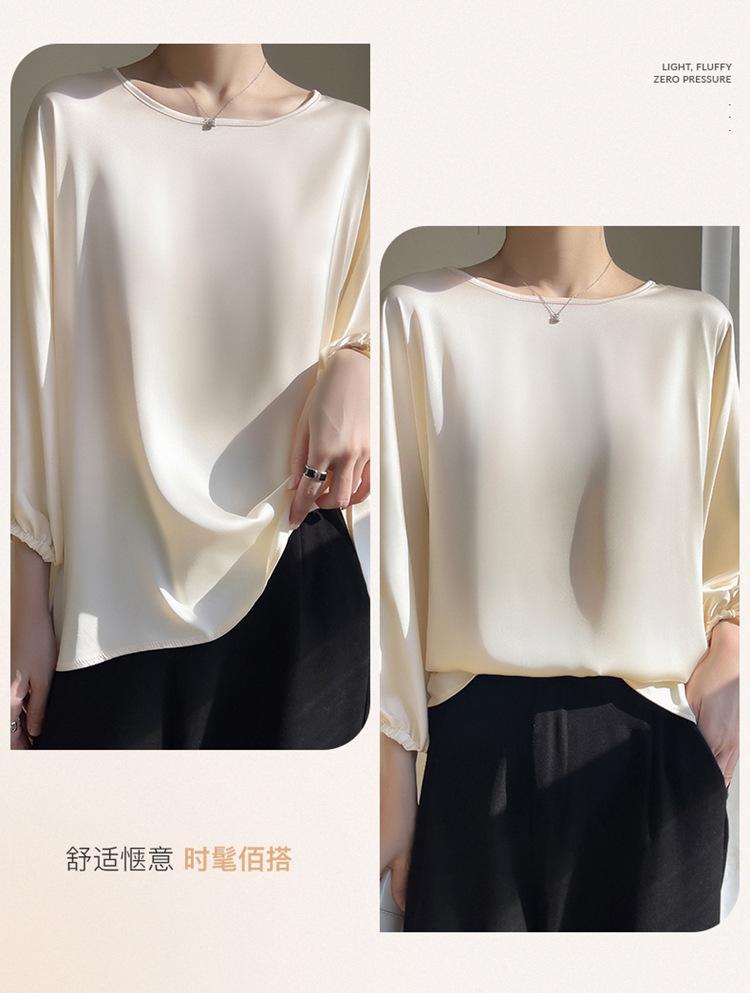 Camiseta de Cuello Redondo y Manga Siete para Verano Nueva Llegada Holgada Satén de Seda Drapeada Delgada Transpirable Talla Grande Camiseta de Media Manga para Mujer
