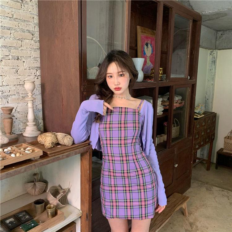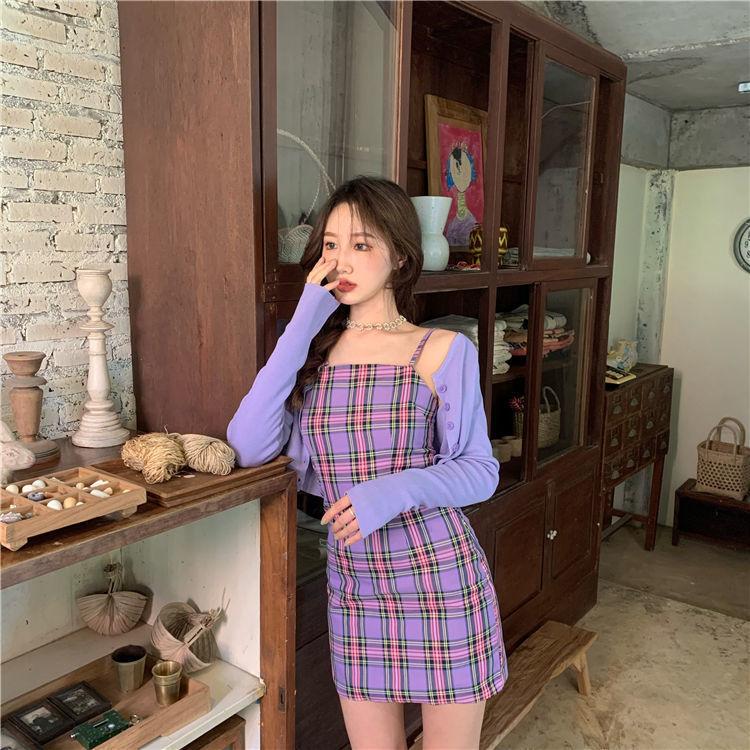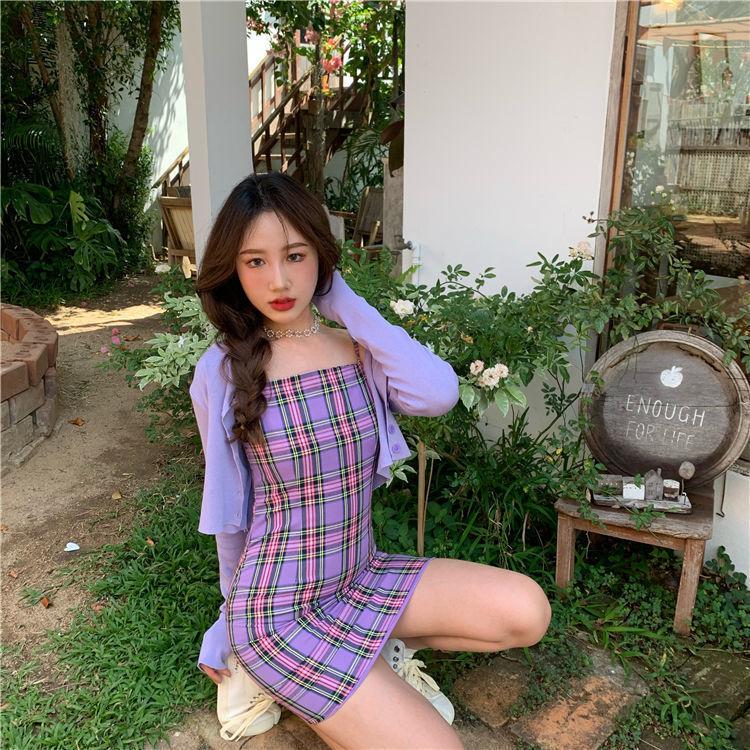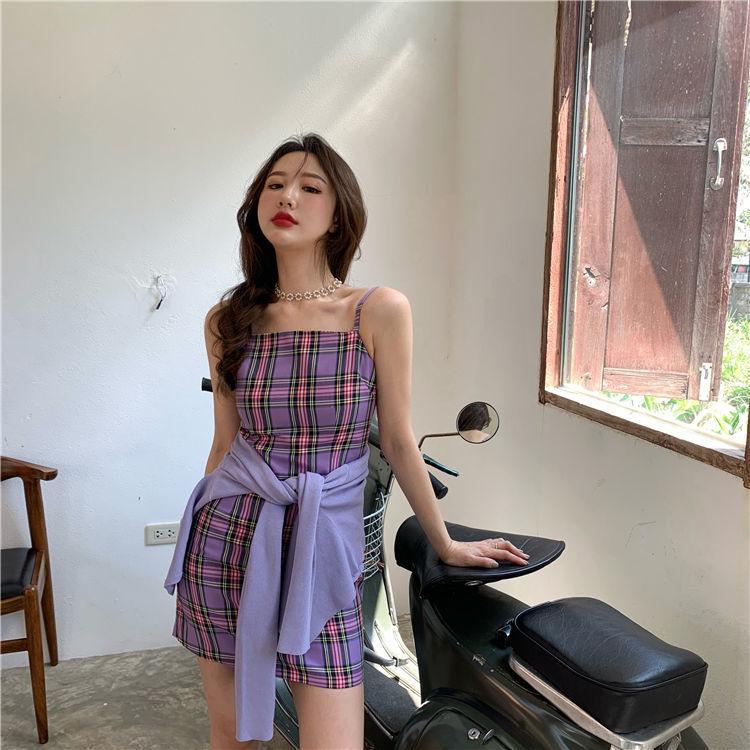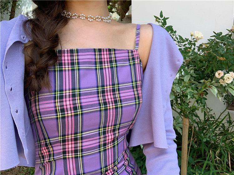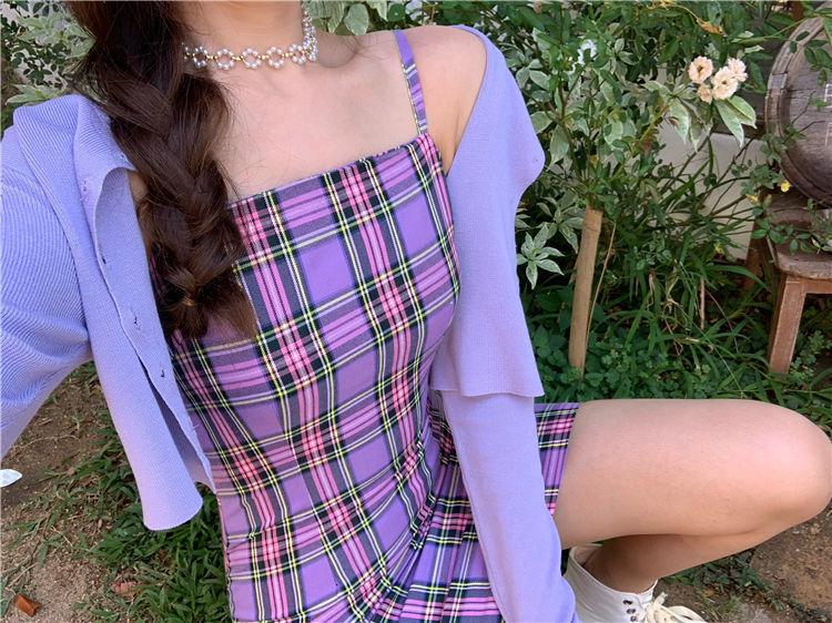 Vestido a cuadros morado para mujer, novedad primavera 2021, falda retro ajustada con tirantes y cintura alta, falda elegante de corte A en la cadera.