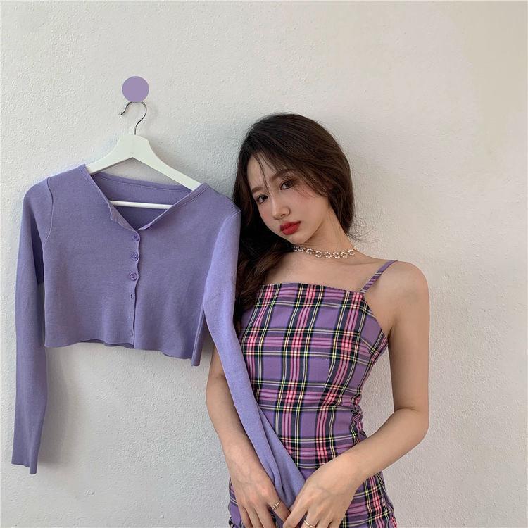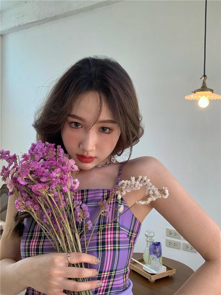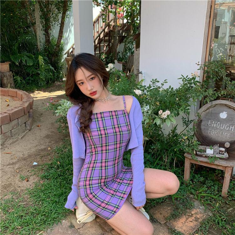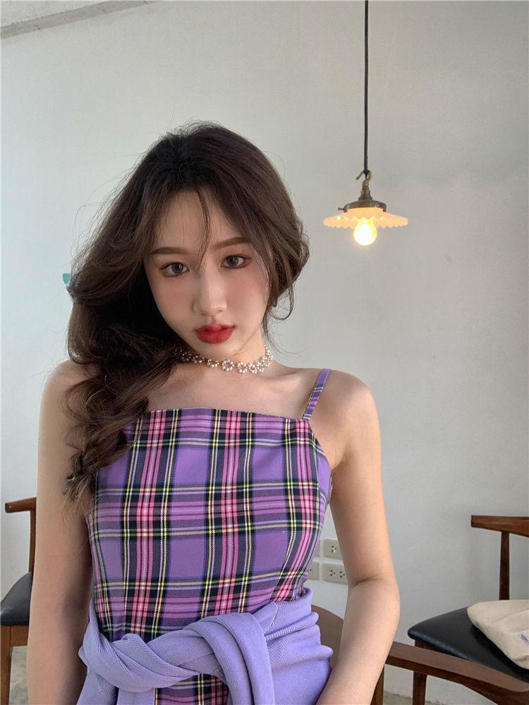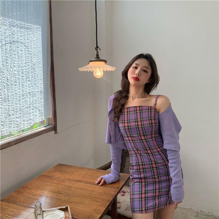 Vestido a cuadros morado para mujer, novedad primavera 2021, falda retro ajustada con tirantes y cintura alta, falda elegante de corte A en la cadera.