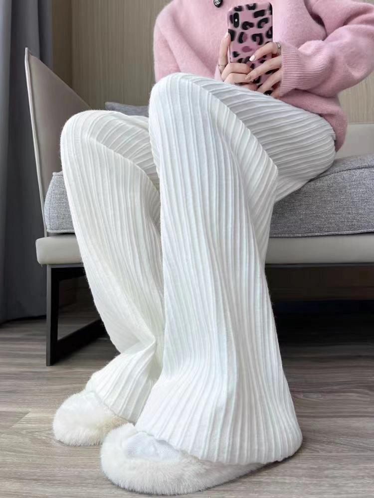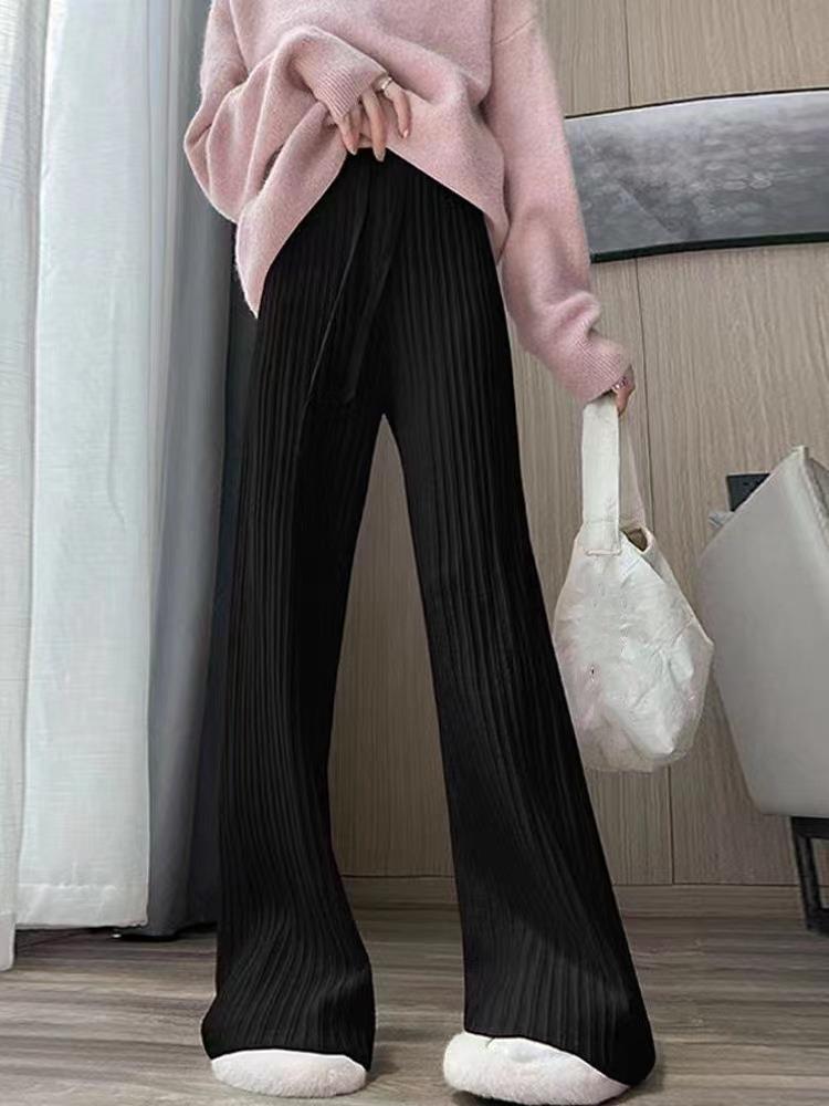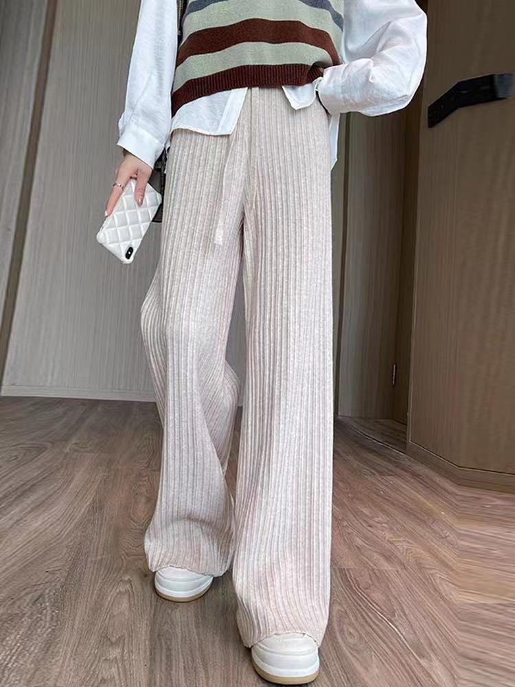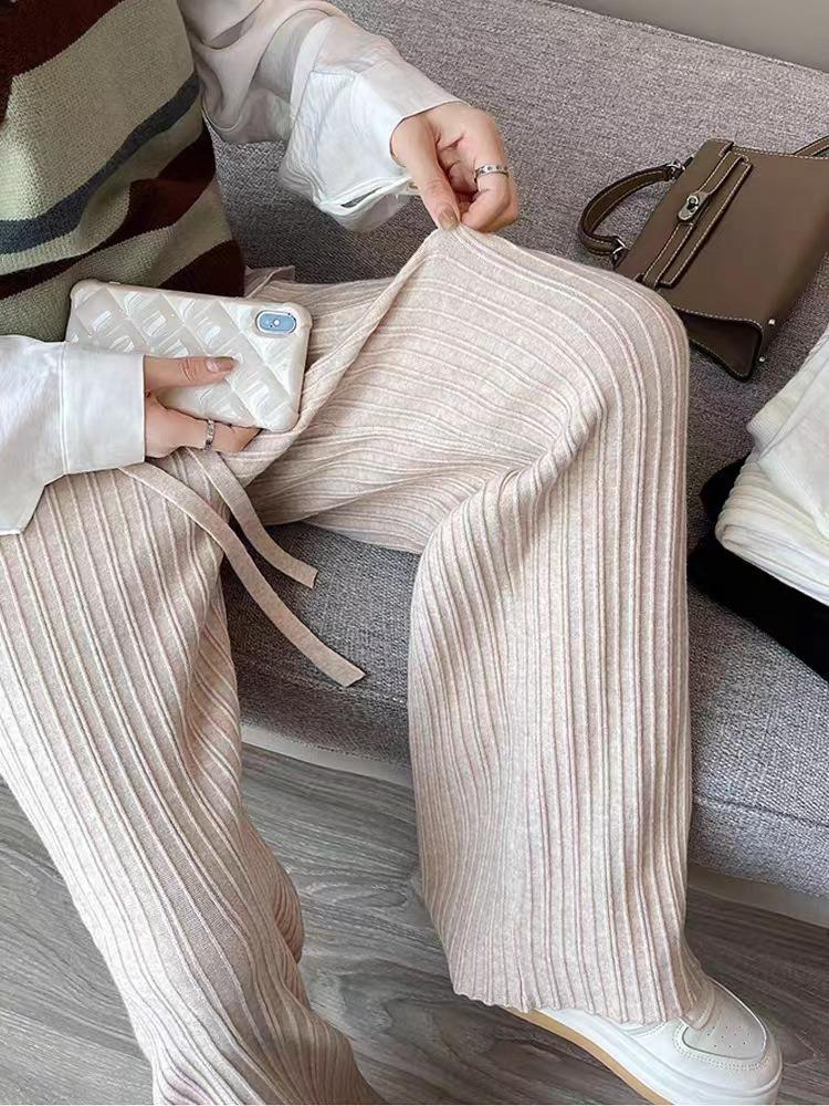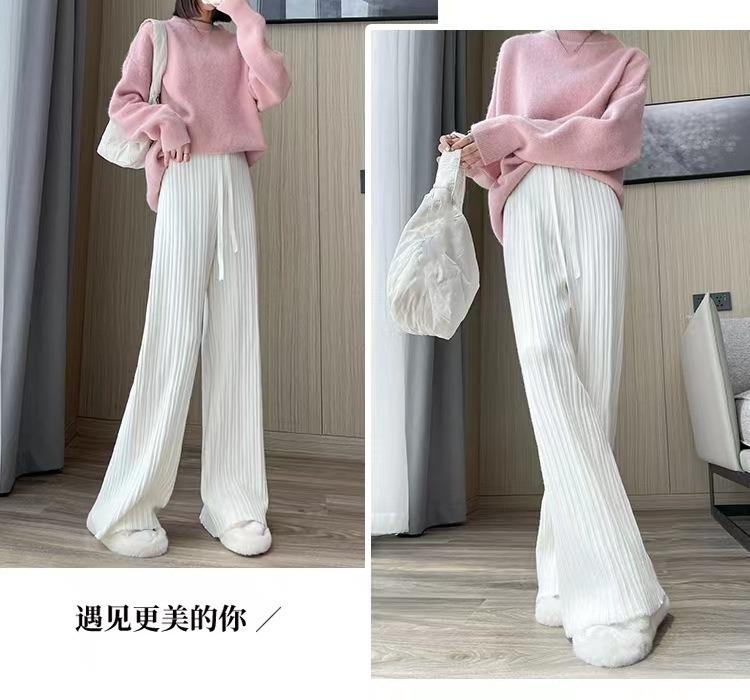 Otoño e Invierno textura tejida pantalones de pierna ancha para mujer con cordón cintura alta adelgazantes drapeados adelgazantes sueltos casuales pantalones de barrido