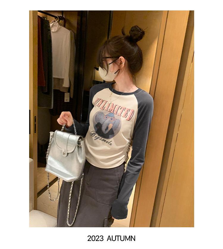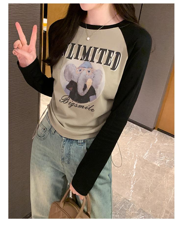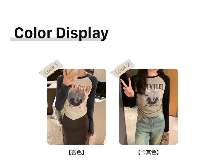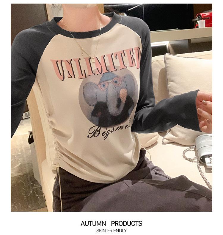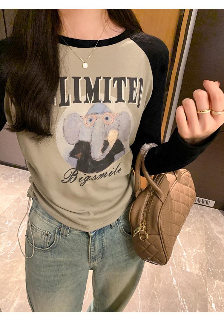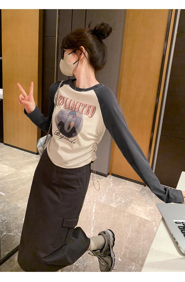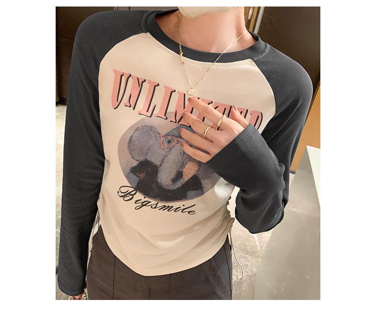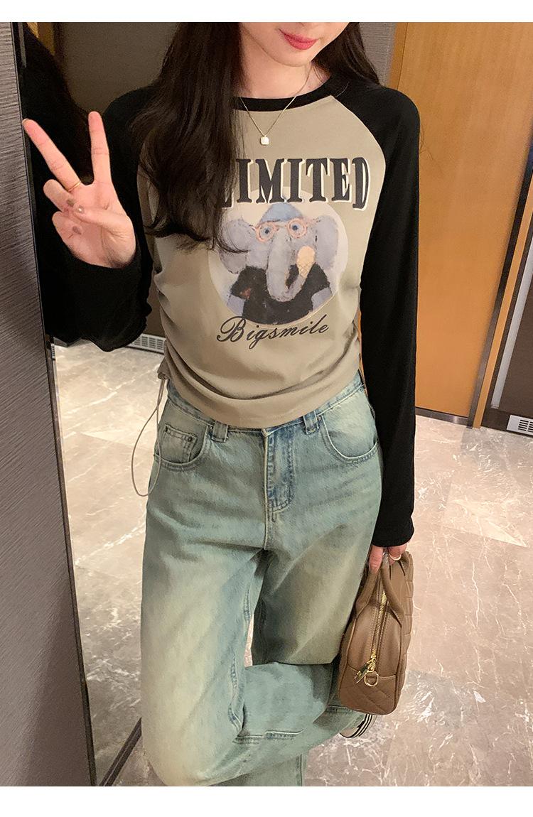Camiseta de Manga Larga Raglán de Color Contrastante Estilo Coreano con Dibujos Animados para Mujer 2025 Nuevo Otoño e Invierno Moda Pequeña Top Corto con Cordón