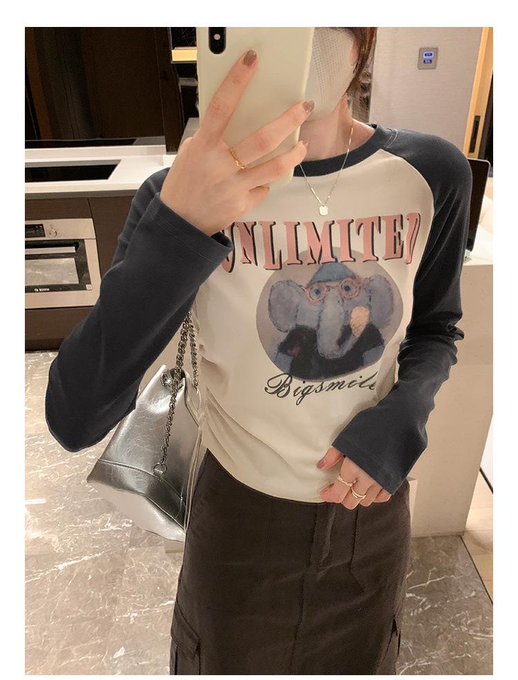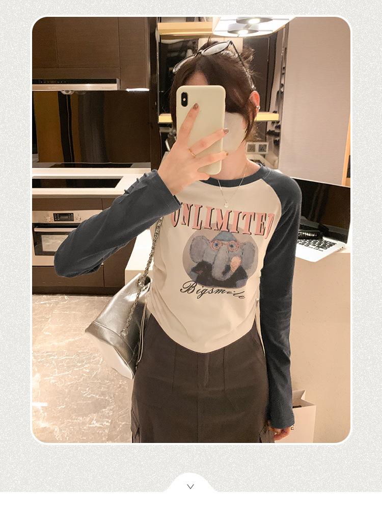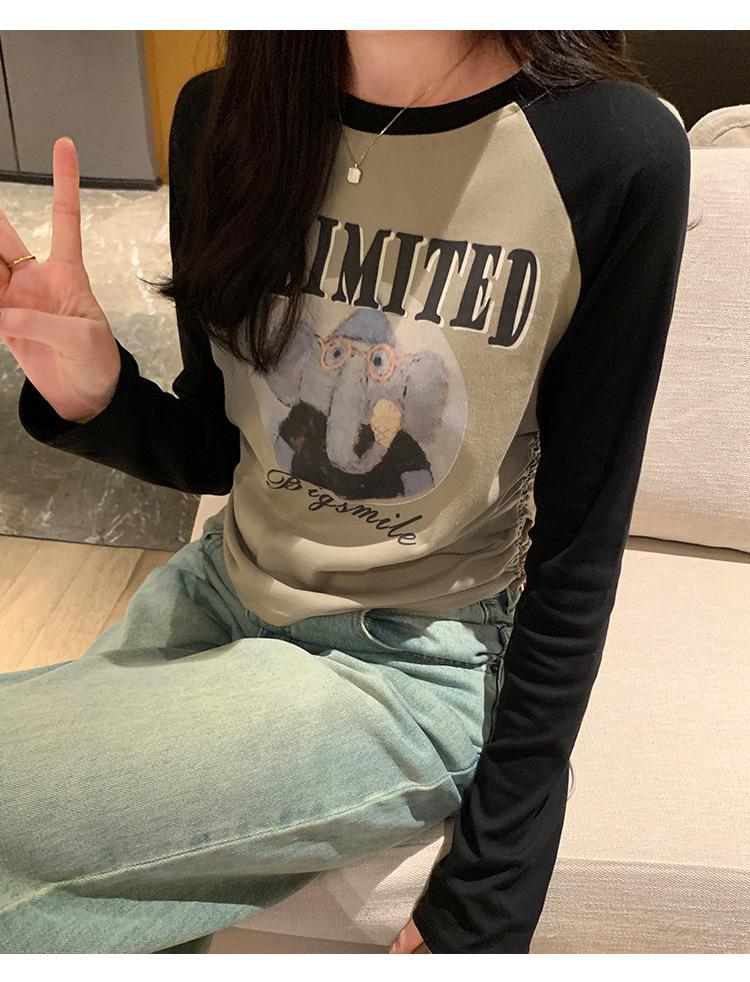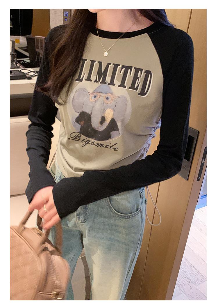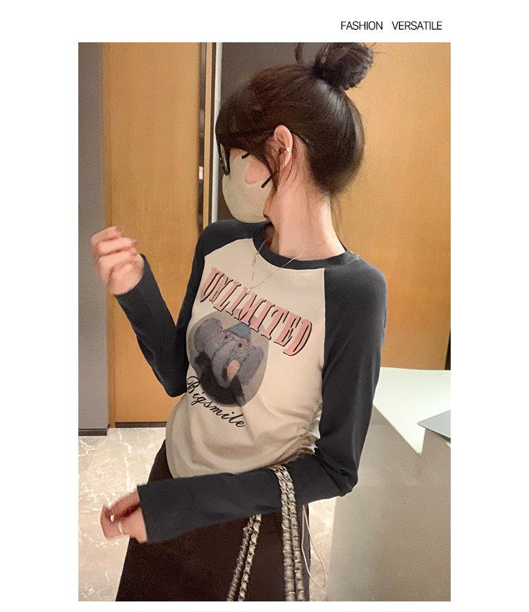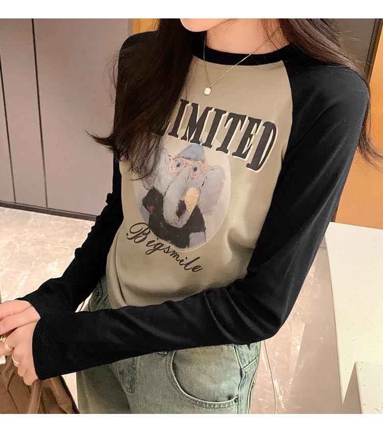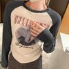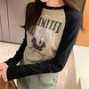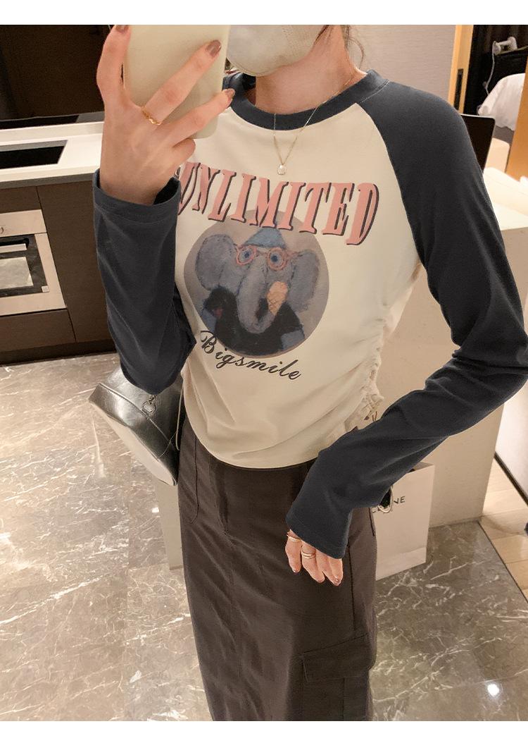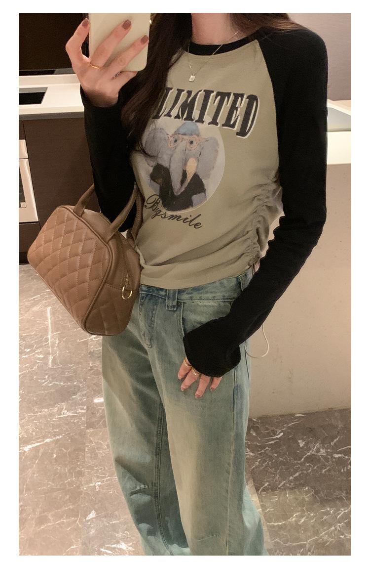 Camiseta de Manga Larga Raglán de Color Contrastante Estilo Coreano con Dibujos Animados para Mujer 2025 Nuevo Otoño e Invierno Moda Pequeña Top Corto con Cordón
