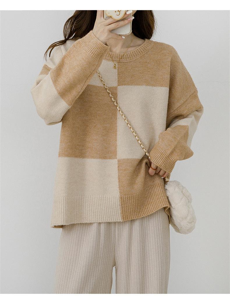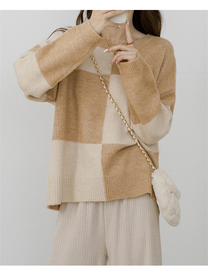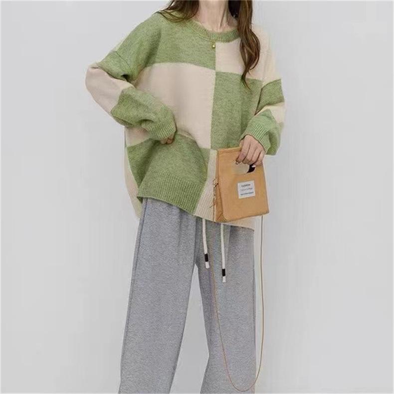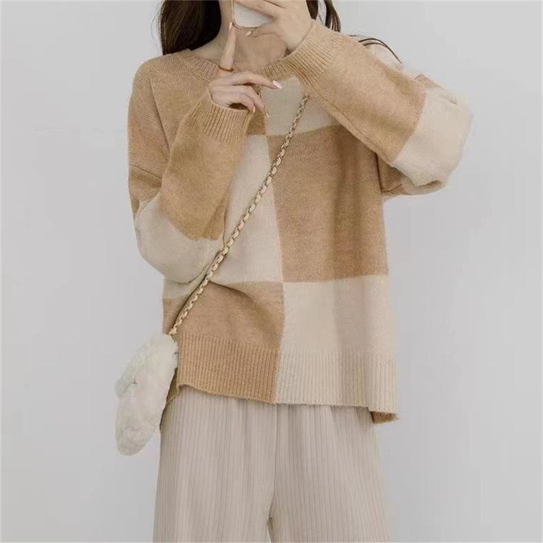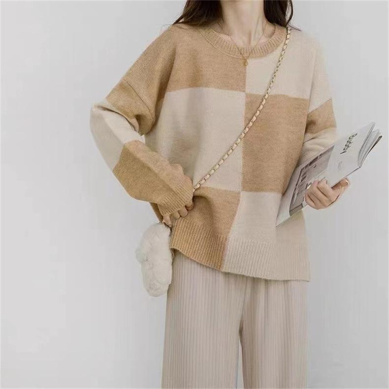 Tejido de punto a juego de colores estilo coreano para mujer otoño e invierno Nuevo suéter holgado adelgazante diseño estilo perezoso manga larga
