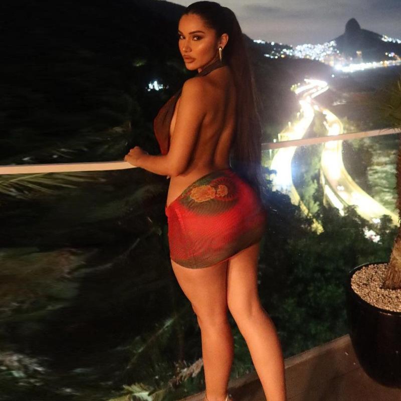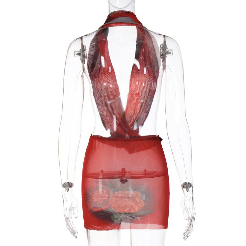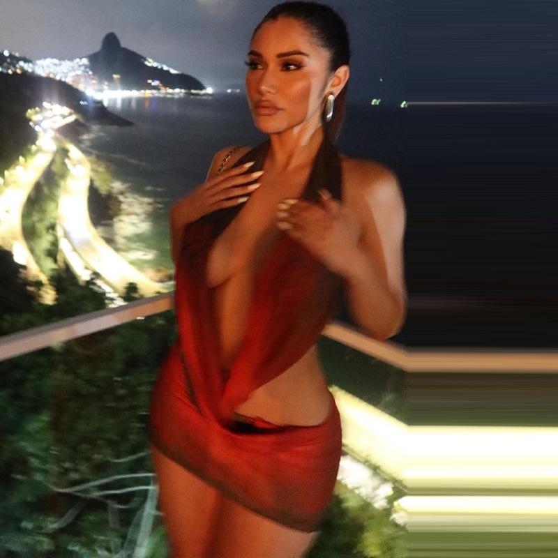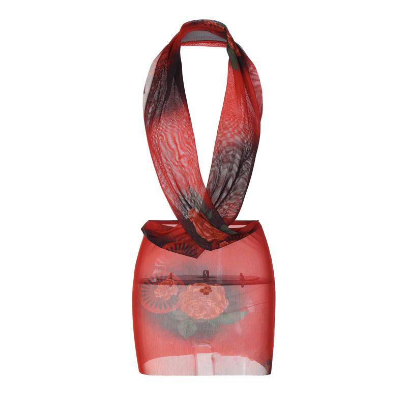 Vestido ajustado con cuello halter y estampado de malla sexy nuevo de verano 2023 para mujer de estilo europeo y americano, comercio exterior al por mayor