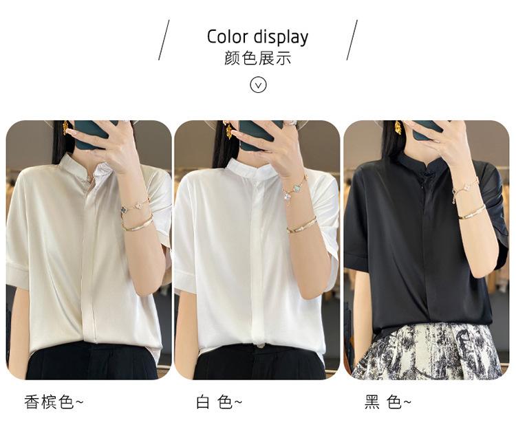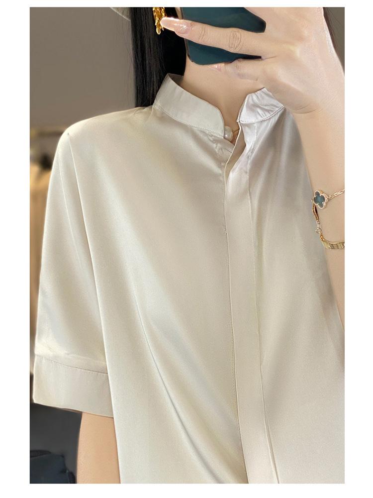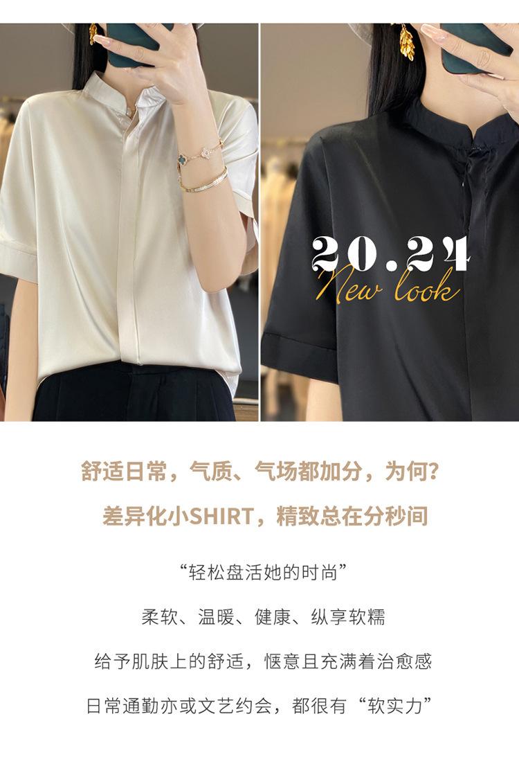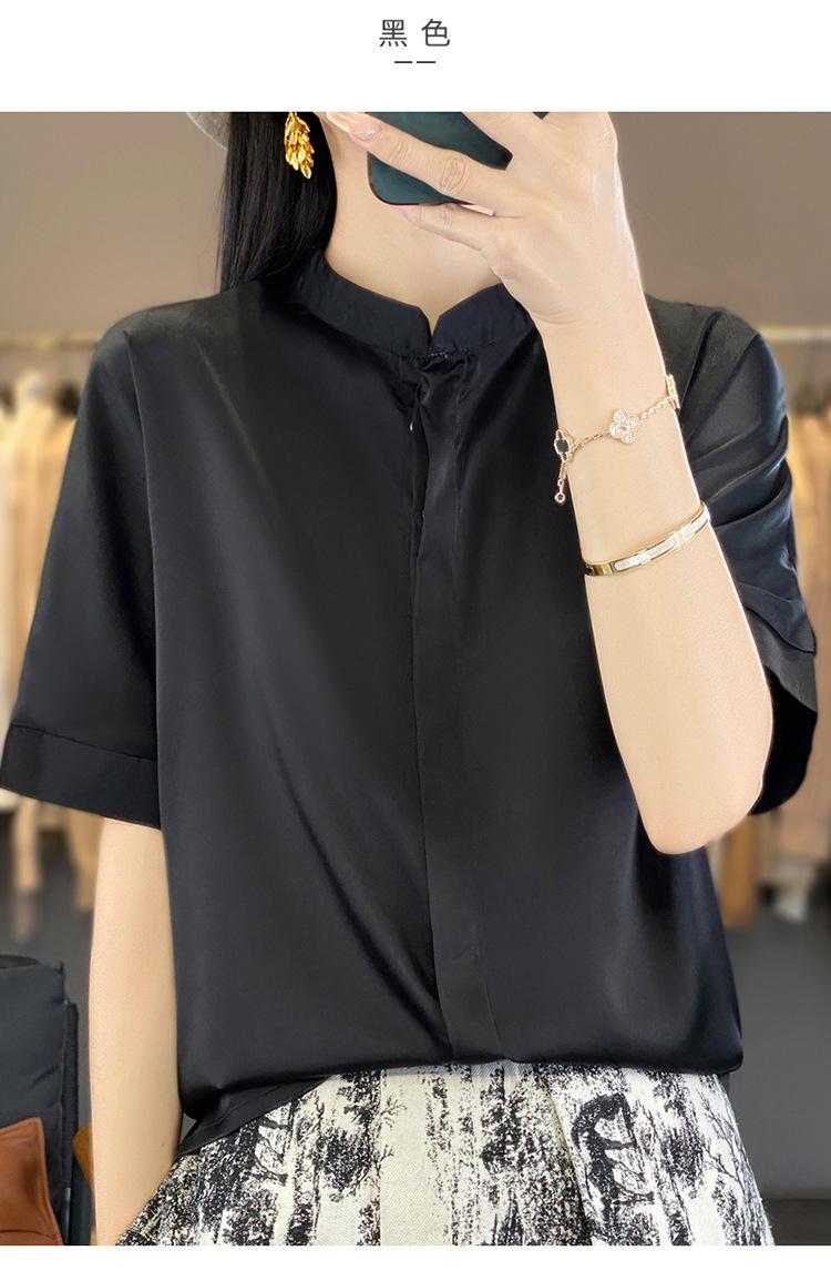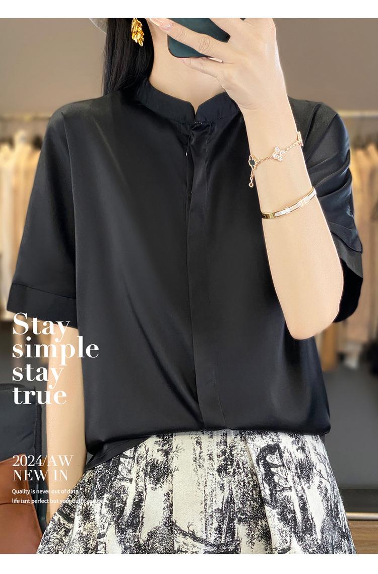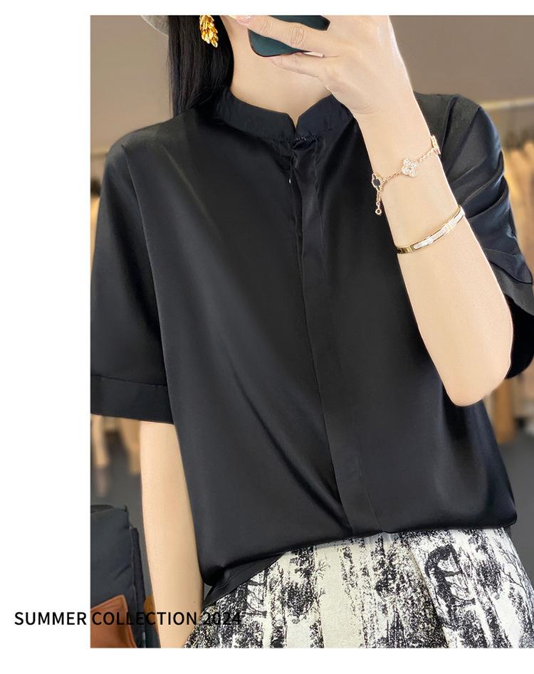 Primavera y Verano 2024 Nueva Camisa Camiseta de Manga Corta para Mujer Cuello Vertical Satén de Acetato Elegante Simple Holgada Top para Uso Exterior