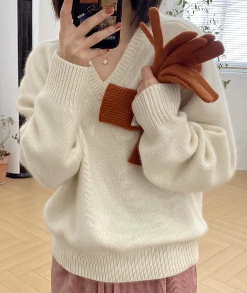 2025 Nuevo Otoño e Invierno Estilo Coreano para Mujer Lana Pura Cuello en V Manga Larga Color Puro Suéter Holgado de Lana para Mujer