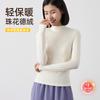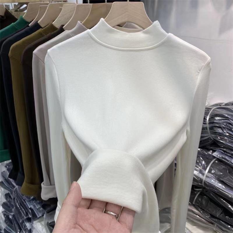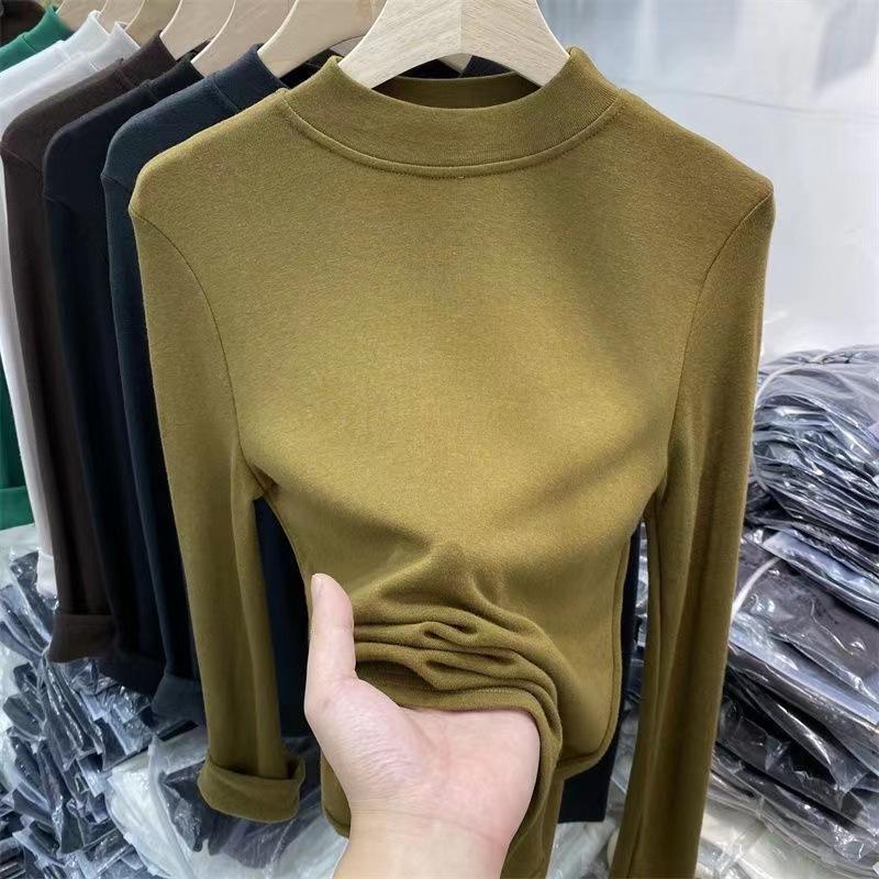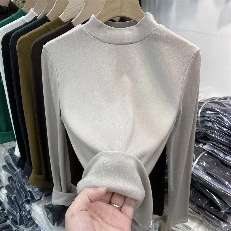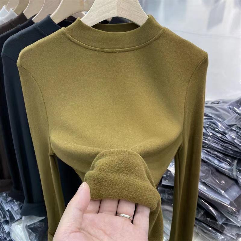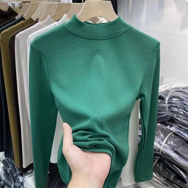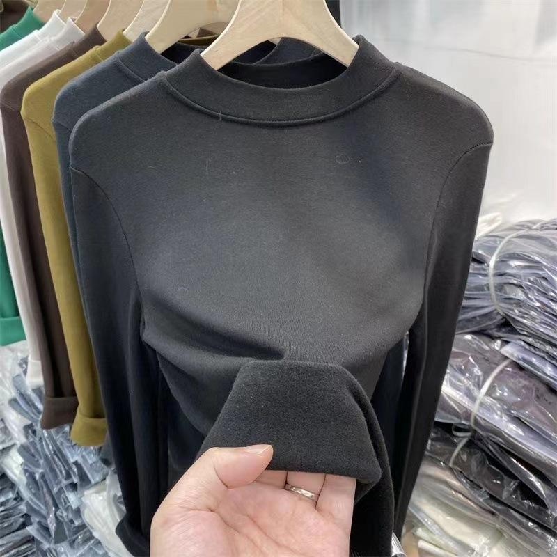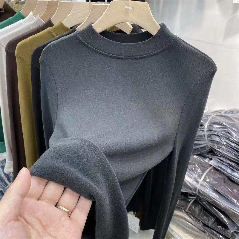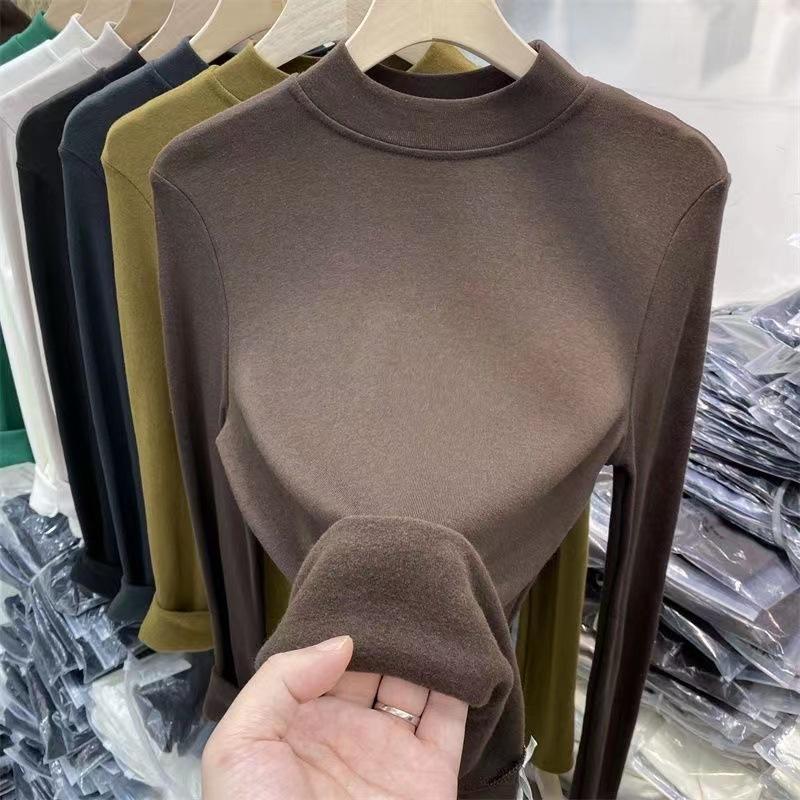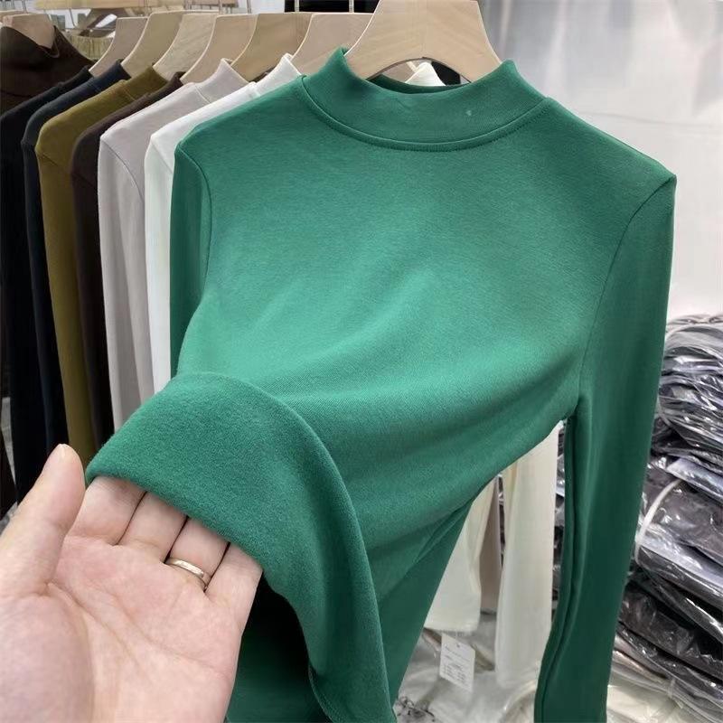 Camiseta de manga larga con cuello semialto, forrada con polar y ajuste ceñido para mujer, de 7 colores lisos y súper suave.