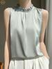 Camisa de verano para mujer, plisada, de satén, con encaje, cuello medio alto y sin mangas