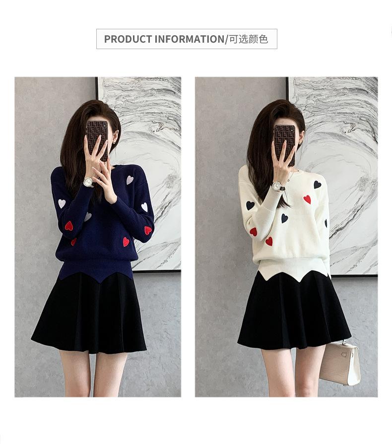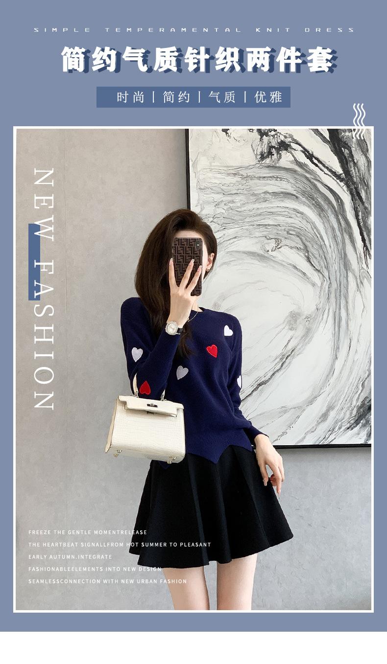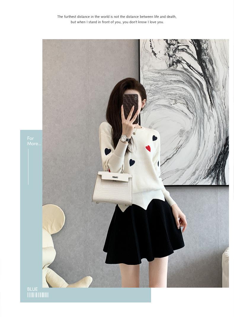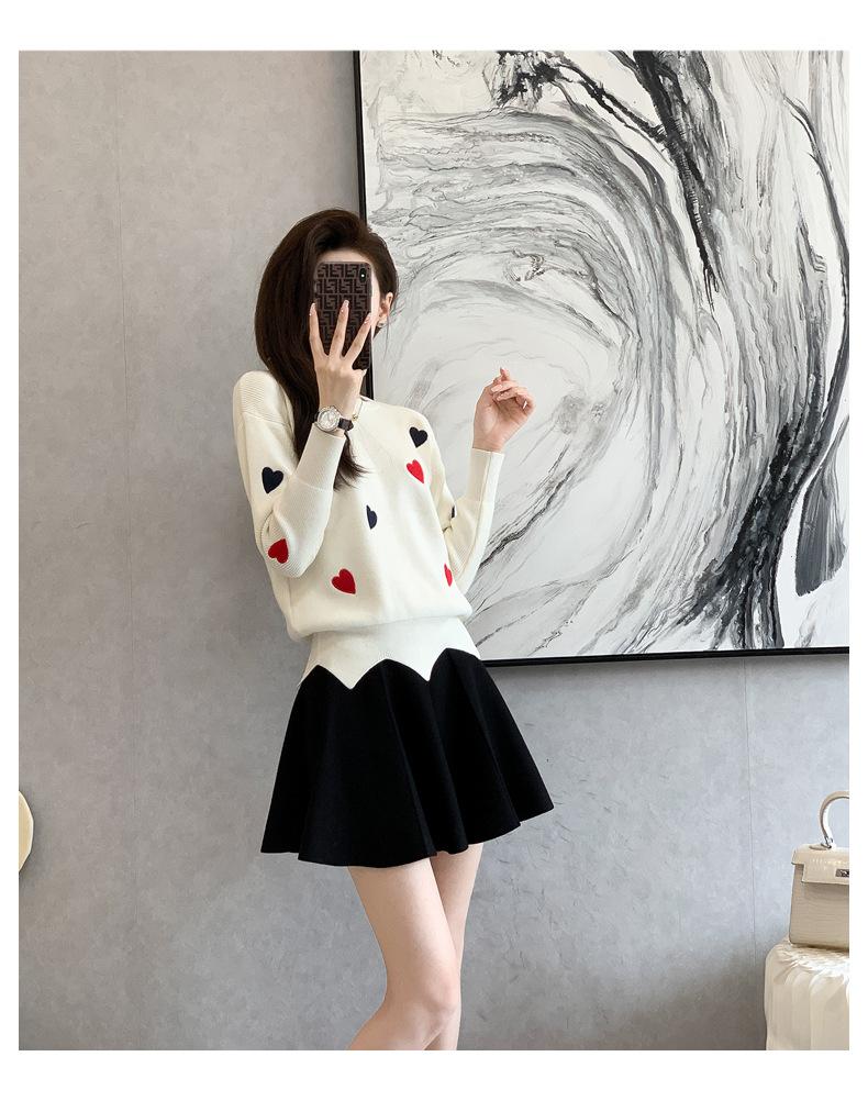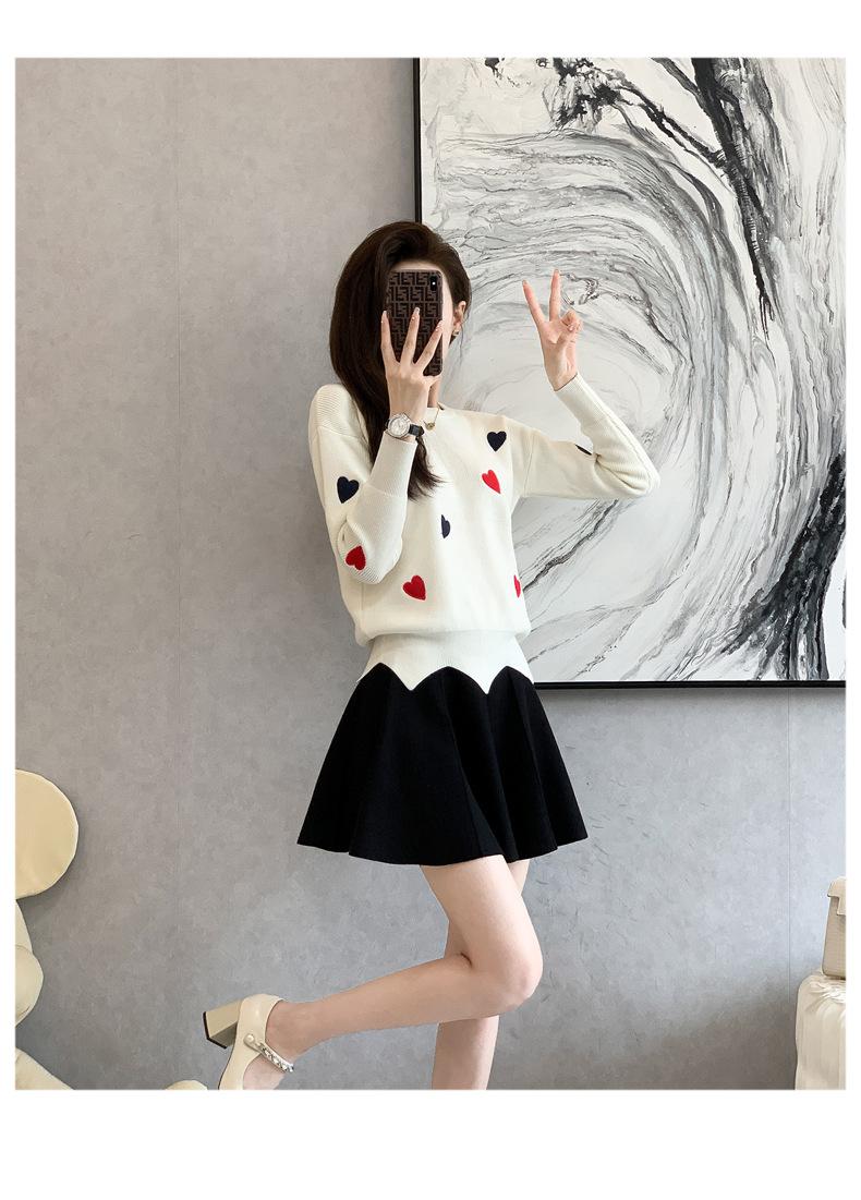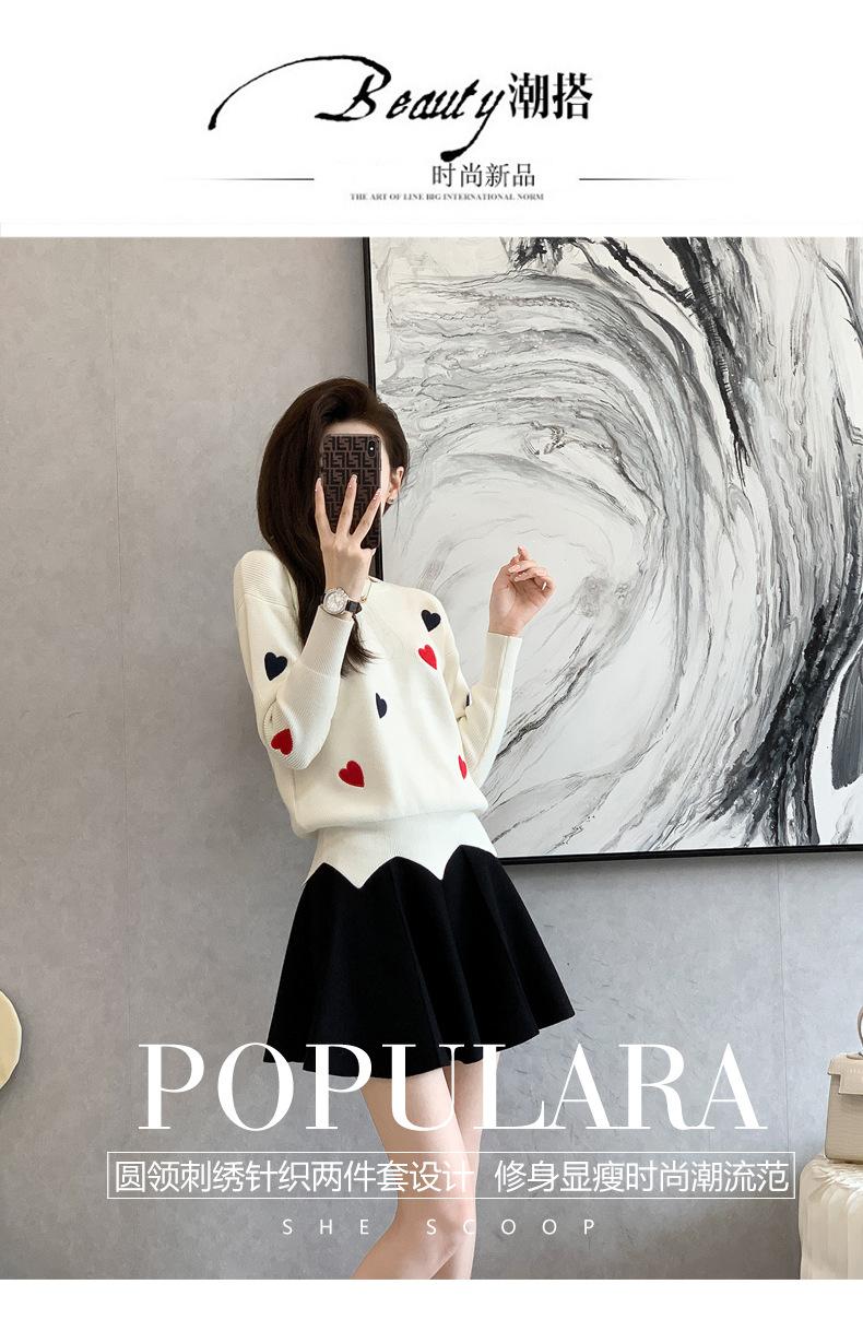 Traje Casual de Moda para Mujer 2024 Otoño e Invierno Suéter Bordado de Corazoncito de Durazno Falda Línea A Traje de Punto de Dos Piezas Falda