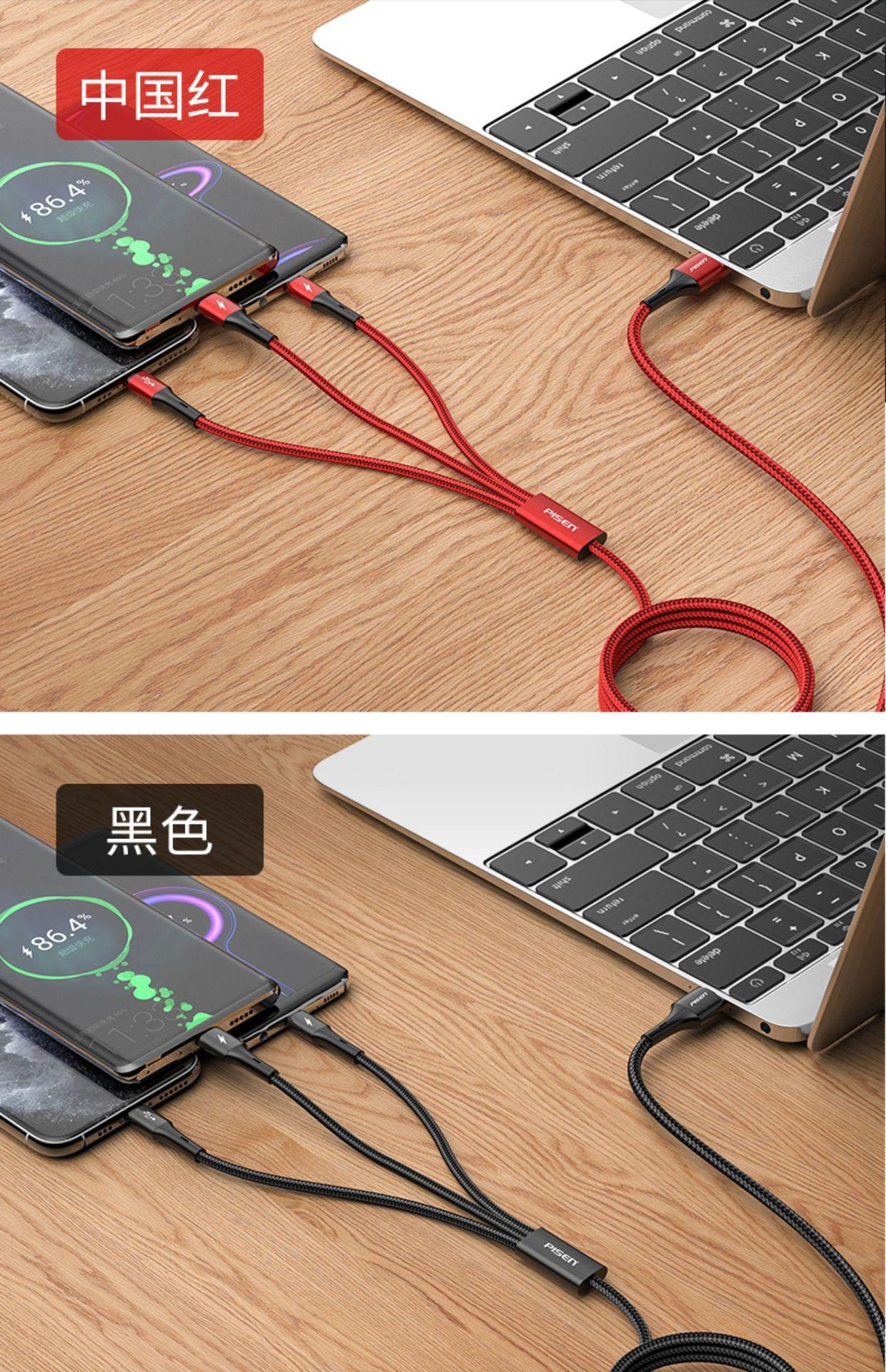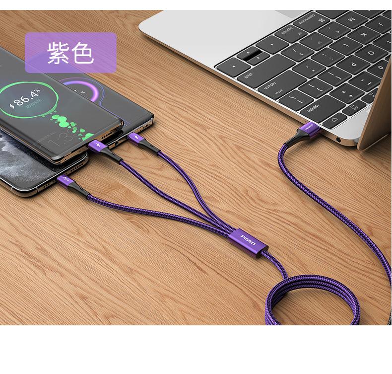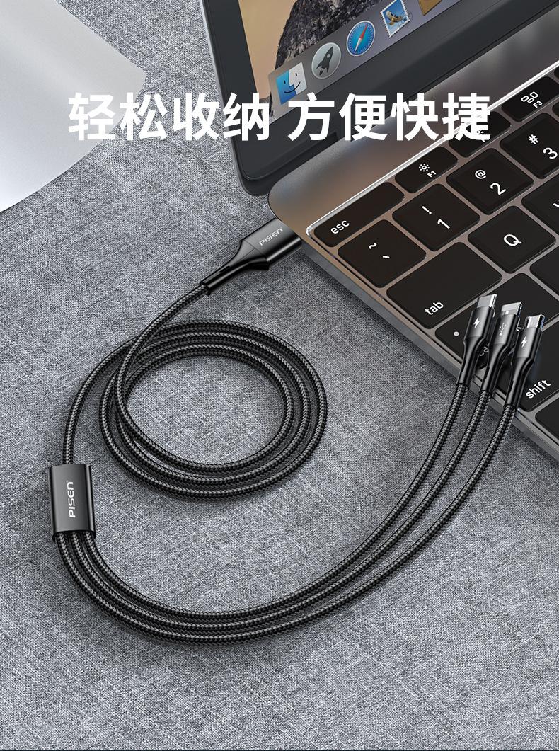 Cable de datos Pinsheng 3 en 1 de carga rápida, cable de carga uno a tres, tipo C, para coche, multicabezal, compatible con Apple y Huawei.