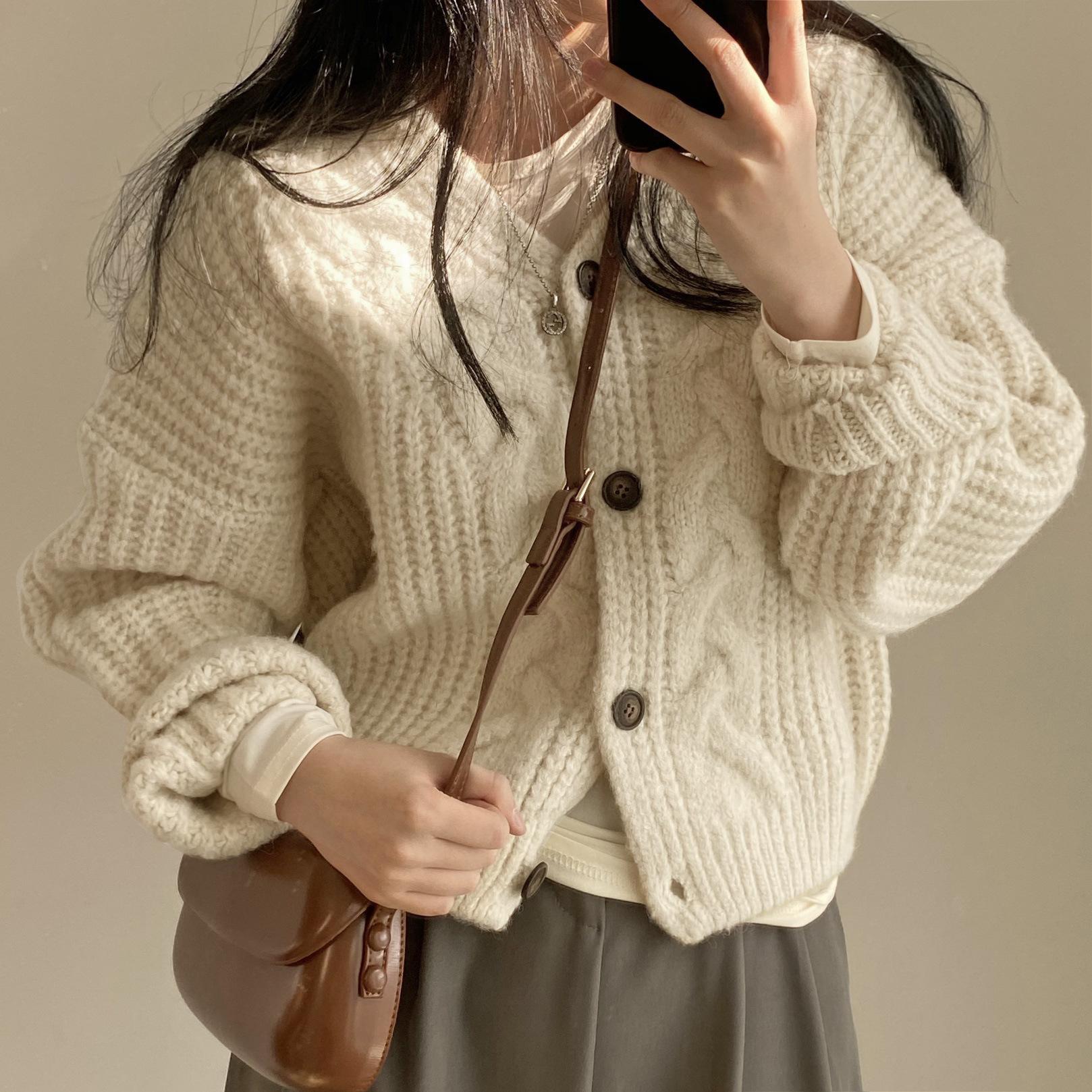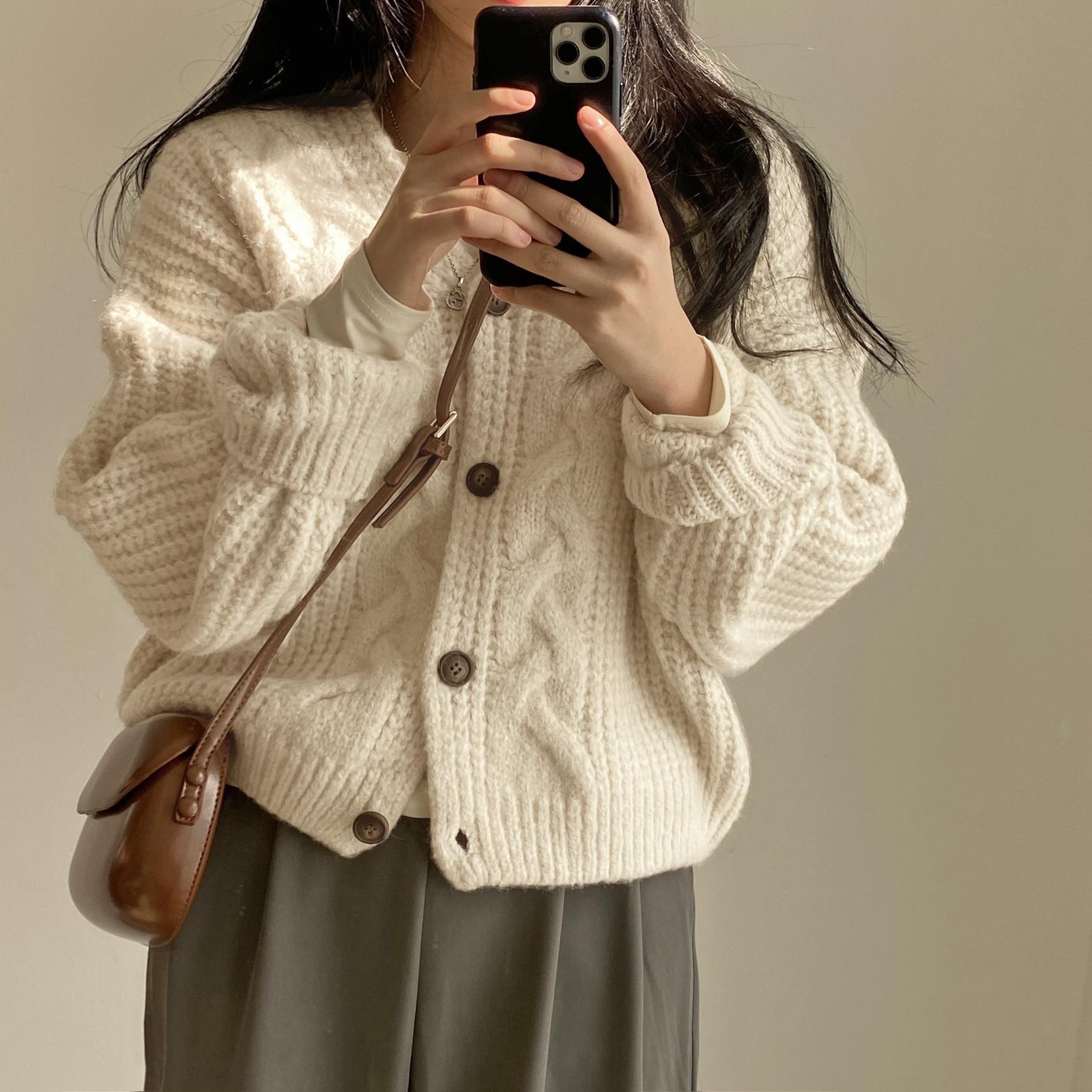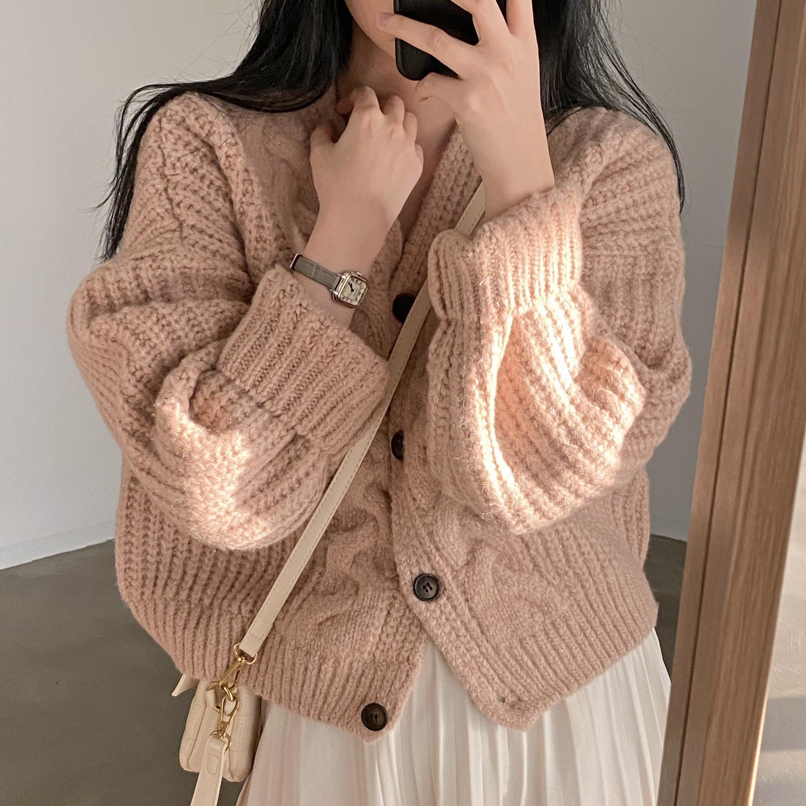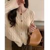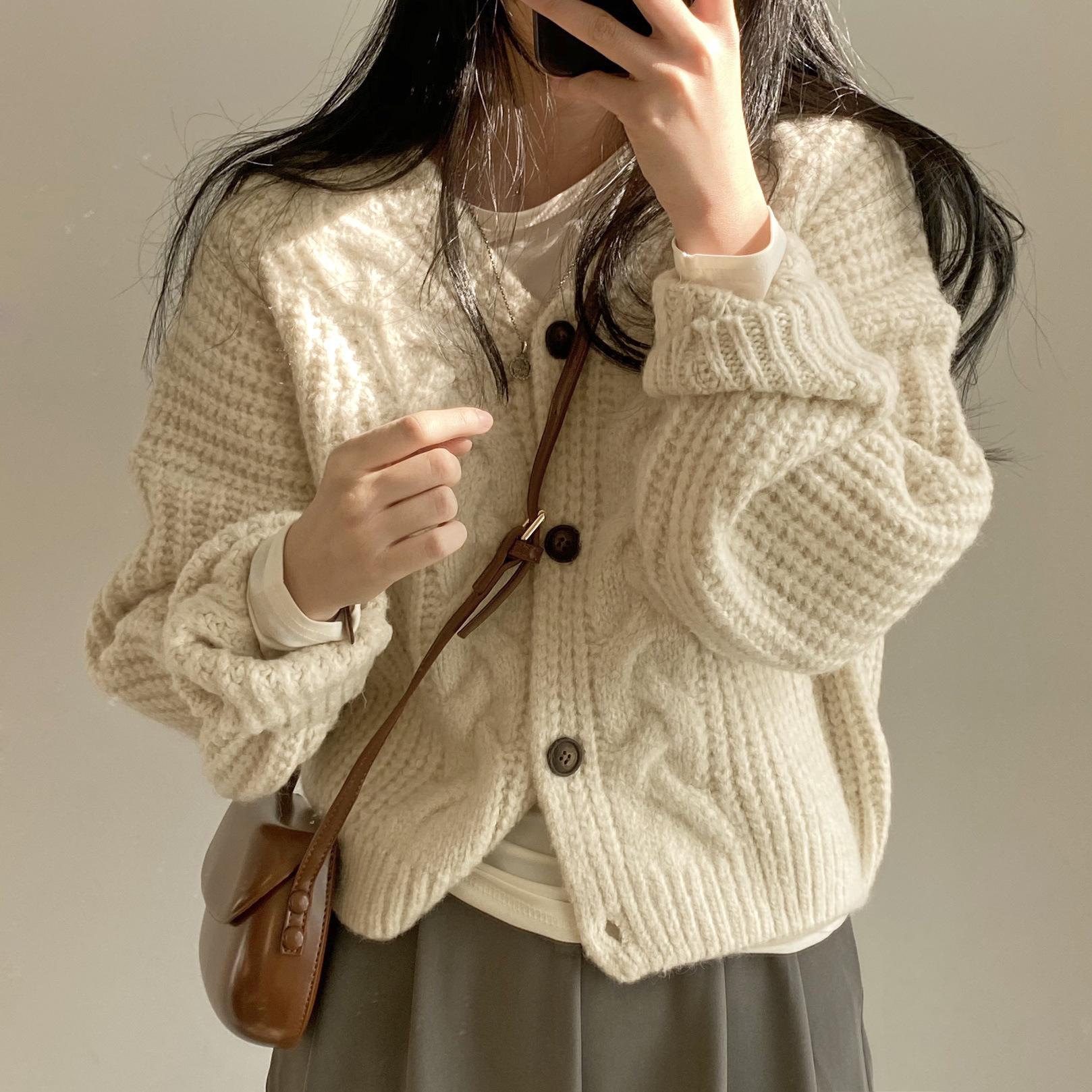 Abrigo de Suéter Grueso Cálido Trenzado de Otoño e Invierno para Mujer Estilo Perezoso Holgado Elegante Combinable Cárdigan Corto de Punto Moderno