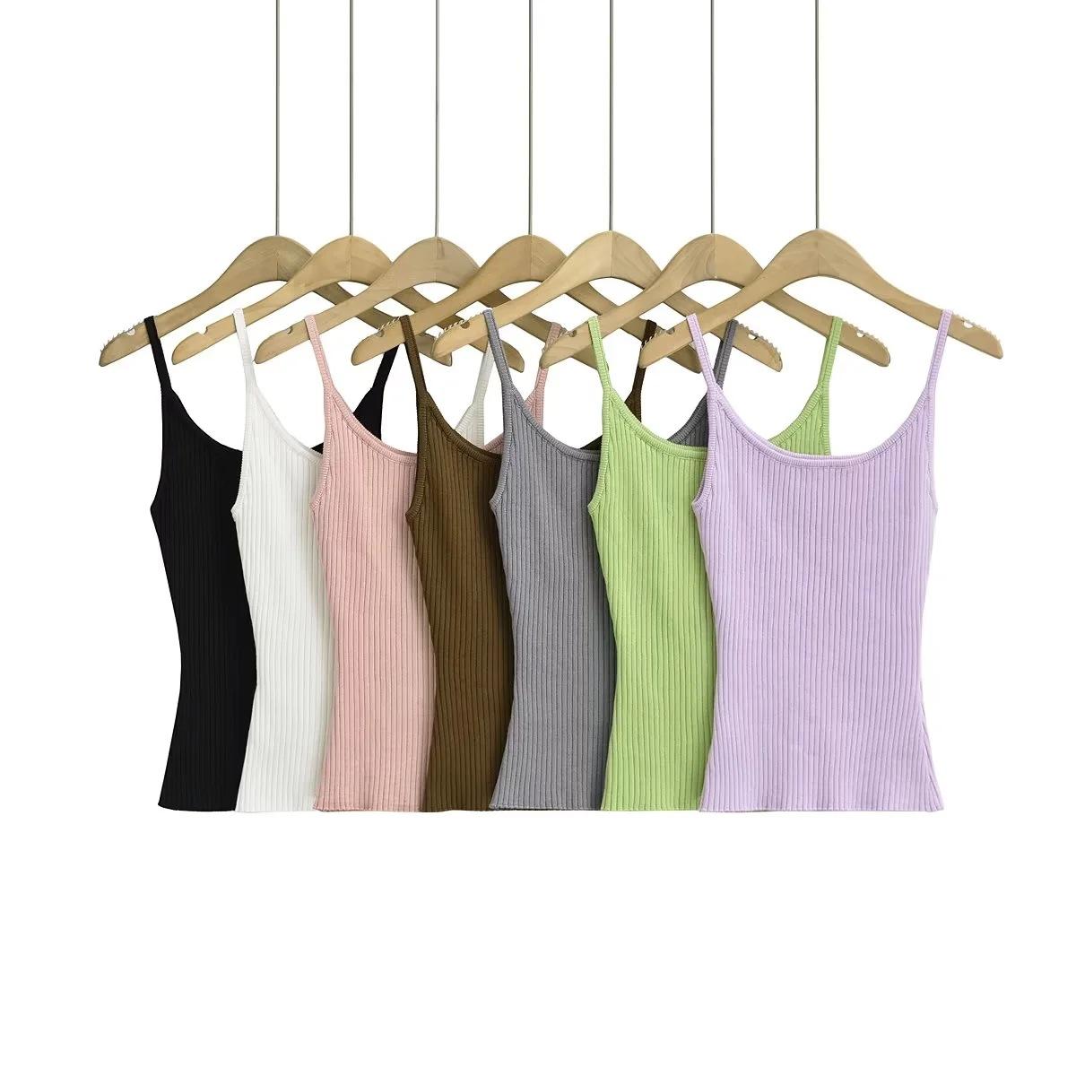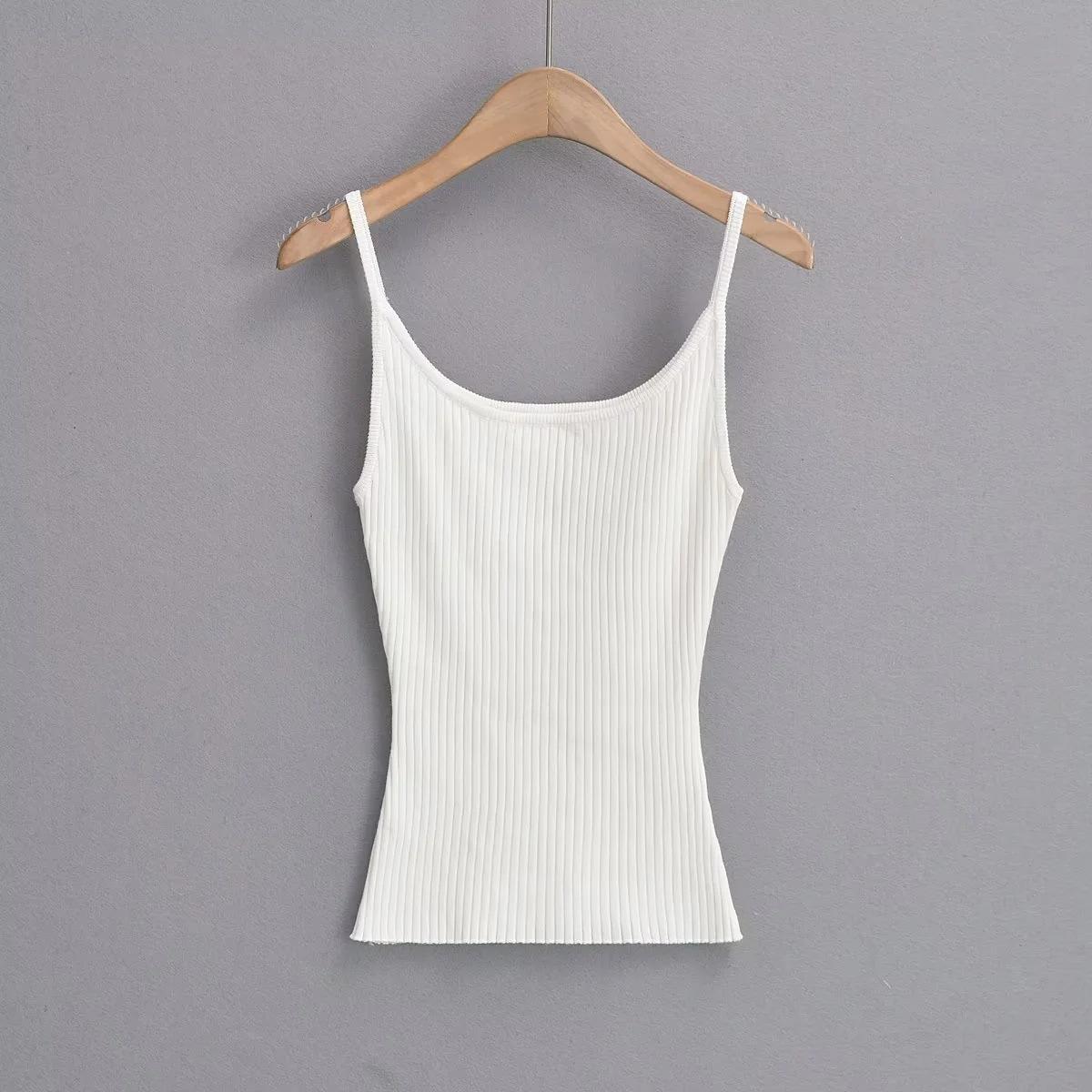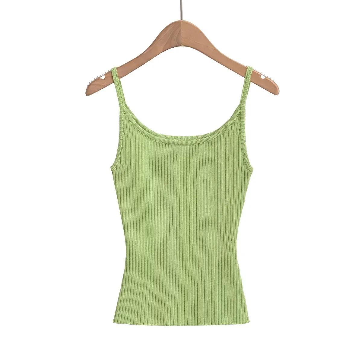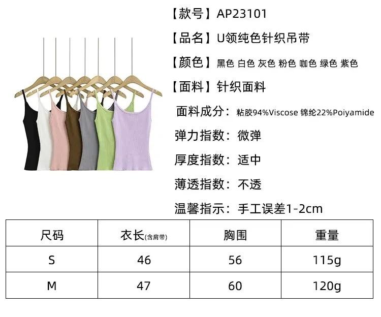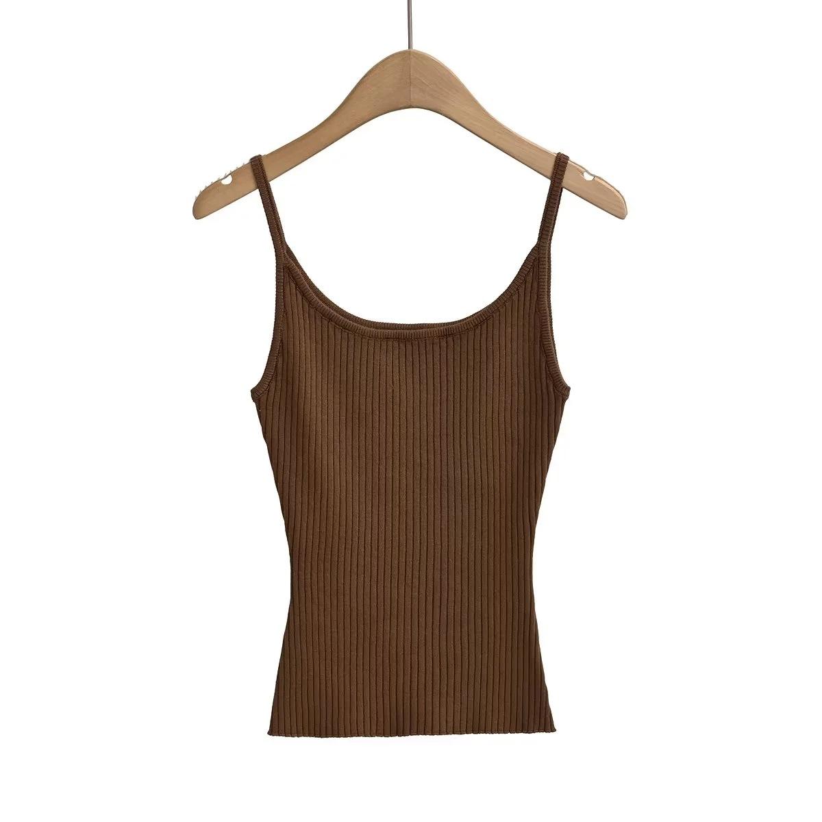 Top de tirantes de estilo europeo y americano de moda de verano 2023, nuevo top de tirantes de punto de color liso con escote en U y corte entallado vertical.