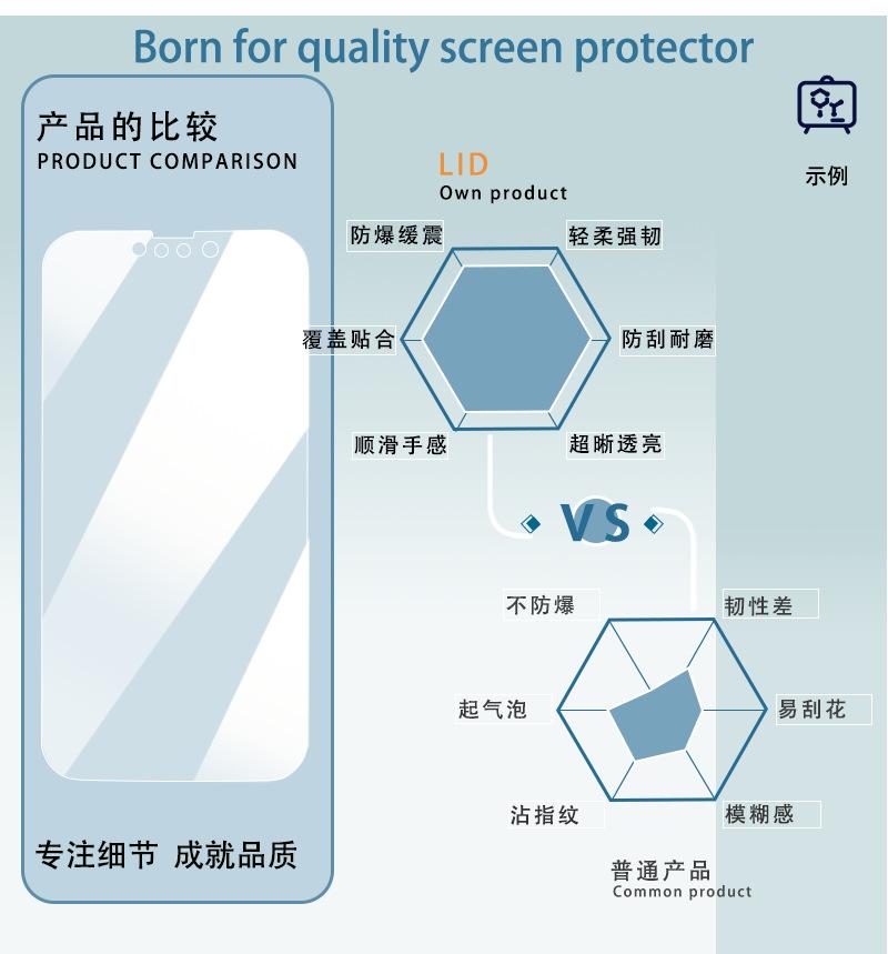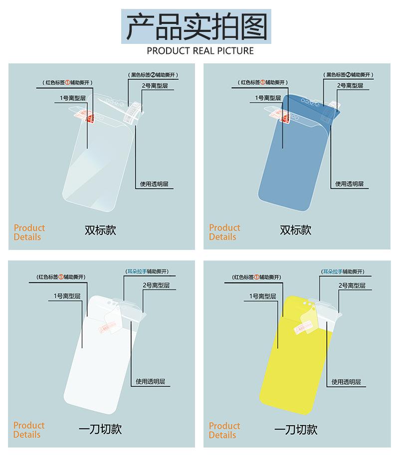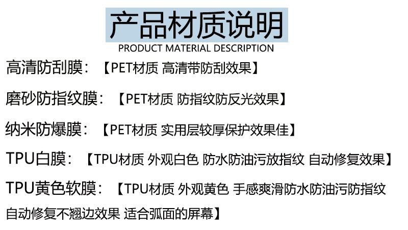 1. Las películas de alta definición, esmeriladas y antideflagrantes están hechas de PET, un material altamente transparente. La película nanoflexible está hecha de TPU.