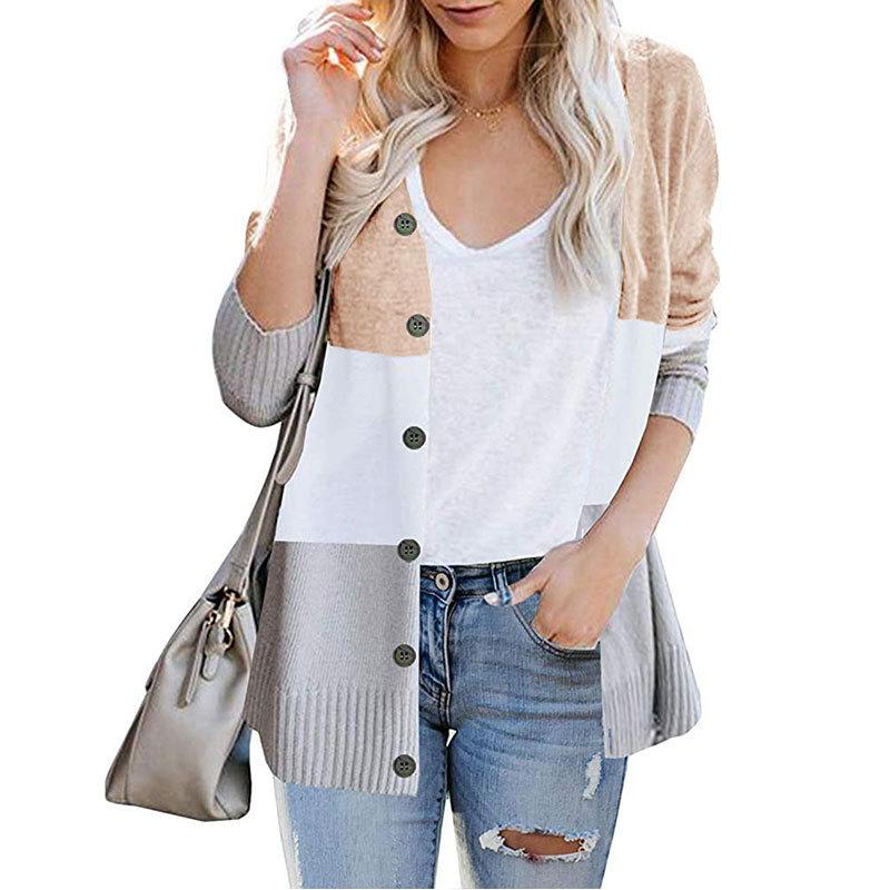 Suéter de mujer de otoño e invierno 2019, suéter de punto de manga larga con botones y rayas en contraste estilo europeo y americano, chaqueta tipo cárdigan corta
