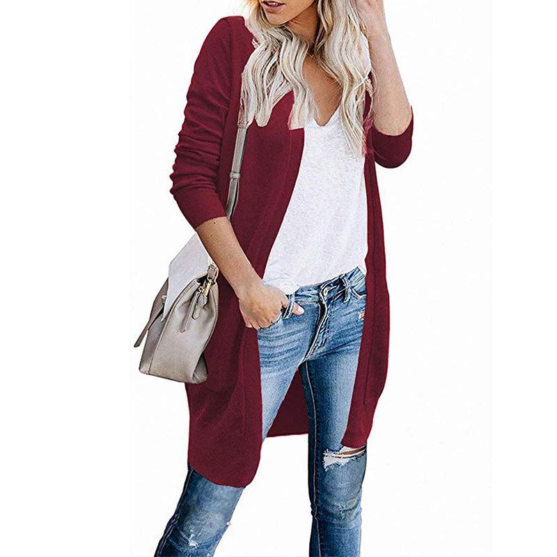 Suéter de mujer de otoño e invierno, abrigo de talla grande de Amazon, suéter de color sólido mediano largo, cárdigan de punto