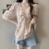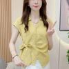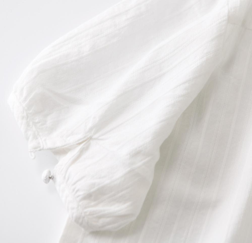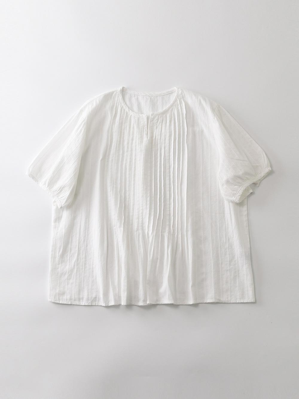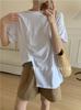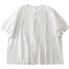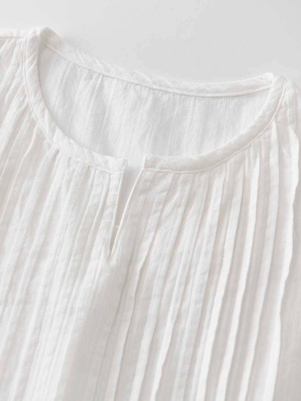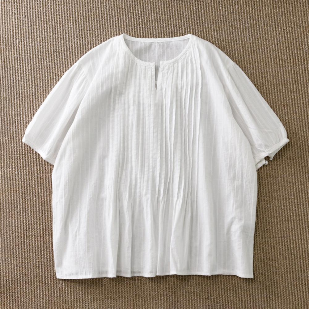 Camisa blanca de manga corta con estampado artístico Mecanismo Sense, holgada, informal, con cuello en V pequeño, para mujer, de algodón puro blanco con pliegues de órgano.