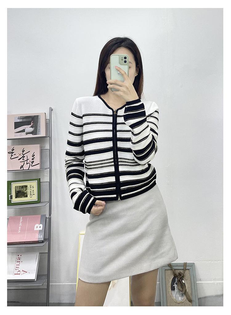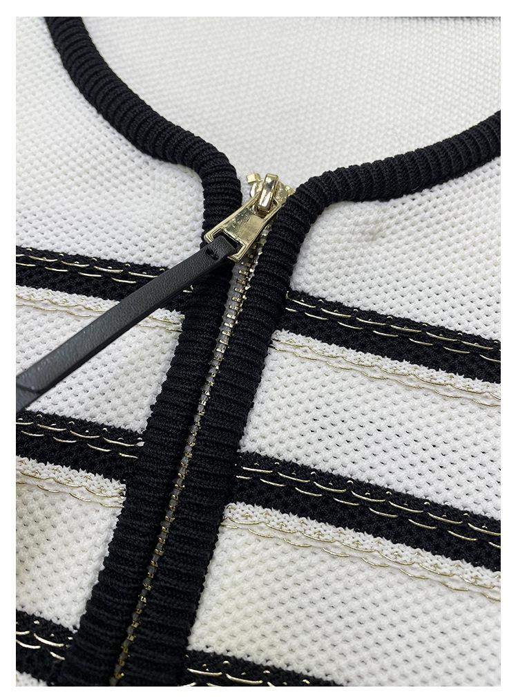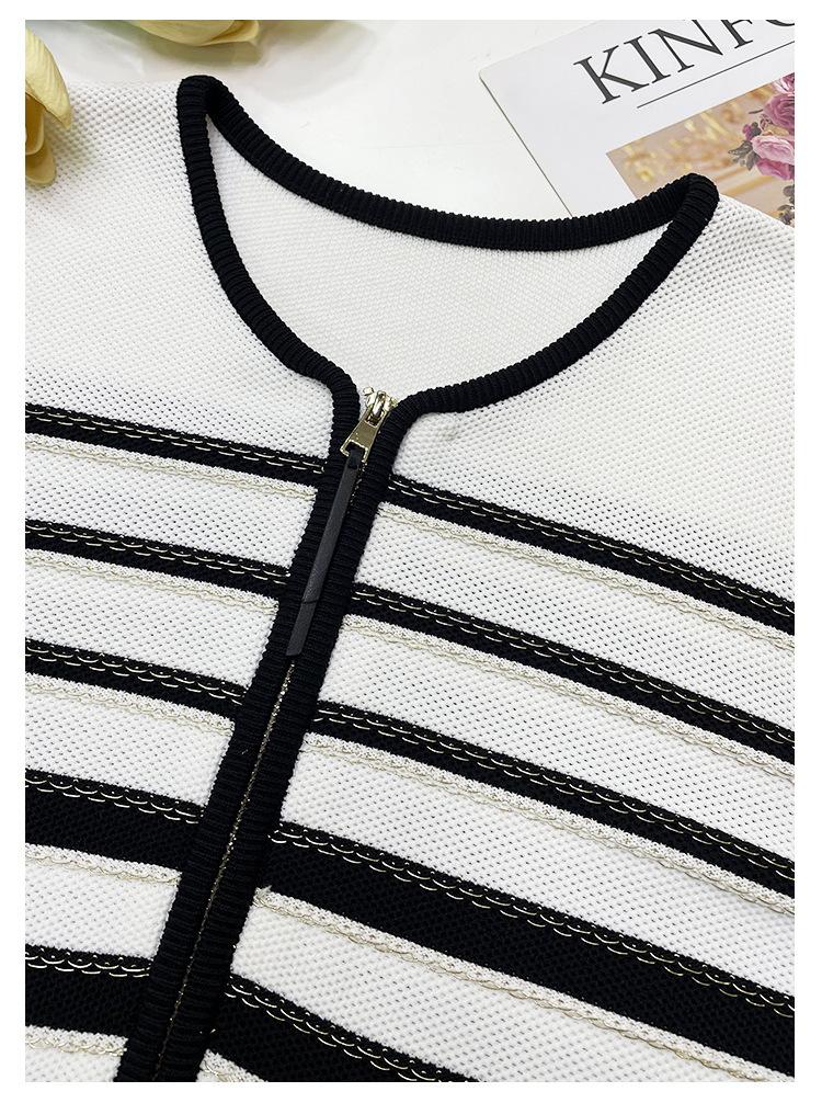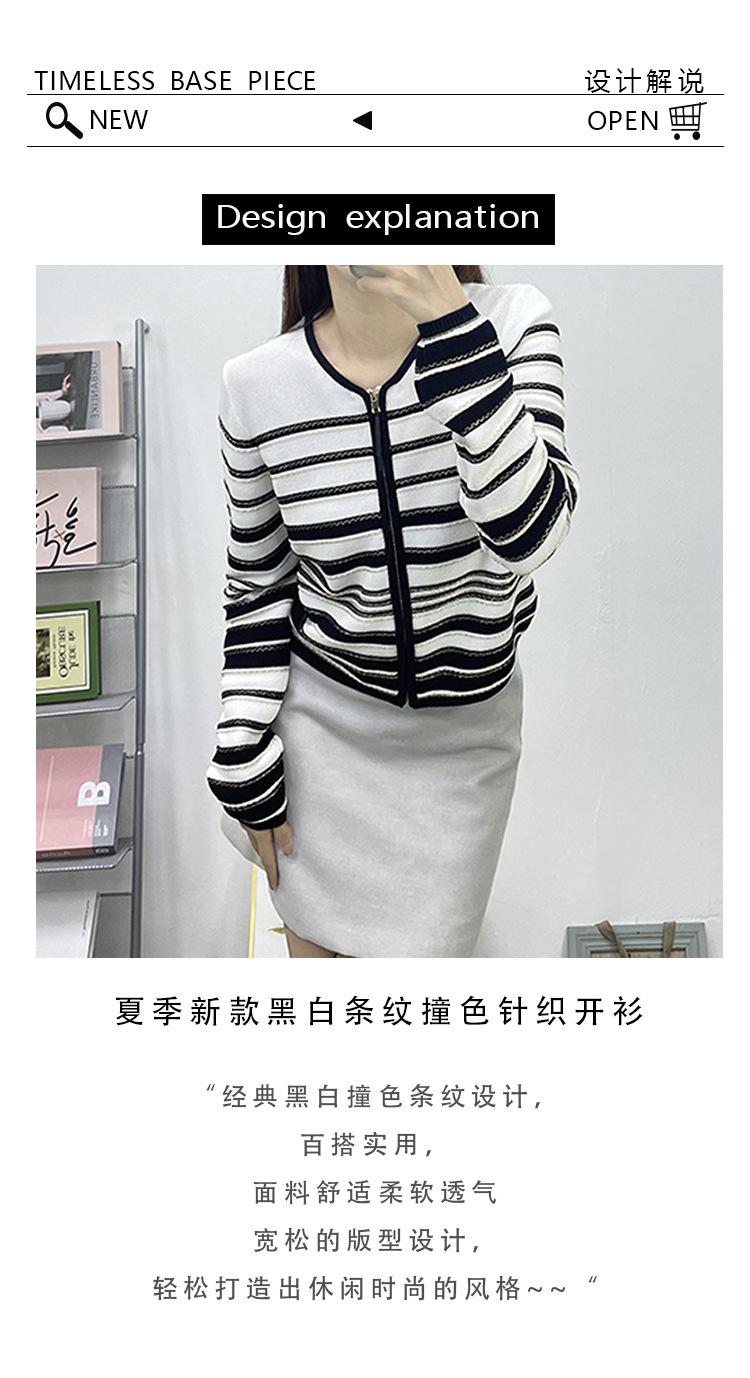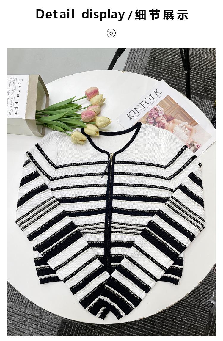 Ropa de Mujer Nueva Primavera 2024 Estilo Chanel Cuello Redondo Raya Blanca y Negra Combinable Manga Larga Cremallera Chaqueta Cárdigan Tejida para Mujer