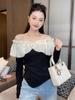 Playera Francesa de Color Block con Cuello de Hoja de Loto Plisada para Mujer 2025 Primavera y Verano Nuevo Diseño Nicho Slim Manga Larga para Fondo