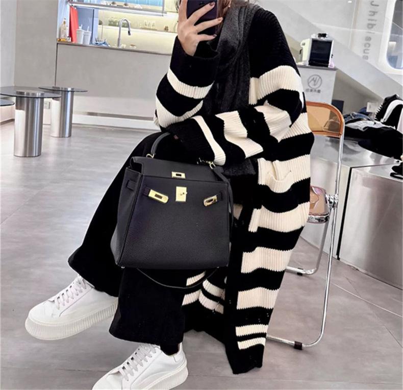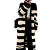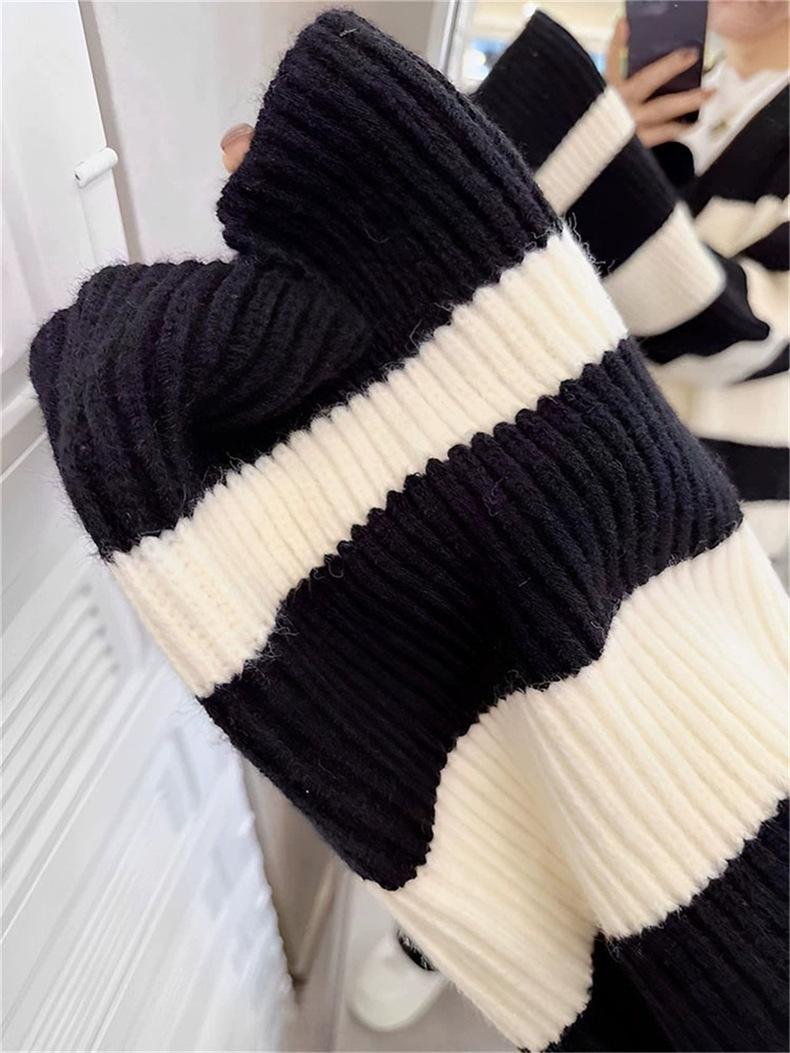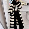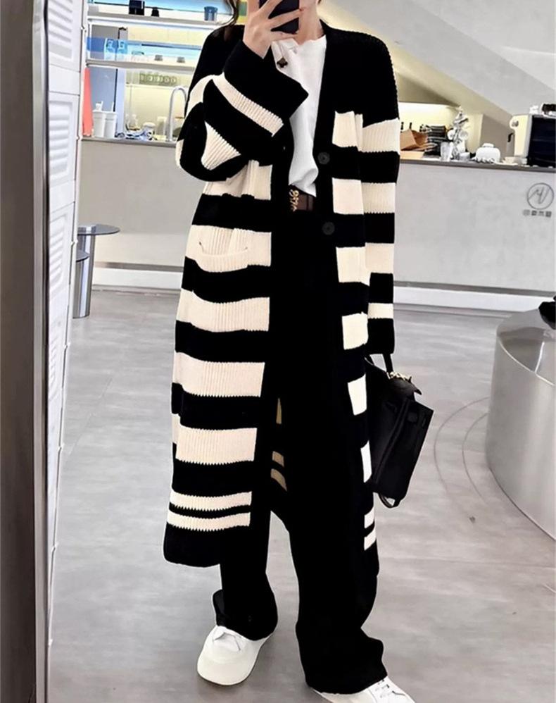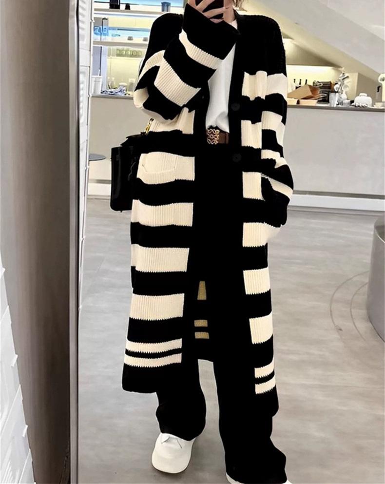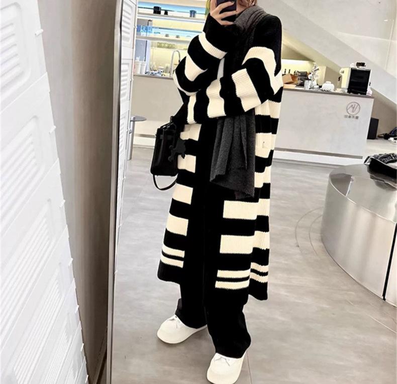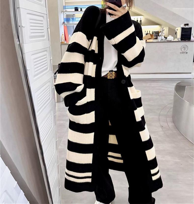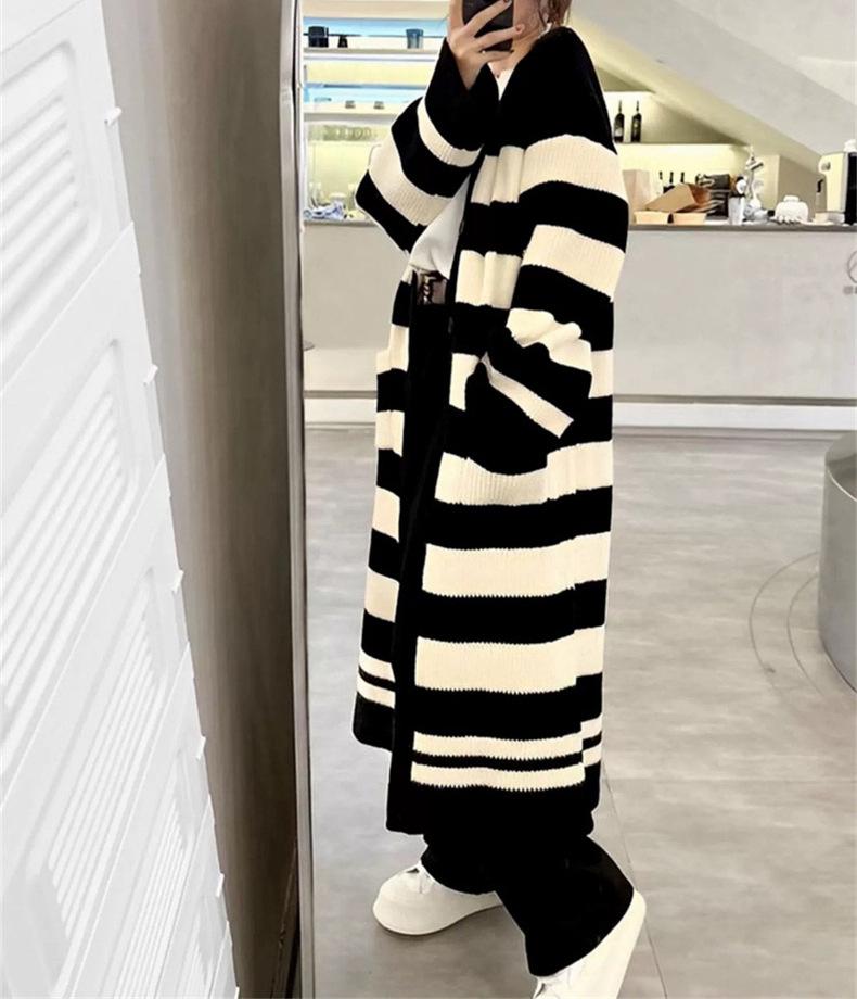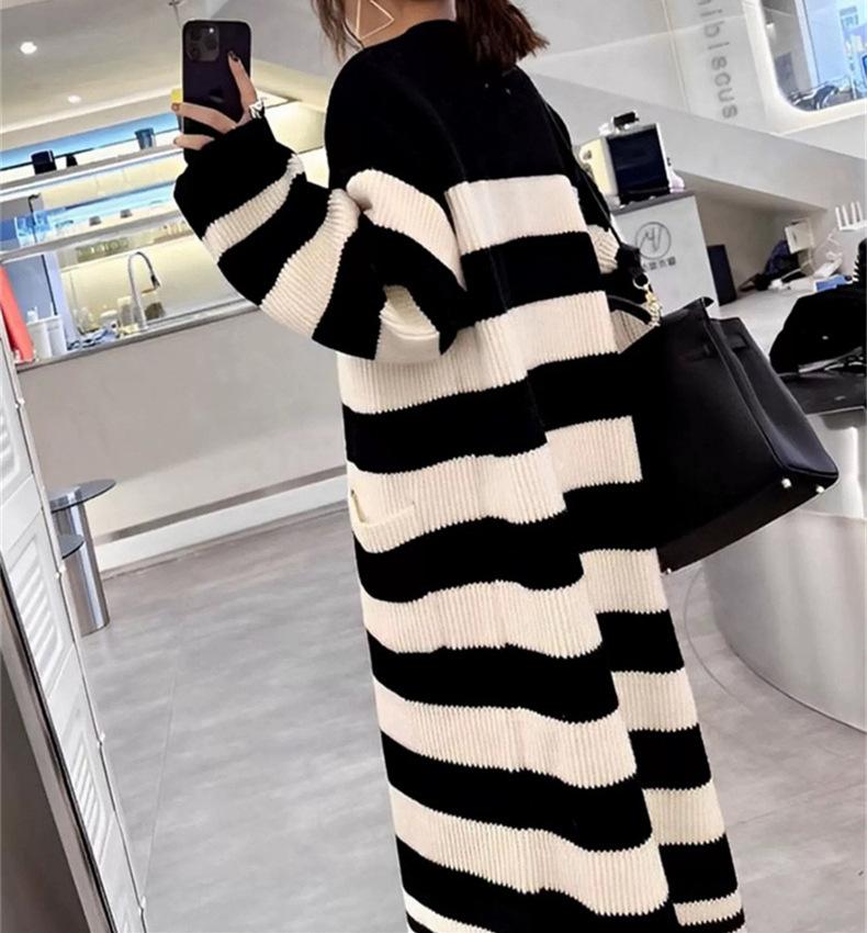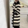 Abrigo largo hasta la rodilla con rayas blancas y negras para mujer, otoño e invierno, nuevo abrigo tipo cárdigan de punto holgado estilo occidental estilo coreano.