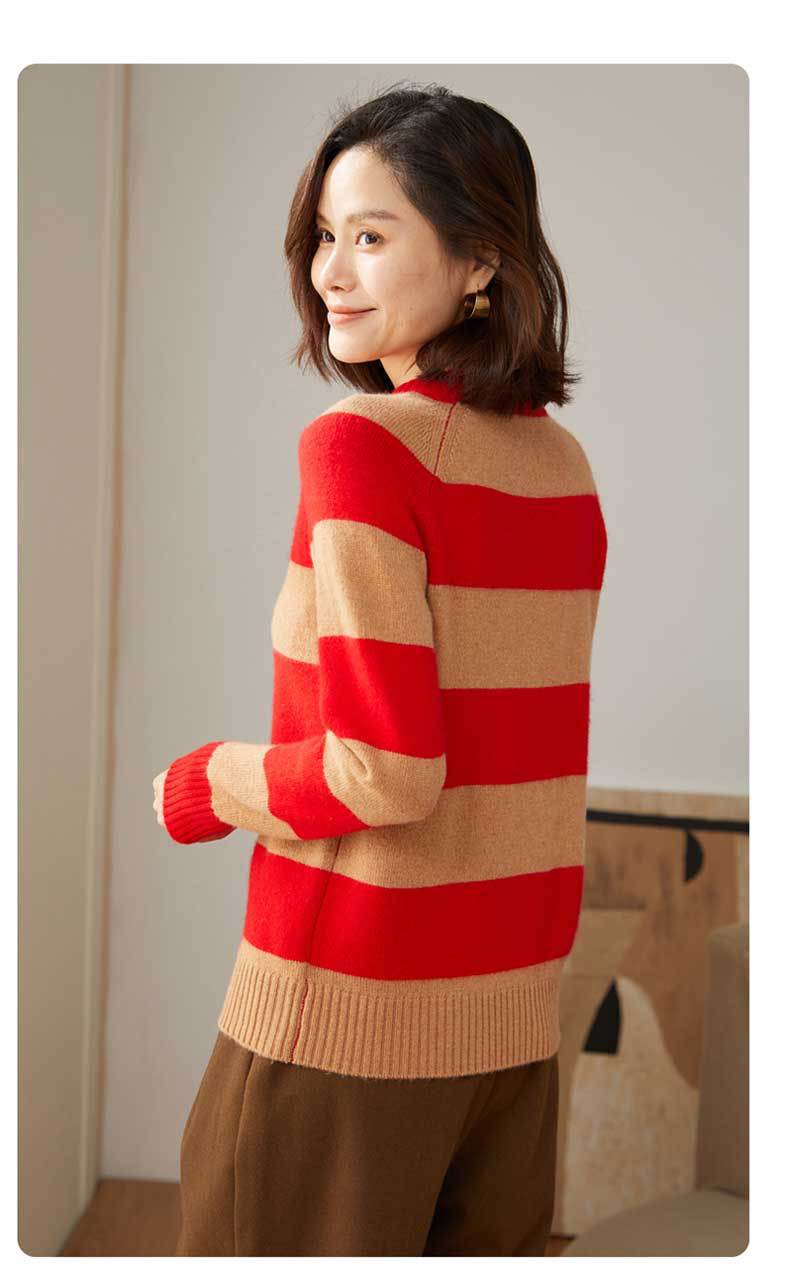 Suéter de cachemira para mujer, otoño e invierno 2023, suelto, cuello redondo, corto, de punto en contraste, camisa a rayas