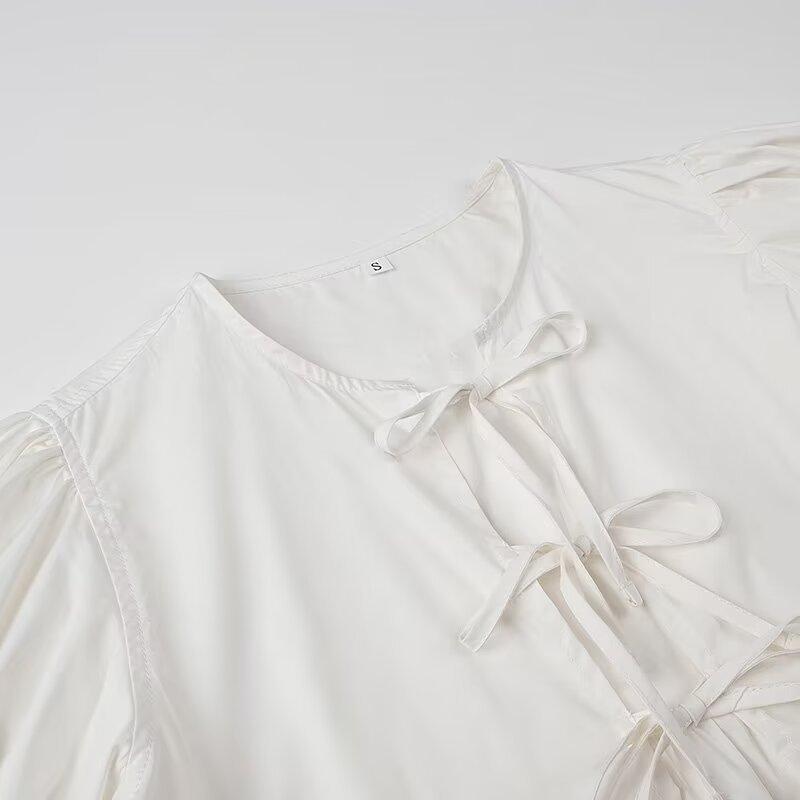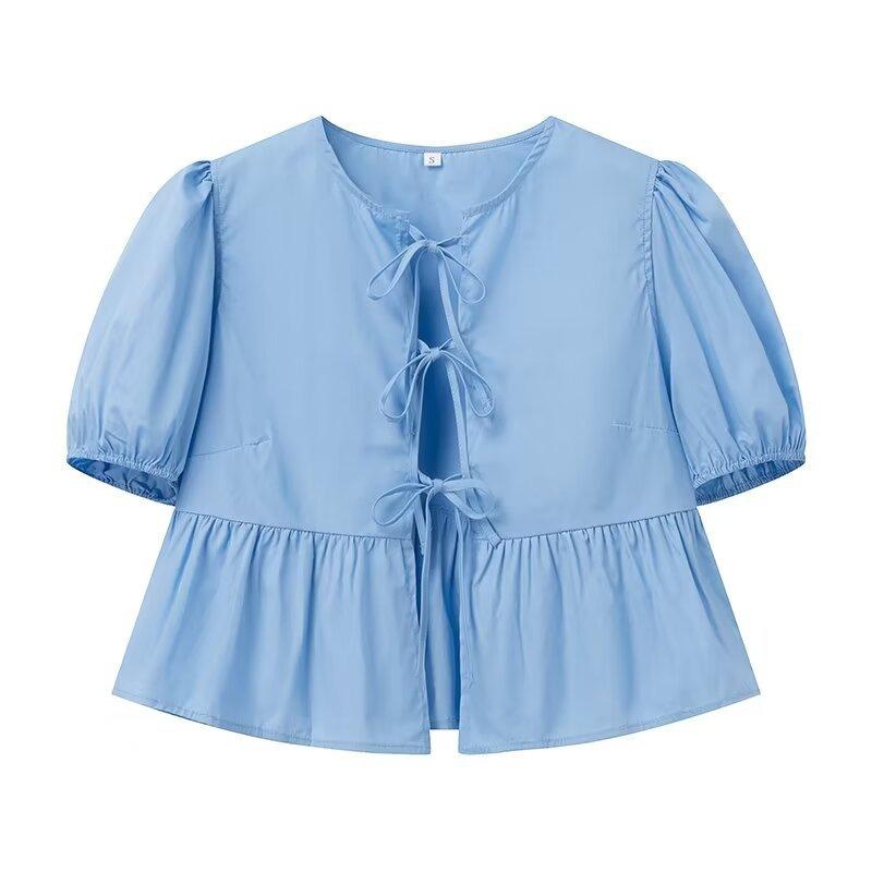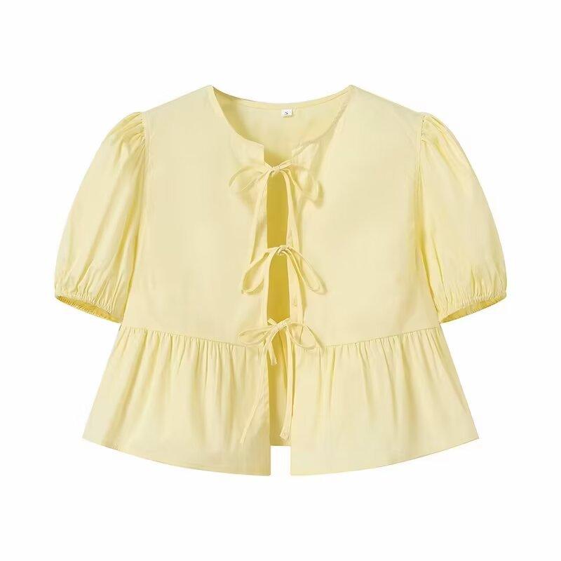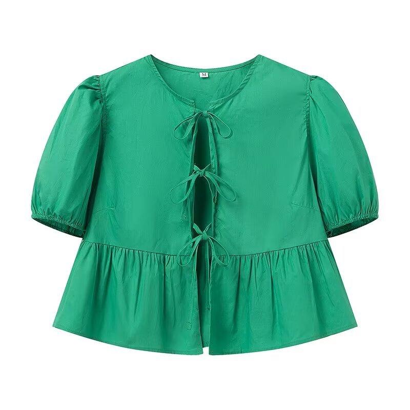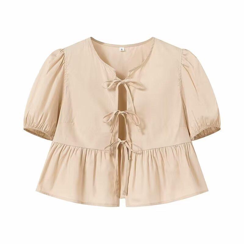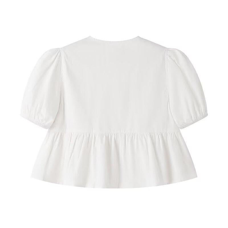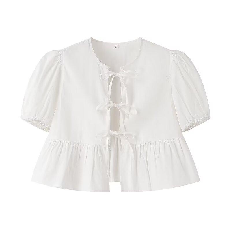 Primavera 2024, nueva ropa de mujer transfronteriza europea y americana, top de manga abullonada con encaje de algodón de moda de color sólido w091 1803