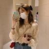 Camisa a cuadros con mangas abullonadas y cuello en V con costuras de encaje francés chic de estilo coreano para mujer