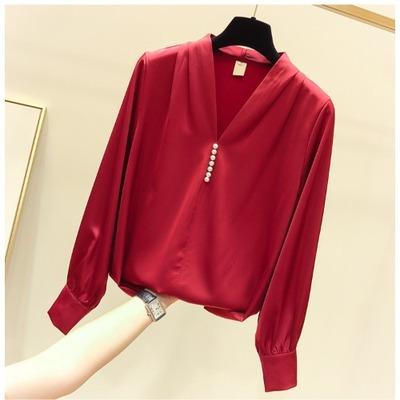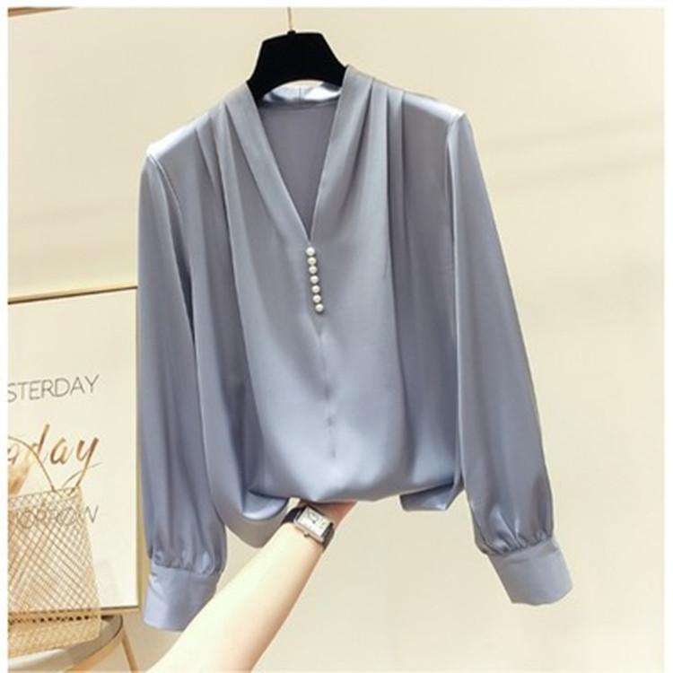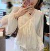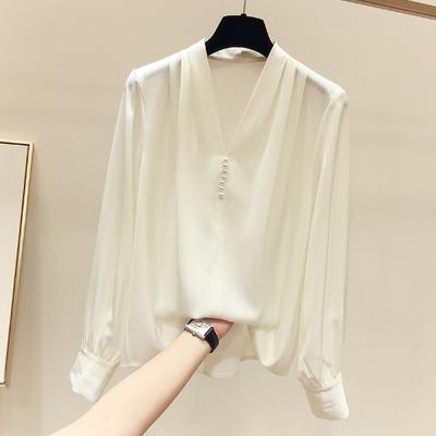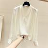2023 Otoño Nuevo Jersey Coreano Suelto Delgado Color Sólido Cuello en V Perla Camisa de Gasa de Manga Larga para Mujer Top Fino