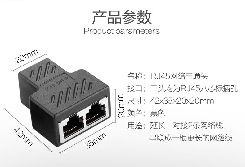 Por ejemplo, si desea usar una computadora portátil entre dos habitaciones fijas, puede usar este conector de tres vías, conectar un extremo a la fuente del cable de red y el otro extremo a dos cables de red, y cablearlos a las dos habitaciones respectivamente. De esta manera, no tiene que preocuparse por no poder acceder a Internet después de cambiar de habitación debido a la falta de un conector RJ45. ¡Es barato y práctico!