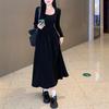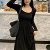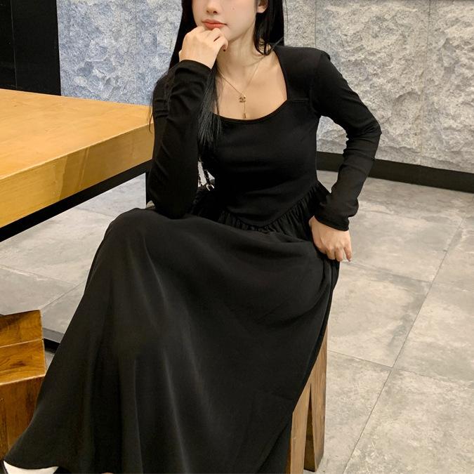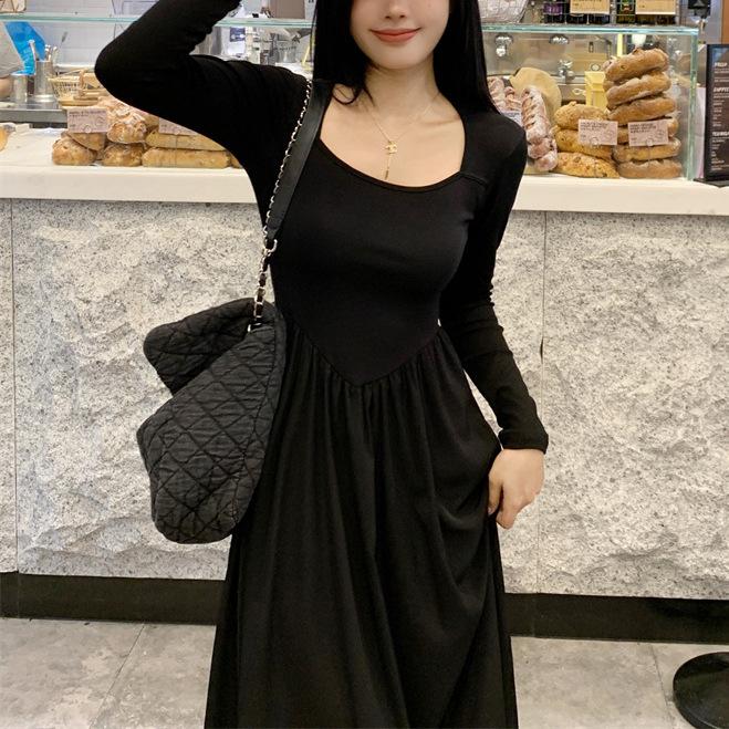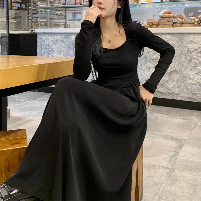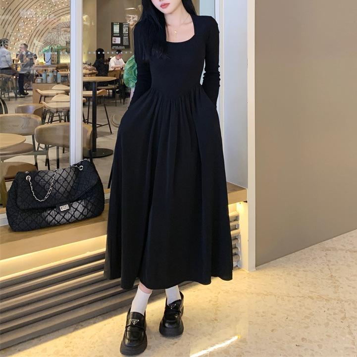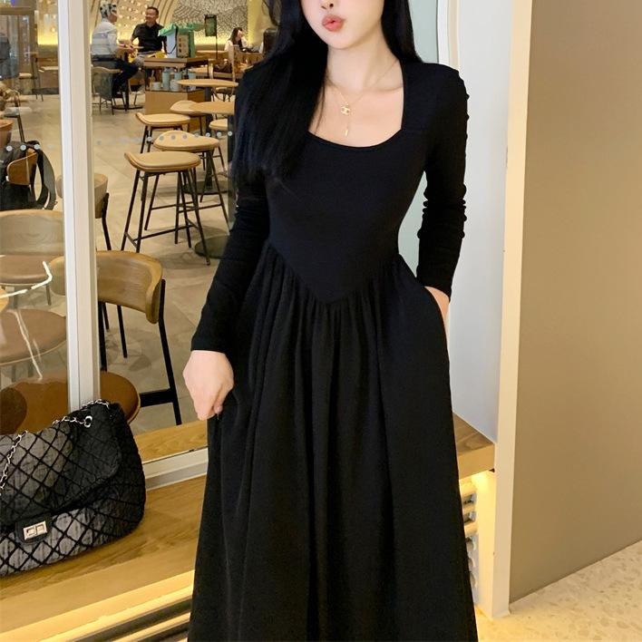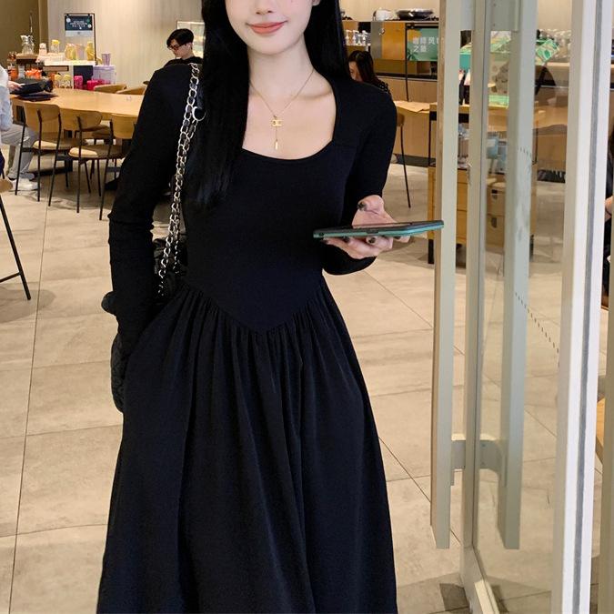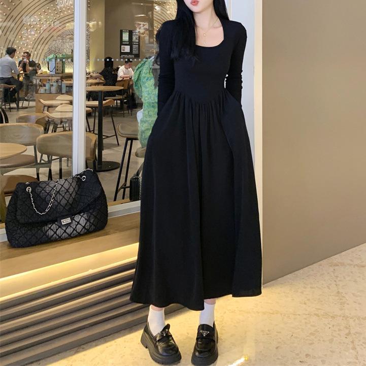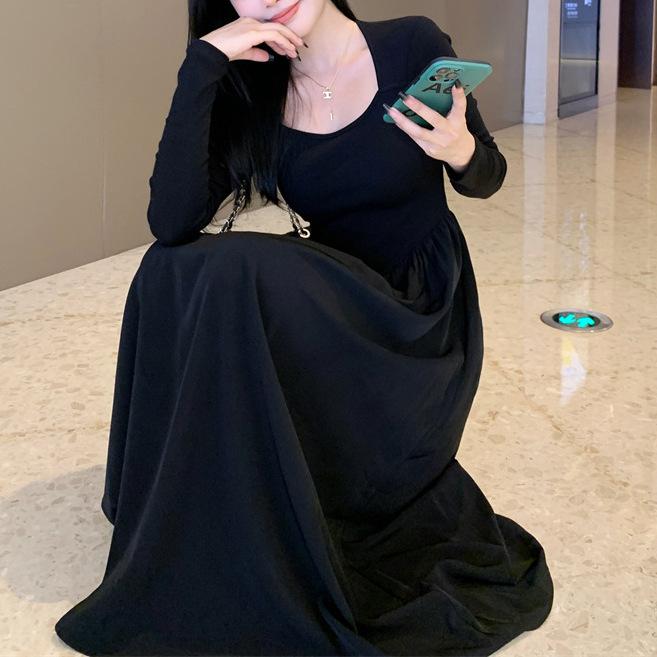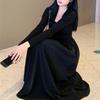 Vestido Negro para Mujer, Nuevo Estilo de Primavera y Otoño, Estilo Hepburn Francés de Alta Gama, Manga Larga, Vestido Largo Ajustado a la Cintura