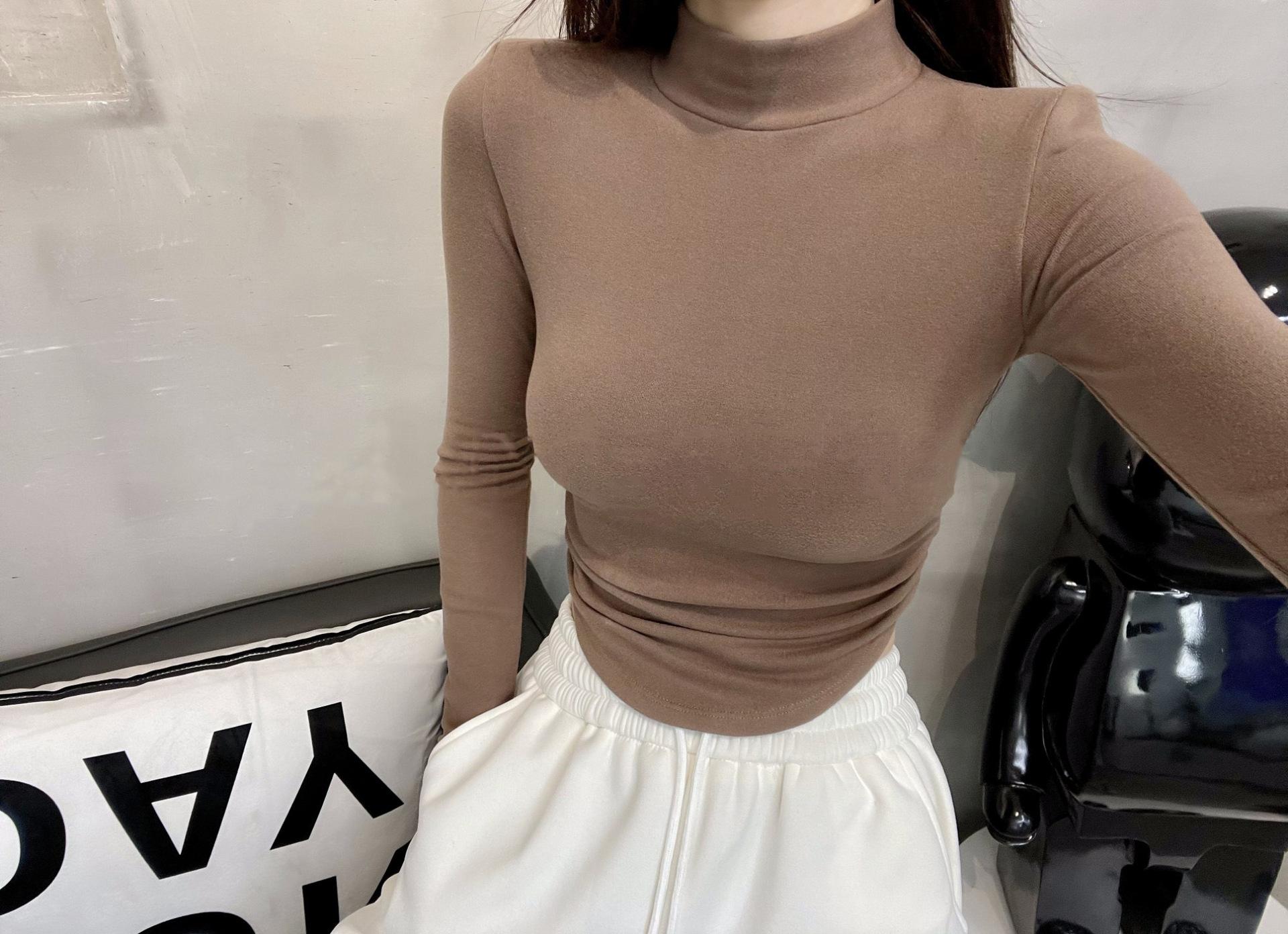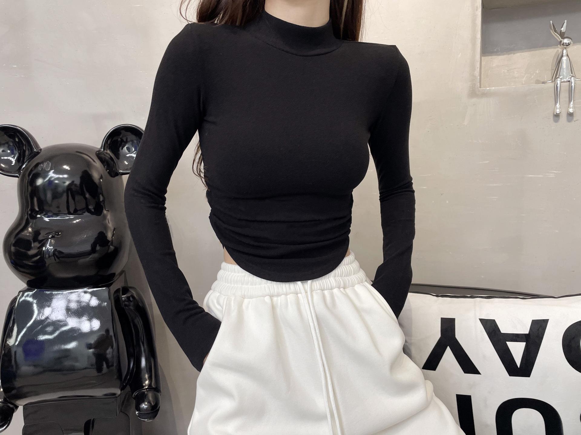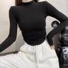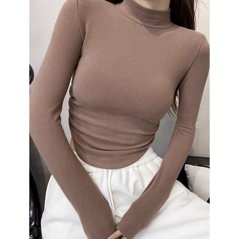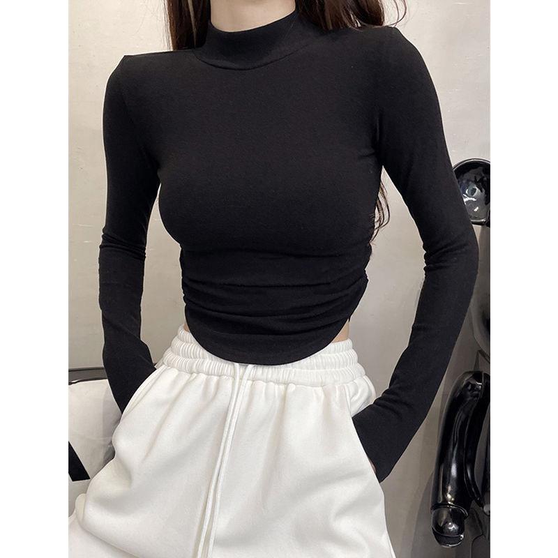 Camiseta de cuello alto medio para mujer, otoño e invierno, nuevo estilo coreano, dobladillo en forma de U, top de nicho, camiseta sexy de manga larga ajustada para chica