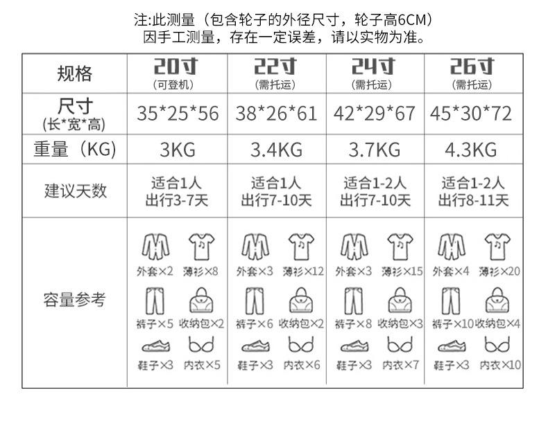 20inch [domestic boarding size], 22inch [suitable for short trips], 24inch [gold size], 26inch [suitable for l...