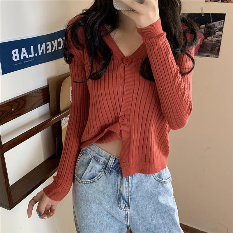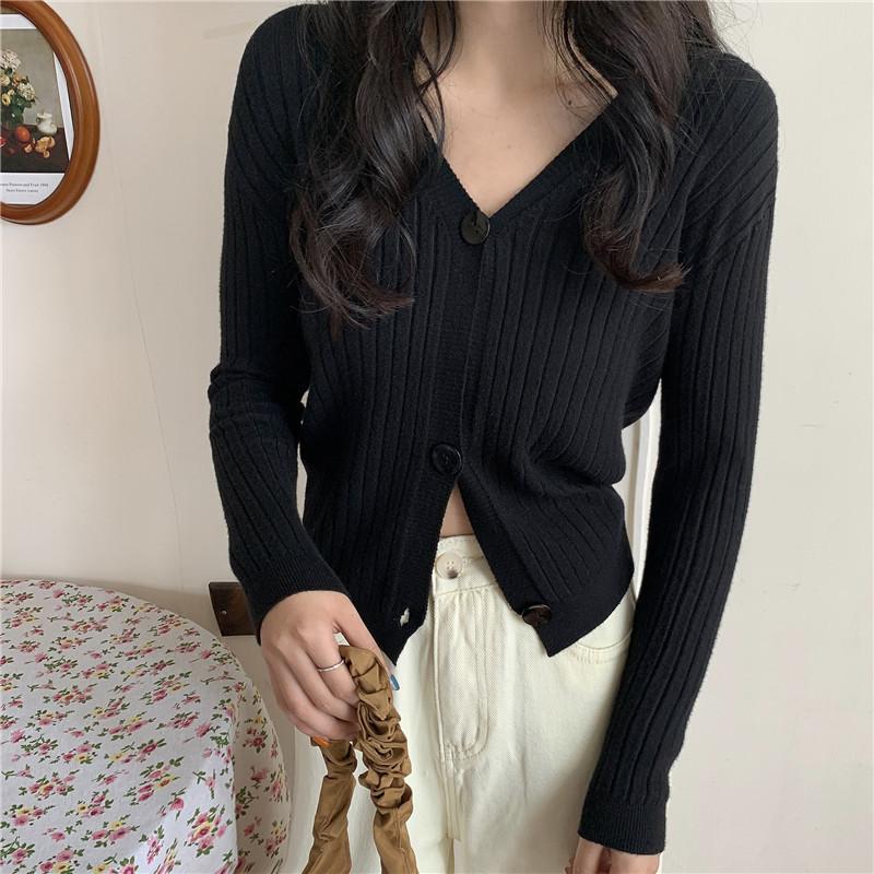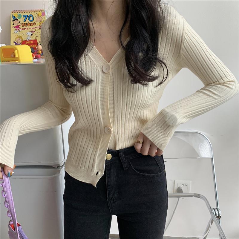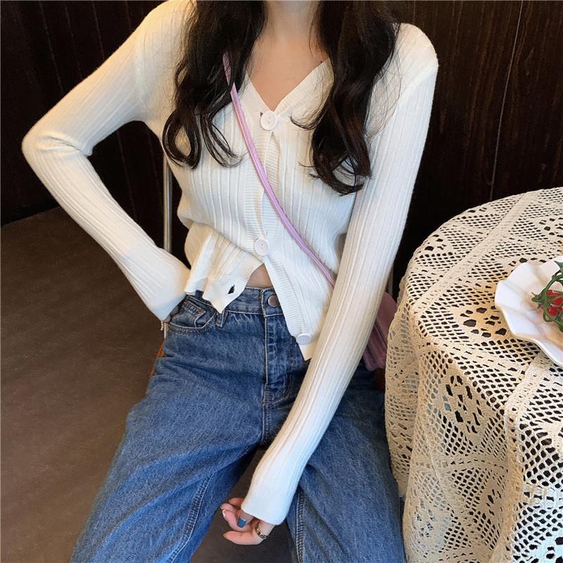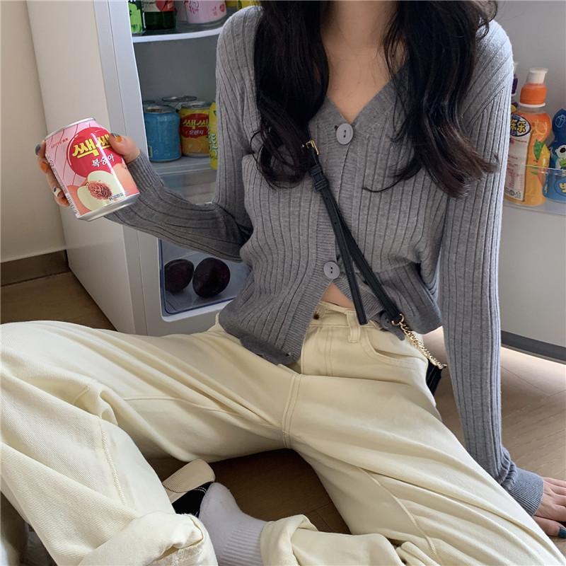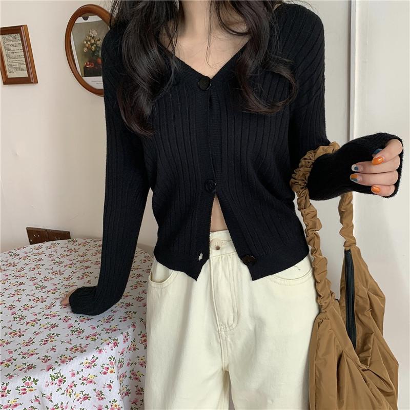 Chaqueta tipo cárdigan de manga larga para mujer, estilo coreano, elegante, con escote en V y clavícula, holgada, combinable con todo, de punto corto