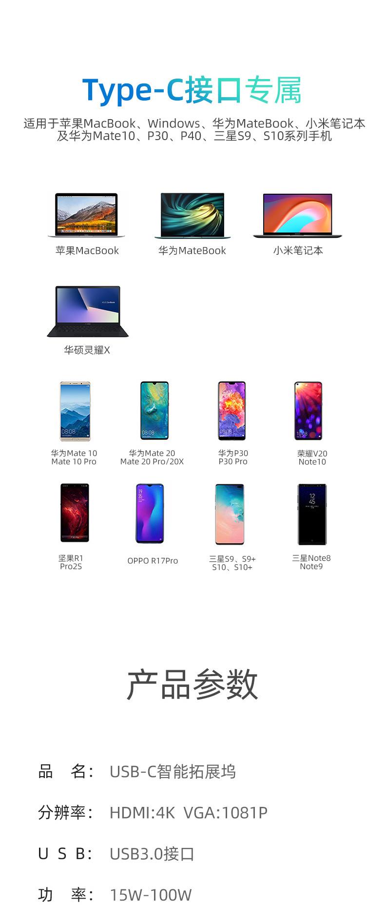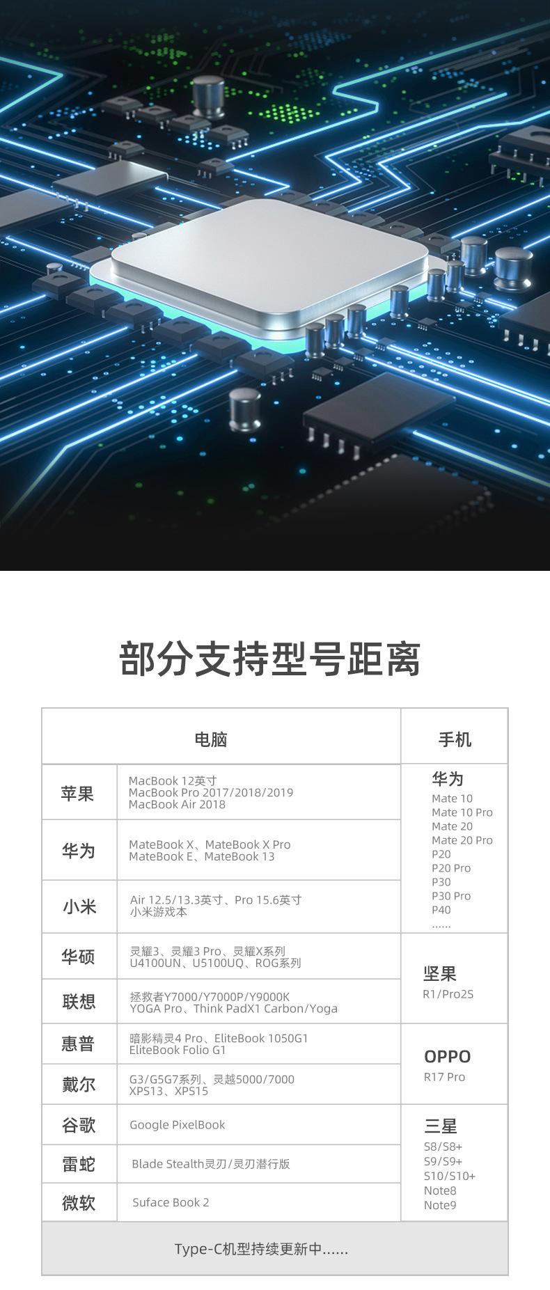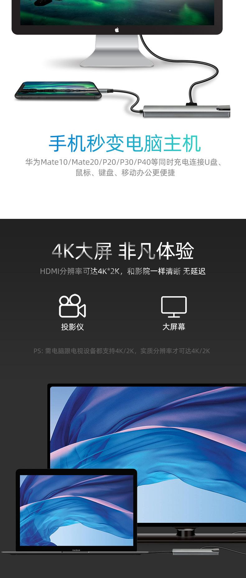 HDMI: 4K 30HZ, compatible con versiones anteriores de 1080P, 720P, etc.USB: soporta hasta 480MCarga PD: Soporta carga rápida de hasta 87W