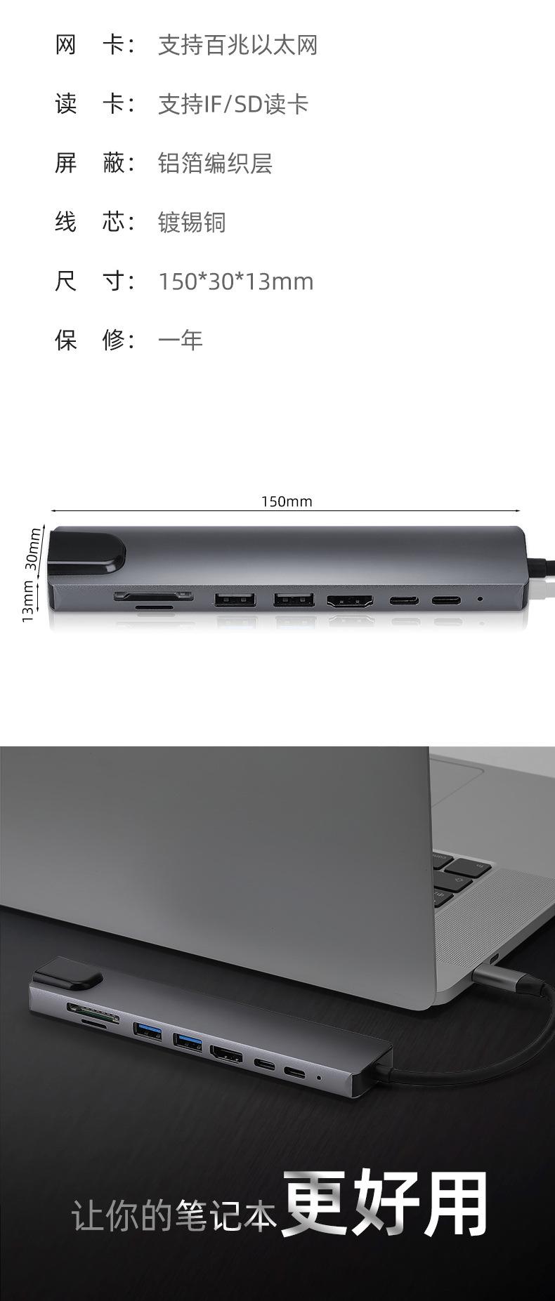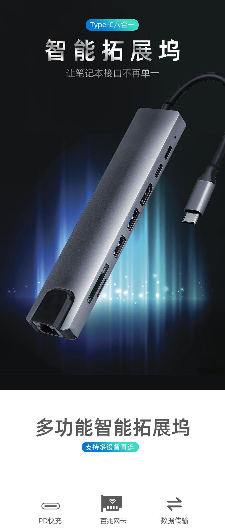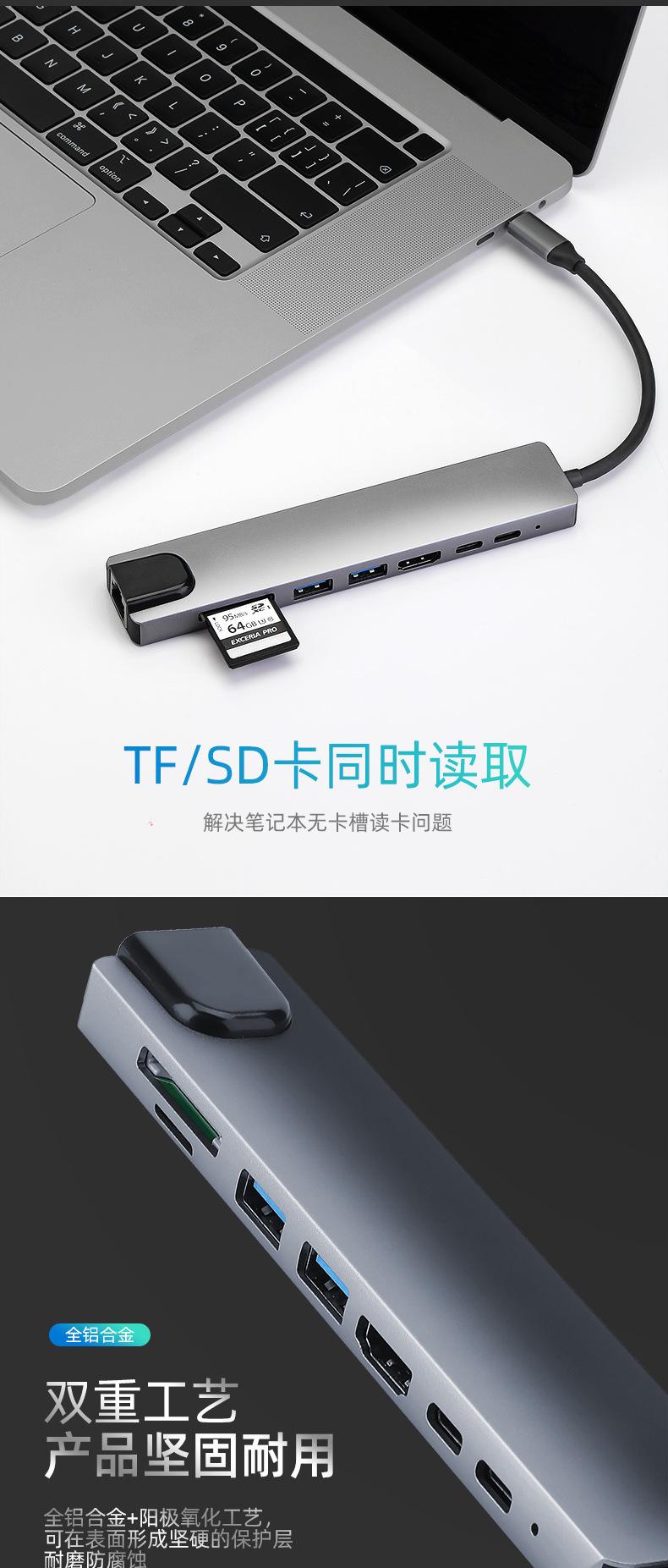 Nombre del producto: Estación de acoplamiento tipo C a PD + USB 3.0*2 + SD + TF + HDMI + RJ45 + tipo C (8 en 1)