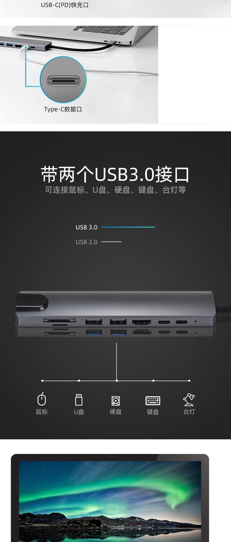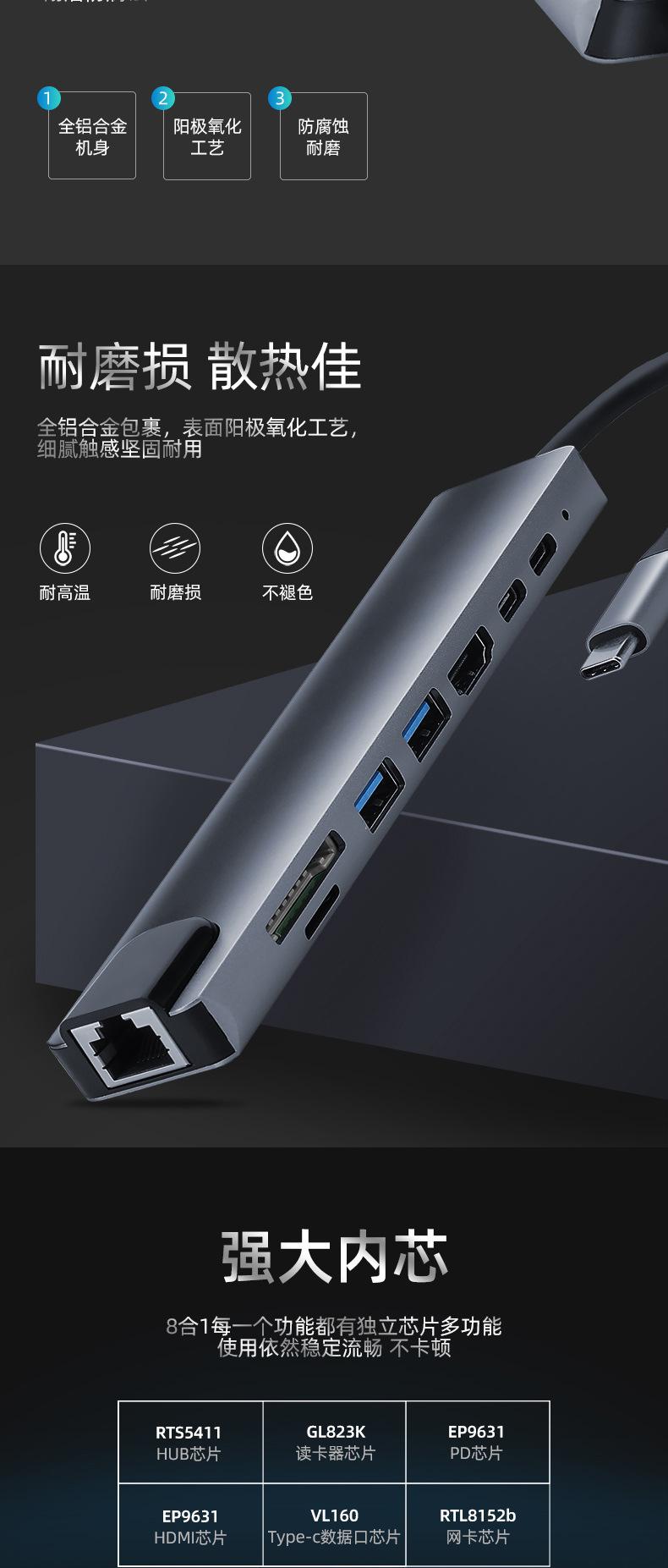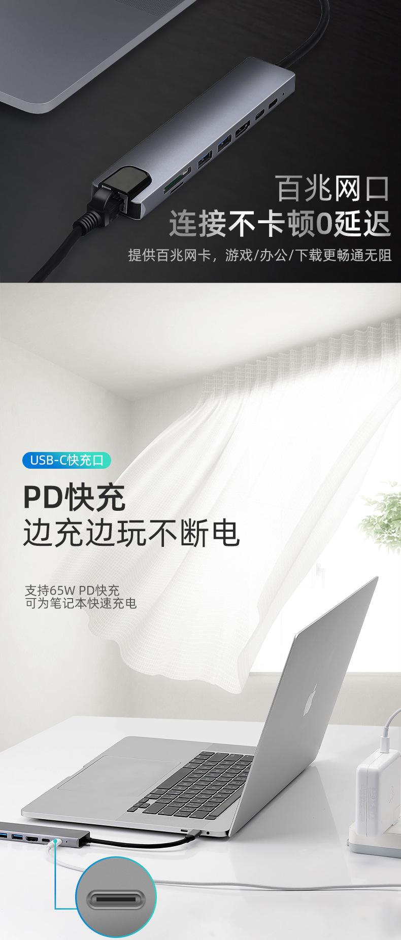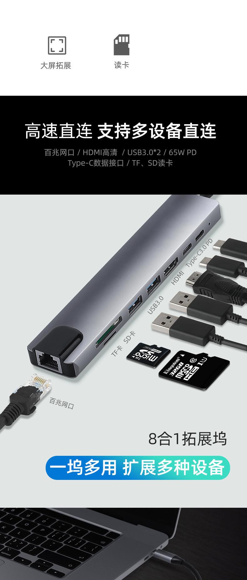 Nombre del producto: Estación de acoplamiento tipo C a PD + USB 3.0*2 + SD + TF + HDMI + RJ45 + tipo C (8 en 1)