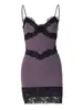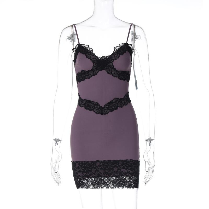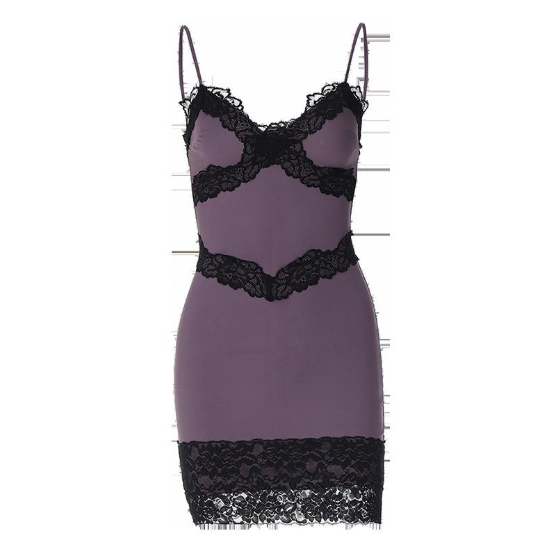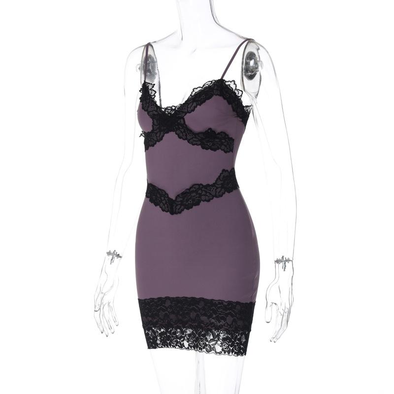 Vestido corto ajustado con escote en V, estilo europeo y americano, con borde de encaje y costuras, estilo europeo y americano, de comercio exterior
