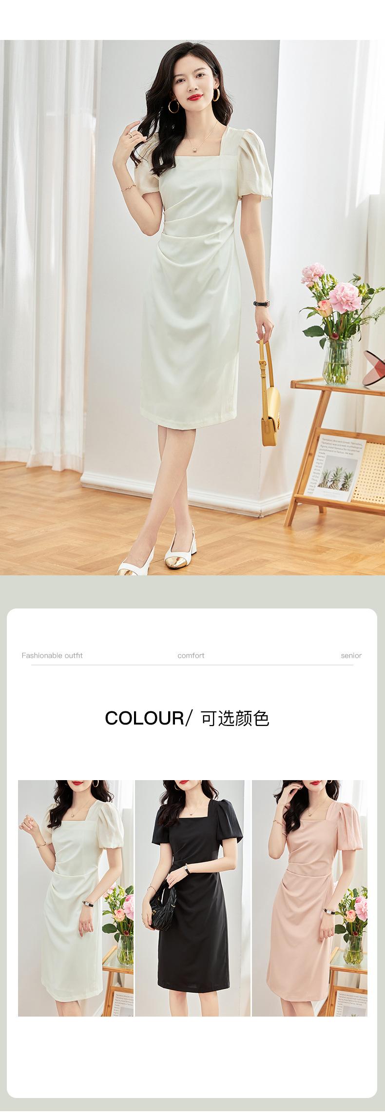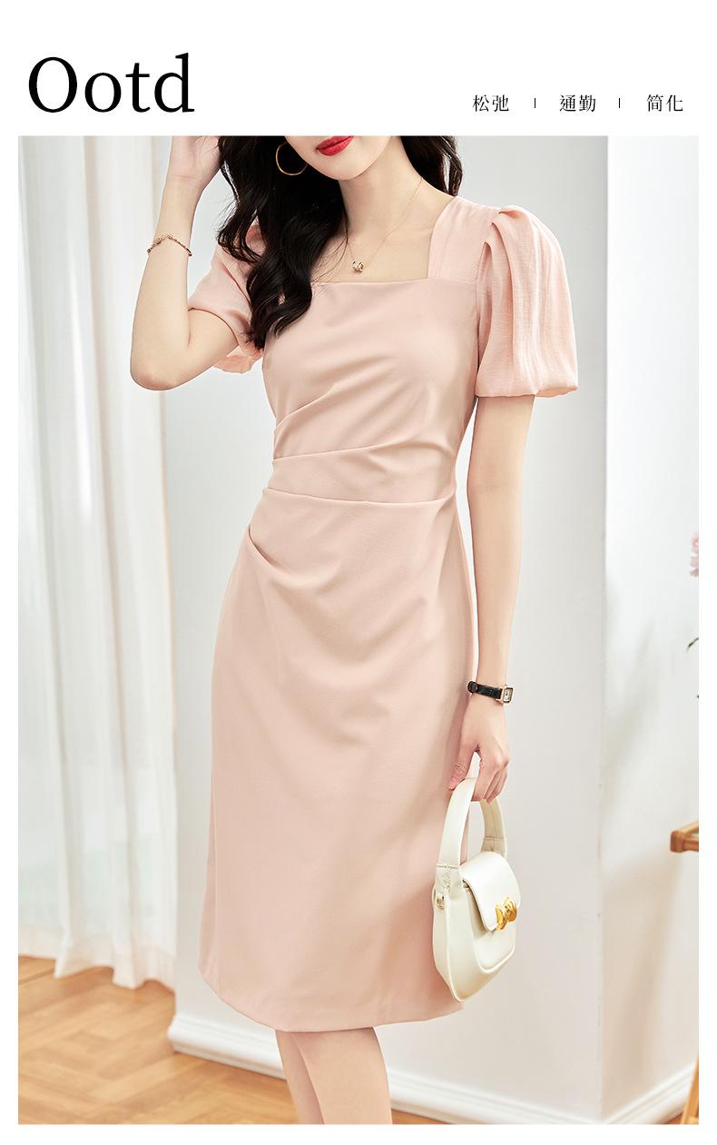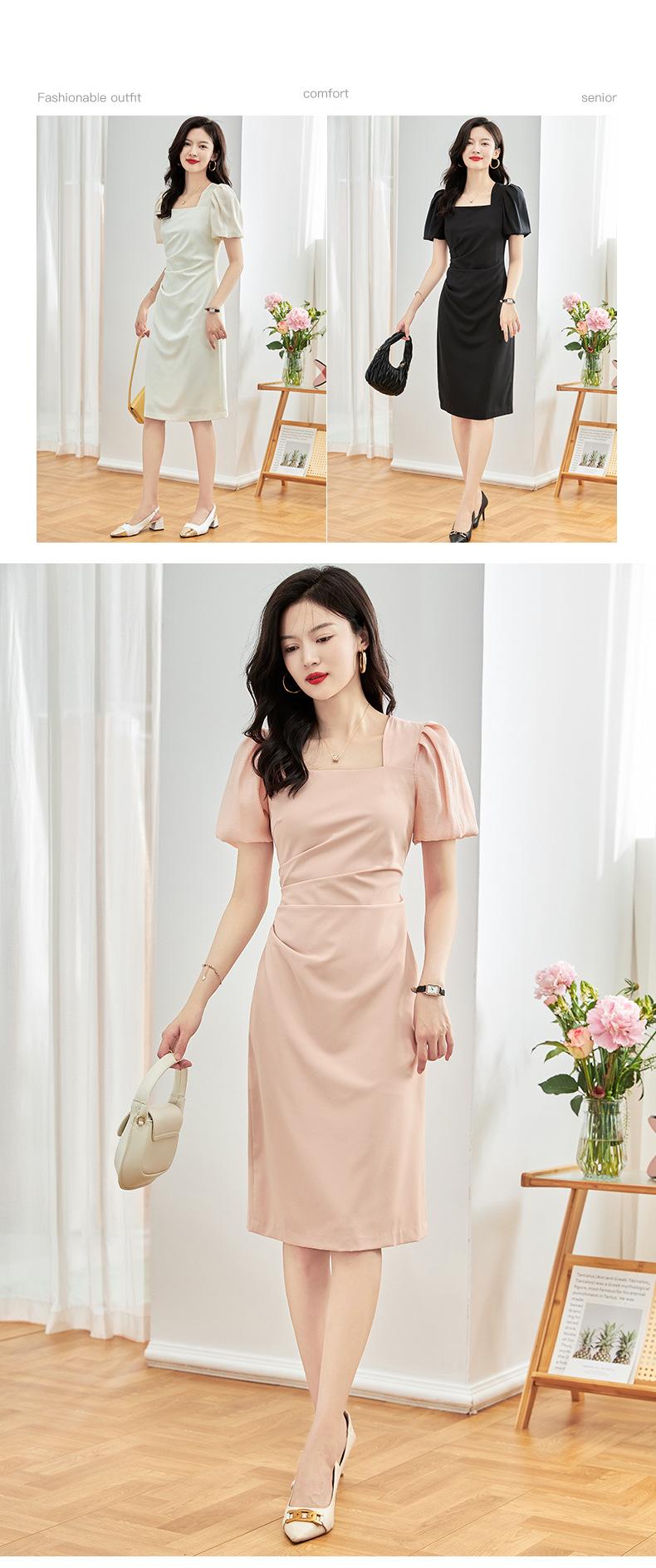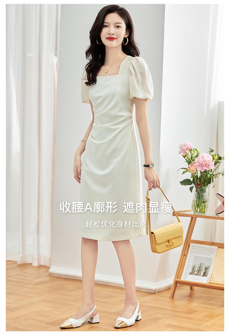 2311106-Vestido elegante de verano francés, adelgazante, con escote cuadrado, mangas abullonadas y cintura plisada.