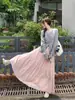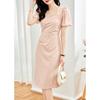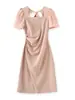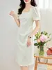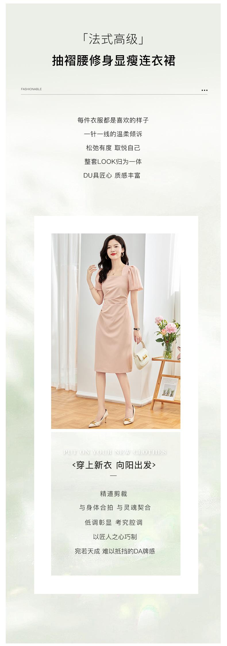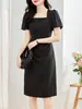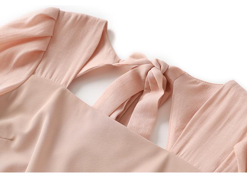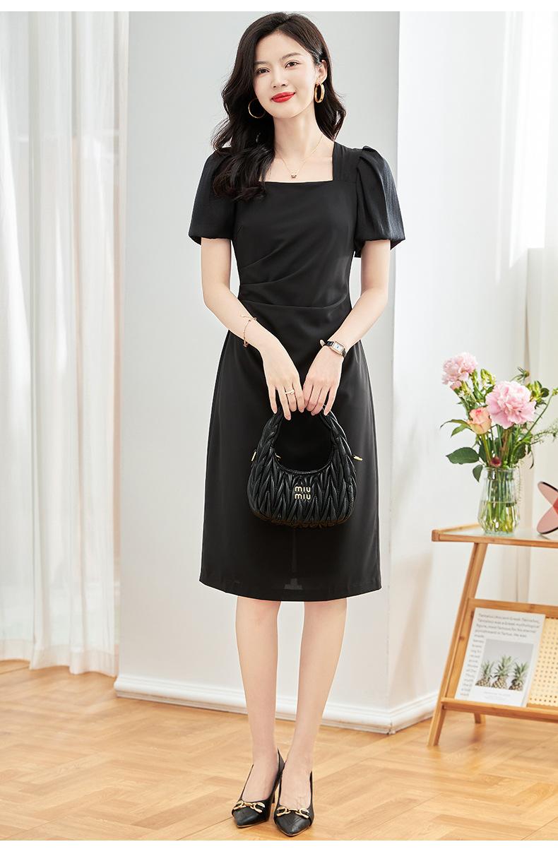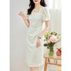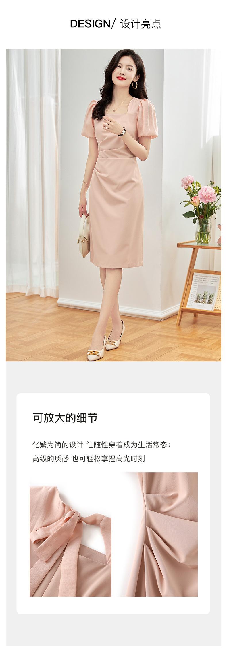 2311106-Vestido elegante de verano francés, adelgazante, con escote cuadrado, mangas abullonadas y cintura plisada.