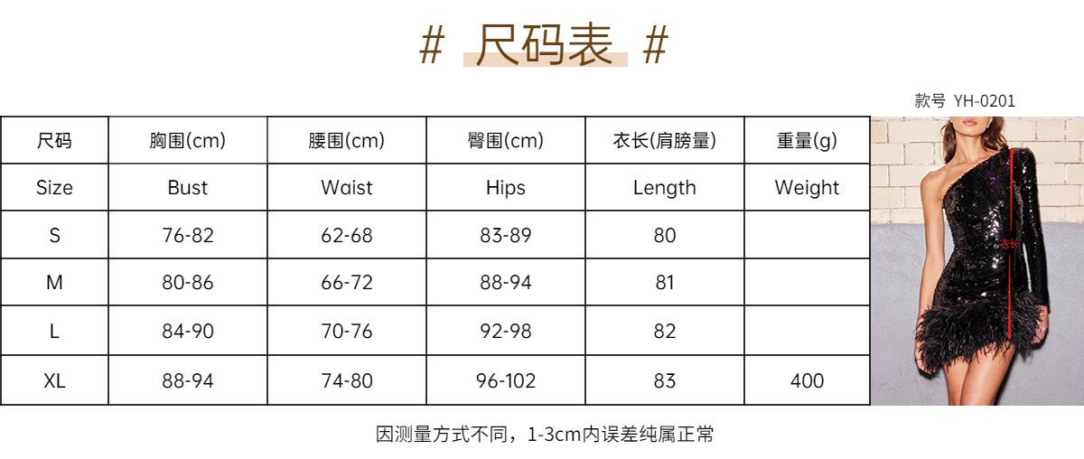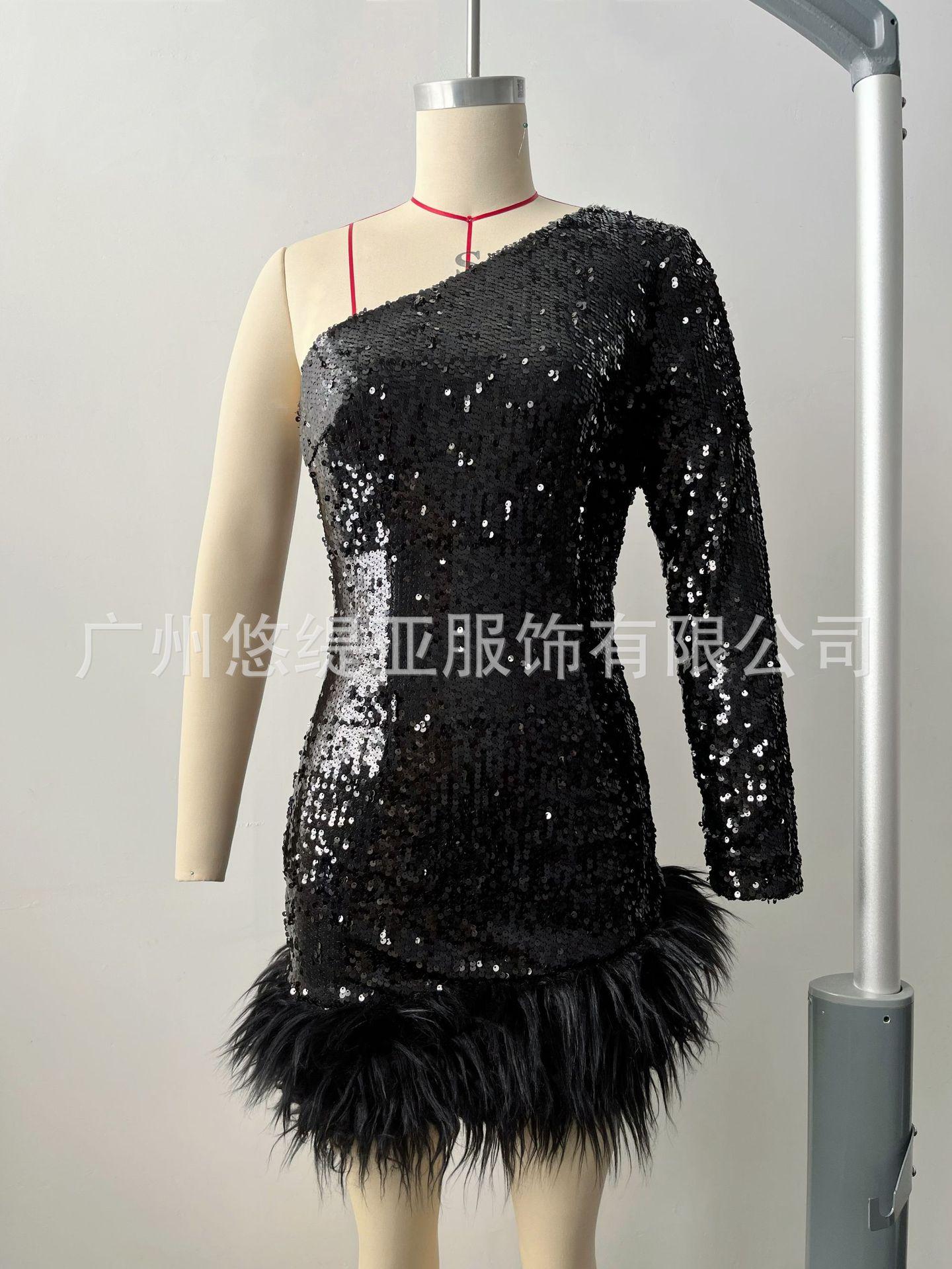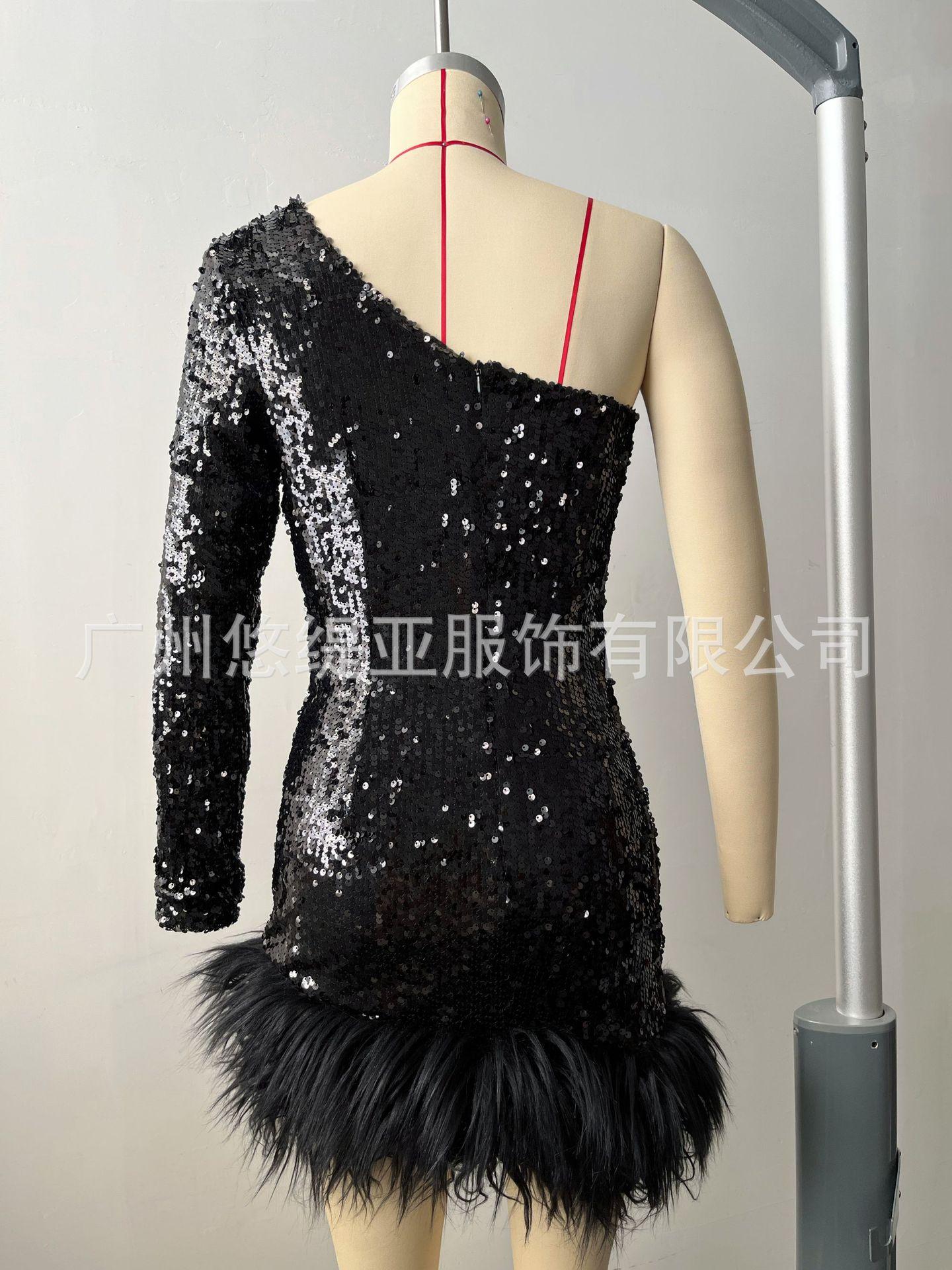 Vestido sexy de otoño con falda corta y cintura irregular, estilo europeo y americano, con un hombro al descubierto, manga larga y lentejuelas y plumas