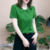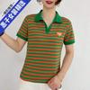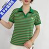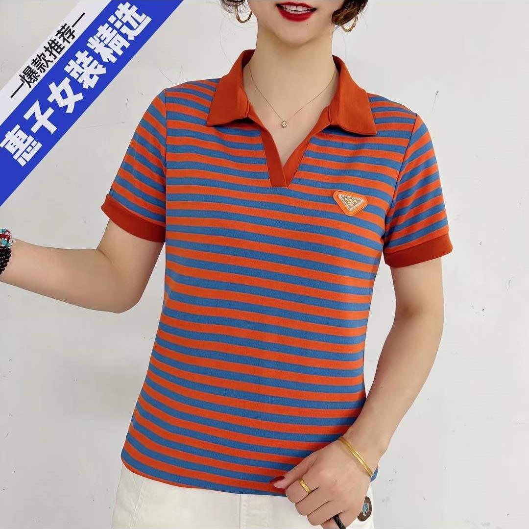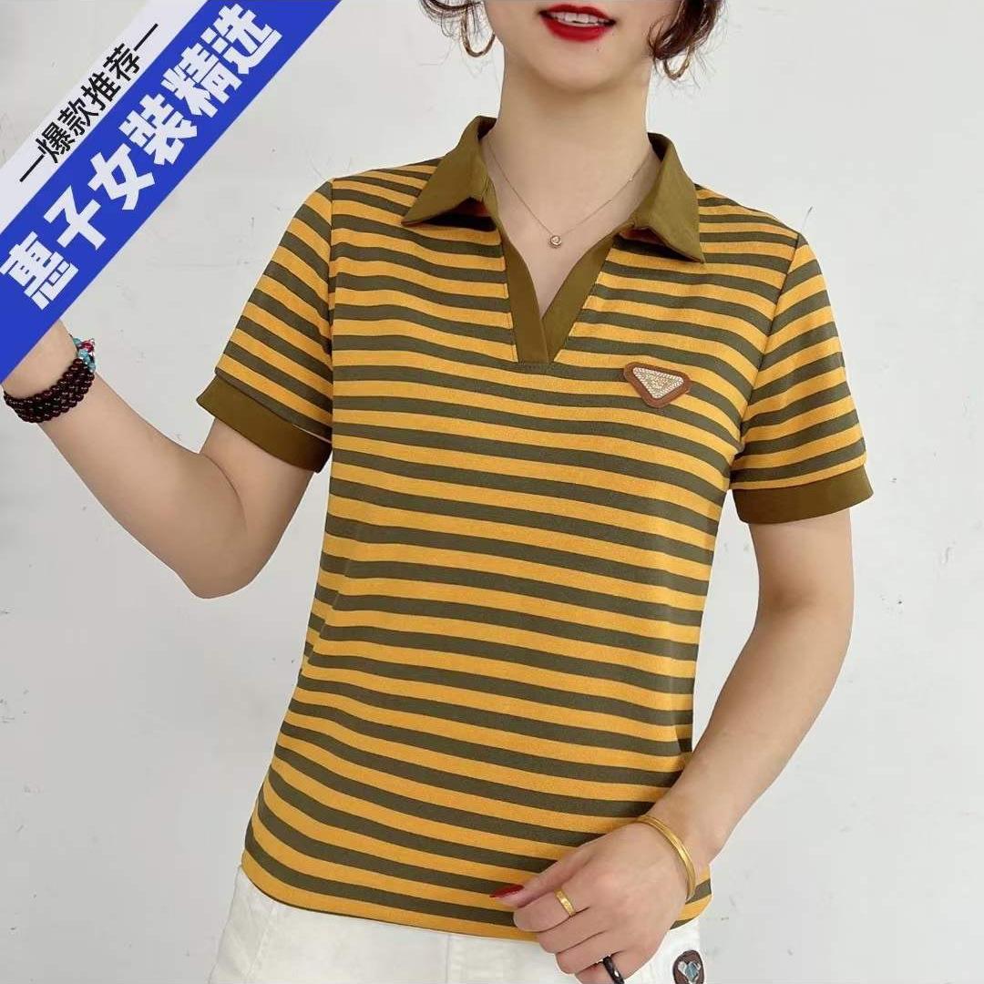 Camiseta de manga corta de verano 2024, nueva camiseta informal de solapa para mujer, camisa pequeña que combina con todo, top de mamá a rayas que adelgaza la carne para mujer