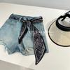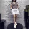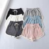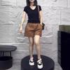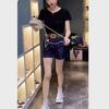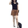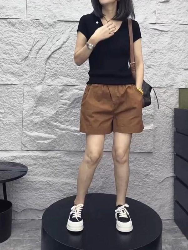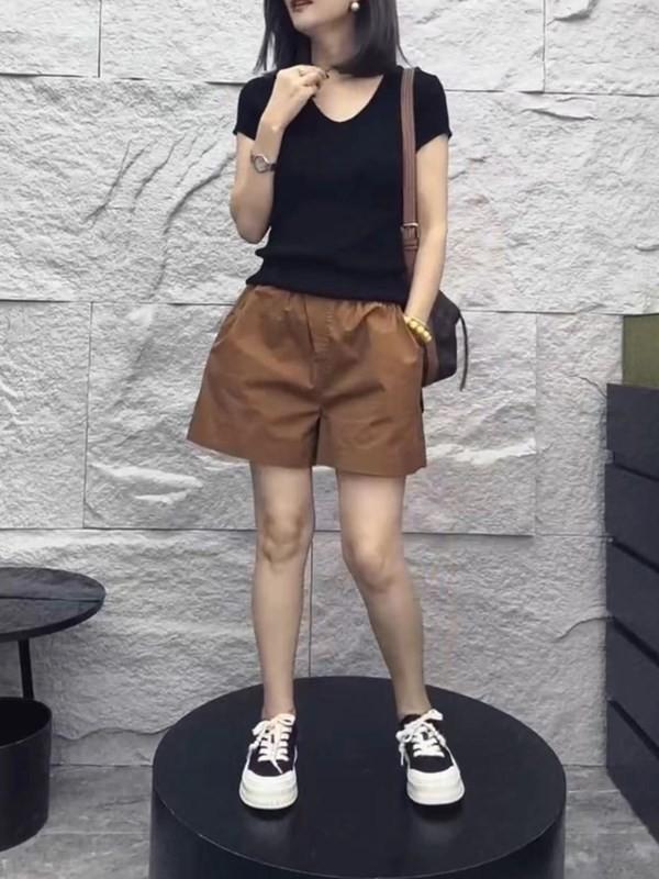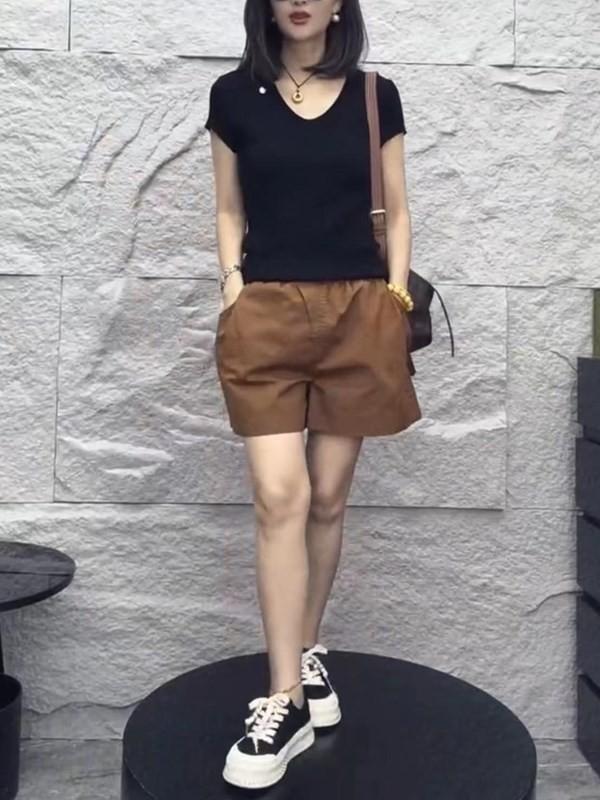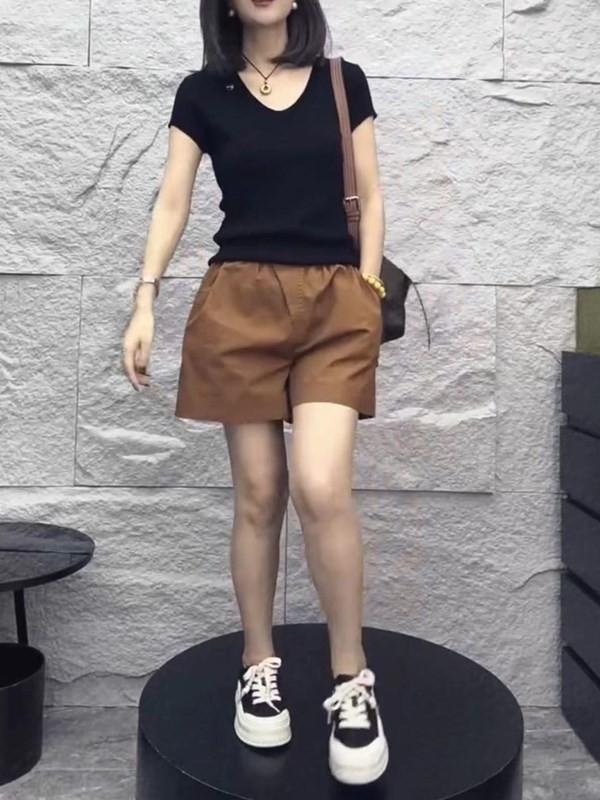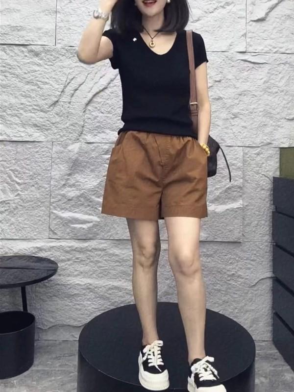 24223 Love Meiyuan 2025 Verano Nuevo Estilo Camiseta Simple y a la Moda con Cuello en V Shorts de Cintura Alta y Pierna Ancha para un Look Adelgazante Mujer