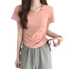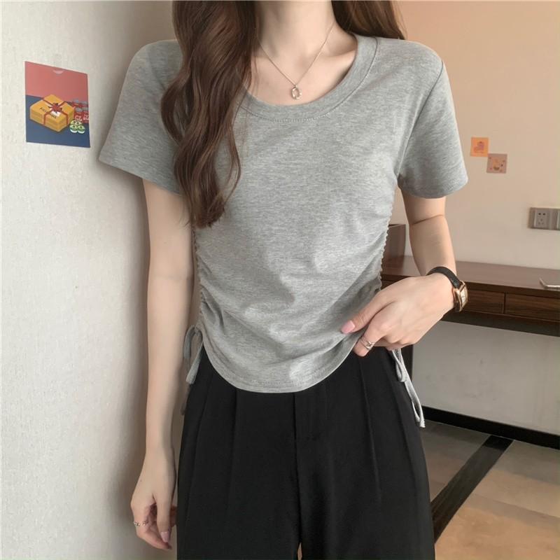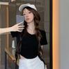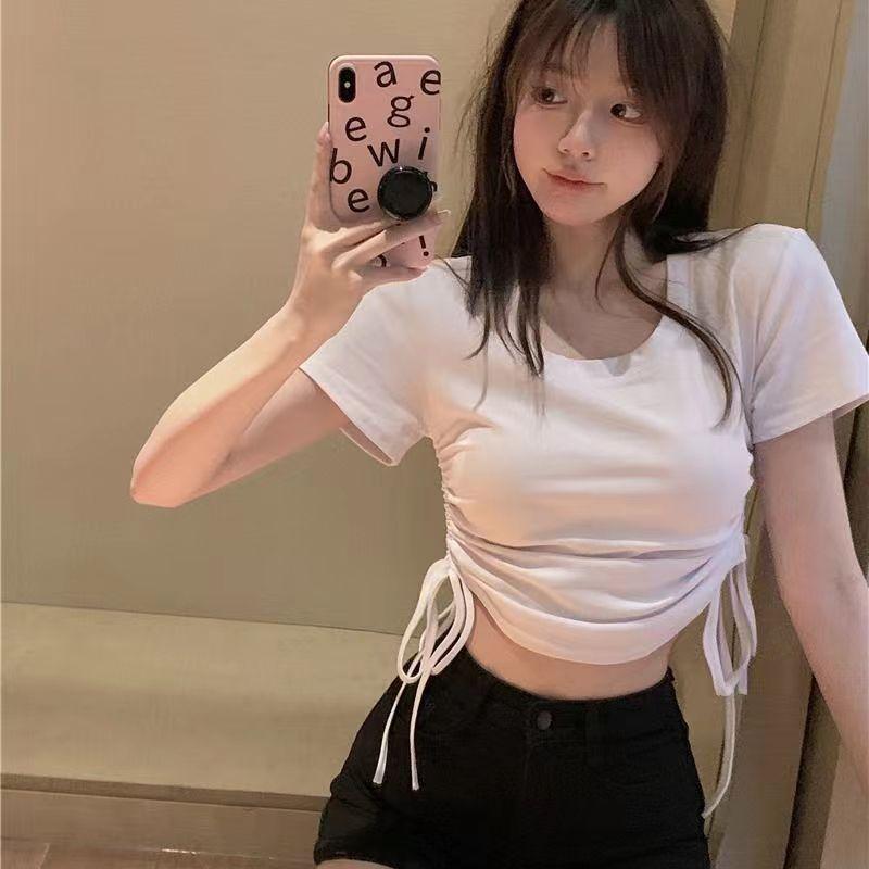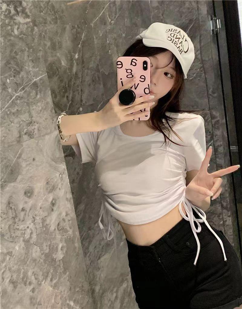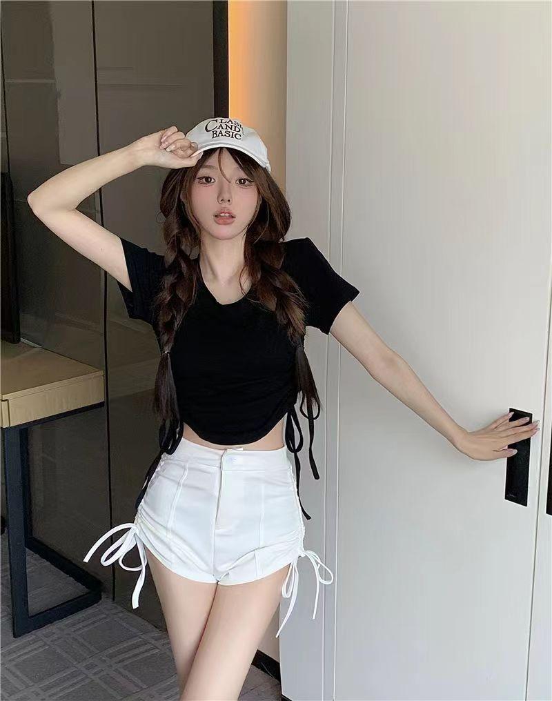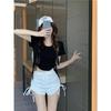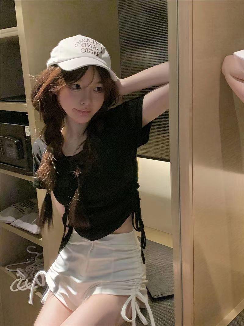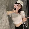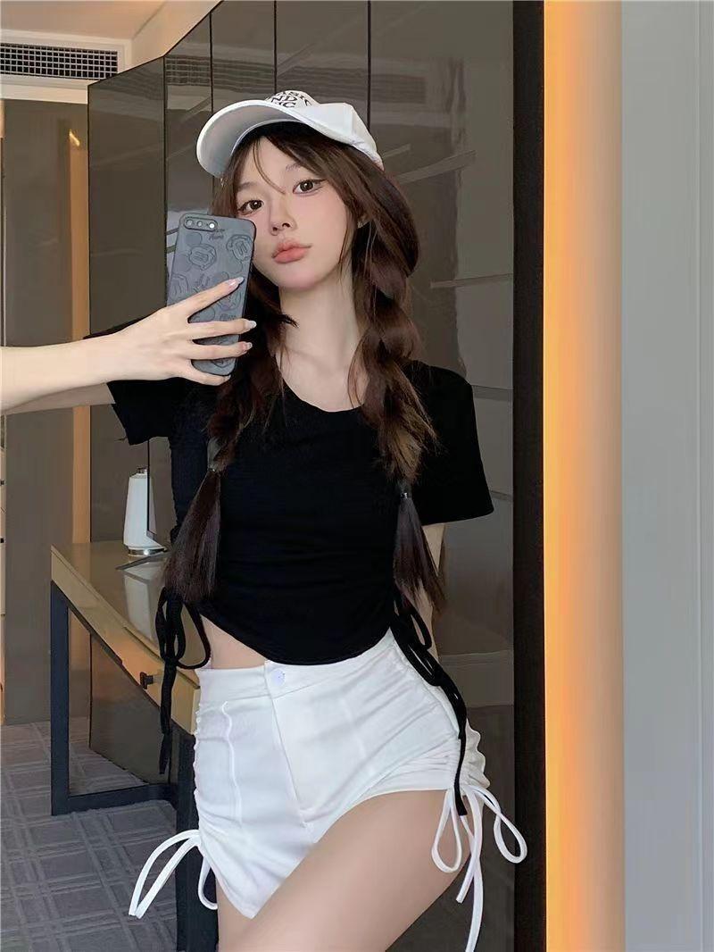 Elegante playera de manga corta para mujer, Verano 2025 Nuevo estilo americano retro de puro deseo, Top sexy ajustado con cordón