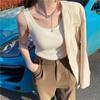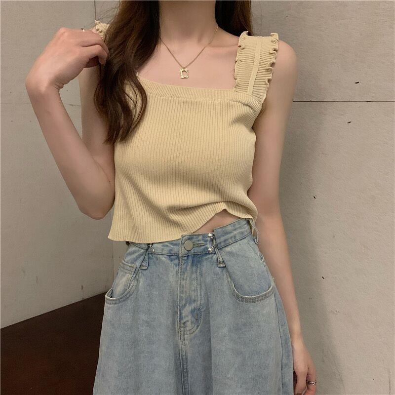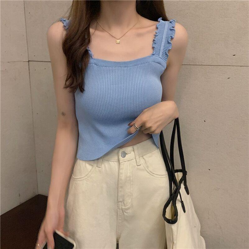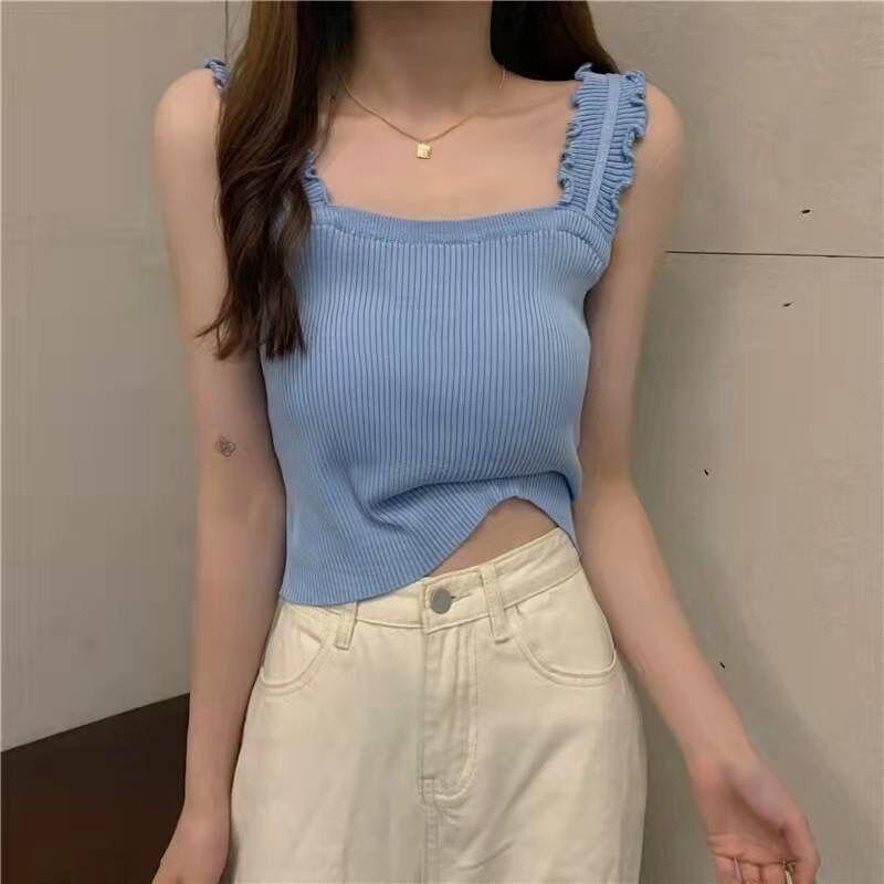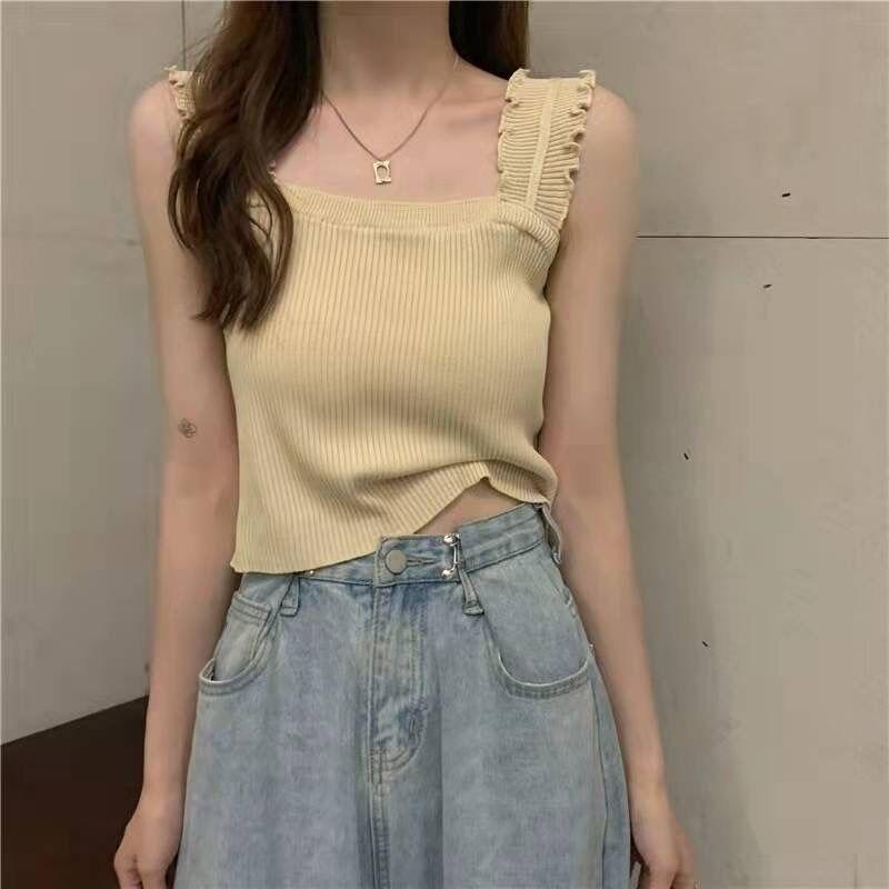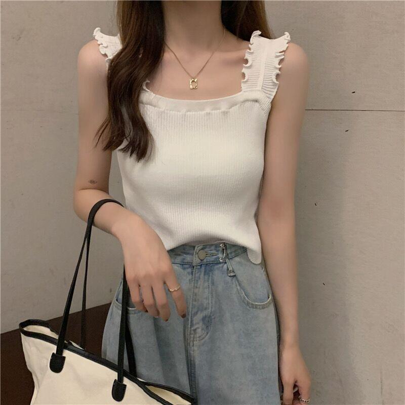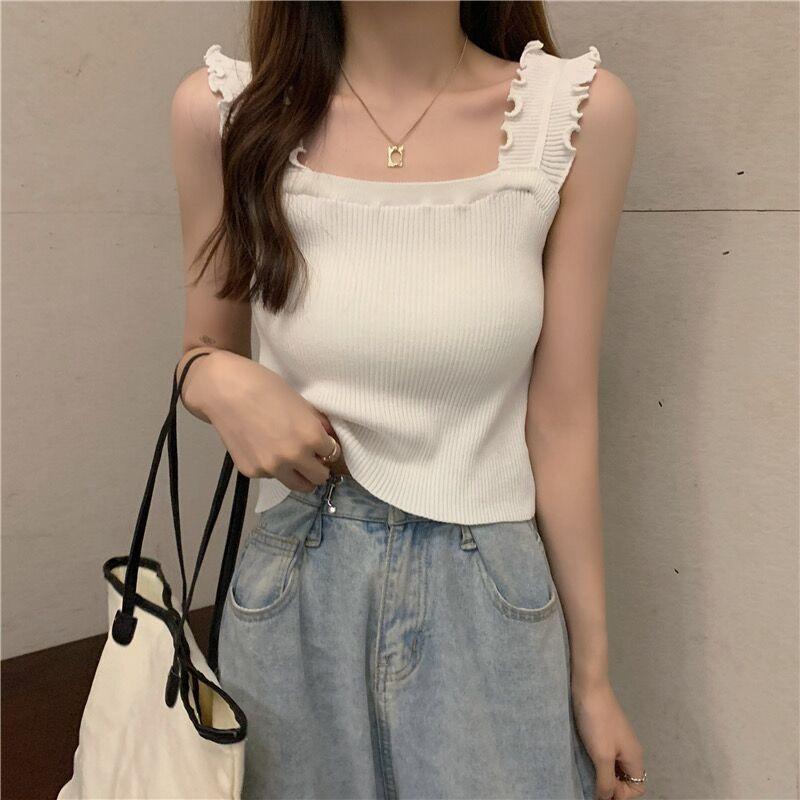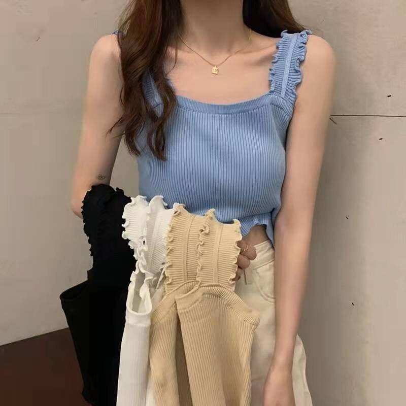 Malha Renda Camisole Verão Feminino Design Sense Nicho Base Camisa Cor Sólida All-match Basic Outer Wear Top